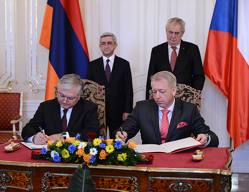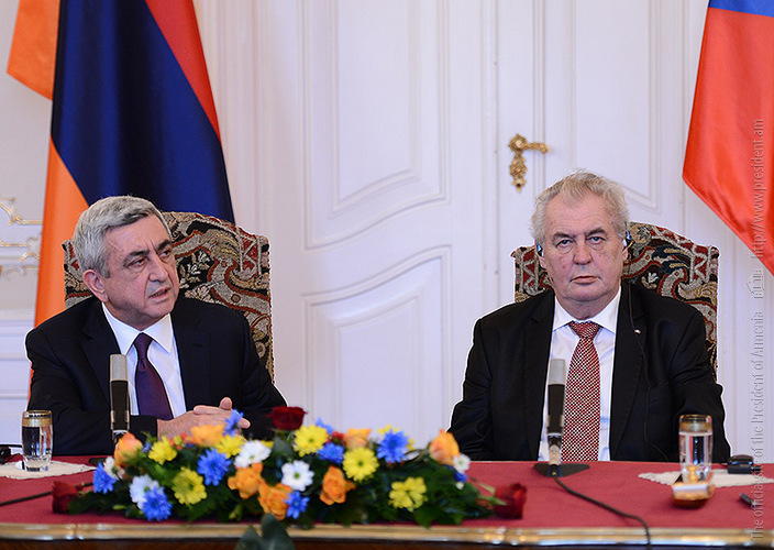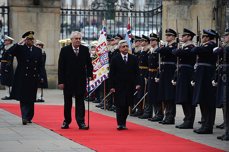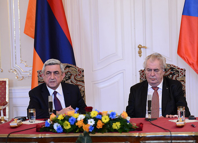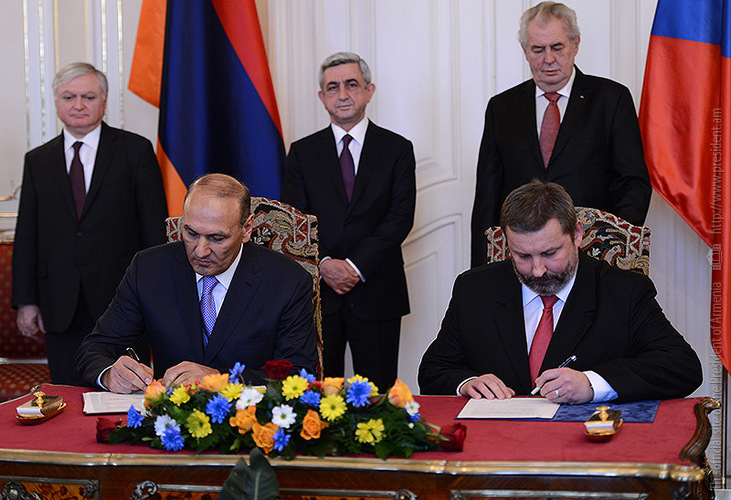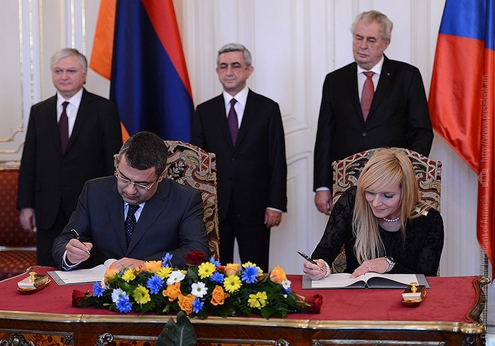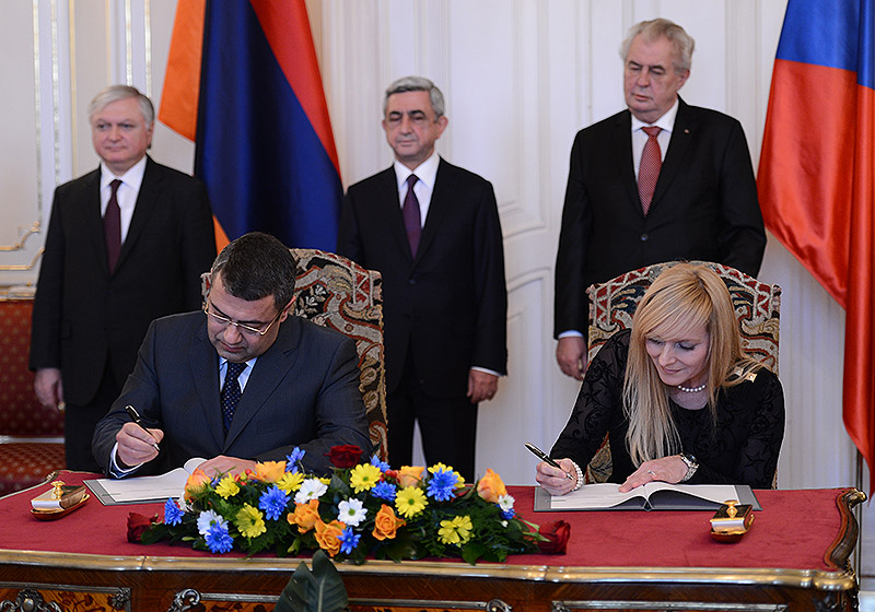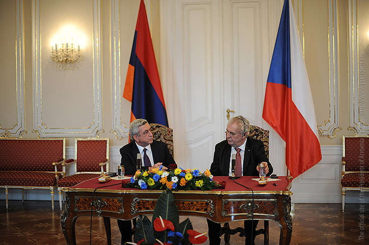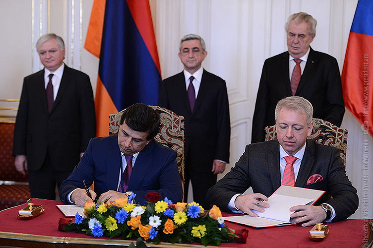 Պետական այցով Չեխիայի Հանրապետությունում գտնվող Նախագահ Սերժ Սարգսյանն այսօր հանդիպում է ունեցել Չեխիայի Նախագահ Միլոշ Զեմանի հետ: Երկու երկրների նախագահների բանակցությունների ավարտին տեղի է ունեցել մի շարք ոլորտներում համագործակցության զարգացմանն ու խորացմանն ուղղված երկկողմ փաստաթղթերի ստորագրման արարողություն: Մասնավորապես ստորագրվել՝ են Համաձայնագիր Հայաստանի Հանրապետության կառավարության և Չեխիայի Հանրապետության կառավարության միջև հանցավորության դեմ պայքարում համագործակցության վերաբերյալ, Համաձայնագիր Հայաստանի Հանրապետության կառավարության և Չեխիայի Հանրապետության կառավարության միջև տնտեսական և արդյունաբերական համագործակցության մասին, Համաձայնագիր Հայաստանի Հանրապետության առողջապահության նախարարության և Չեխիայի Հանրապետության առողջապահության նախարարության միջև առողջապահության և բժշկագիտության բնագավառում համագործակցության մասին, Փոխըմբռնման հուշագիր Հայաստանի Հանրապետության արտակարգ իրավիճակների նախարարության և Չեխիայի Հանրապետության ներքին գործերի նախարարության միջև աղետների կանխարգելման և դրանց հետևանքների վերացման, հրշեջ ծառայության և բնակչության պաշտպանության մասին, Համատեղ հռչակագիր Հայաստանի Հանրապետության բնապահպանության նախարարության և Չեխիայի Հանրապետության շրջակա միջավայրի նախարարության միջև բնապահպանության բնագավառում համագործակցության մասին, Փոխըմբռնման հուշագիր Հայաստանի Հանրապետության կառավարությանն առընթեր պետական եկամուտների կոմիտեի և Չեխիայի Հանրապետության մաքսային գլխավոր տնօրինության միջև համագործակցության մասին: