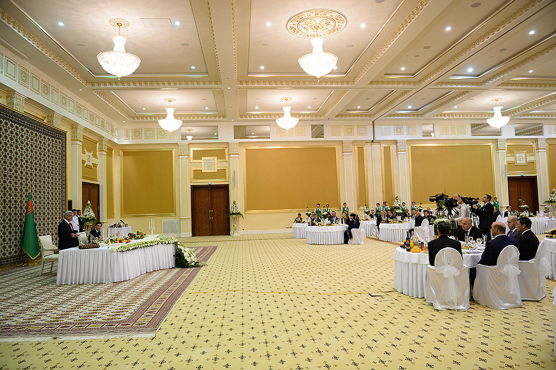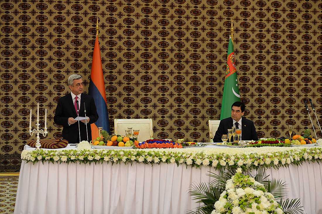 Նախագահներ Սերժ Սարգսյանը և Գուրբանգուլի Բերդիմուհամեդովը փոխադարձ բաժակաճառերում անդրադարձել են հայ և թուրքմեն ժողովուրդների դարավոր բարեկամությանն ու պատմական անցյալին, երկու երկրների հարաբերությունների ներկայիս բարձր մակարդակին և այդ հարաբերությունների շարունակական խորացման ու փոխշահավետ համագործակցության զարգացման հնարավորություններին: