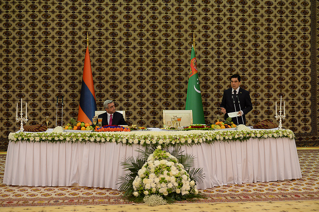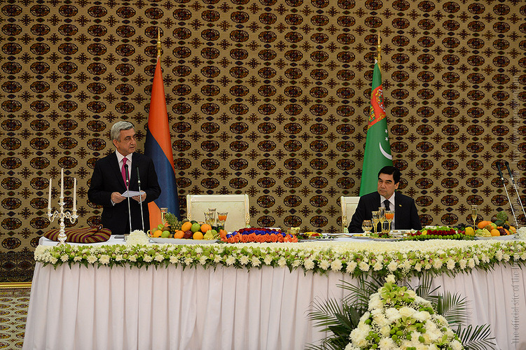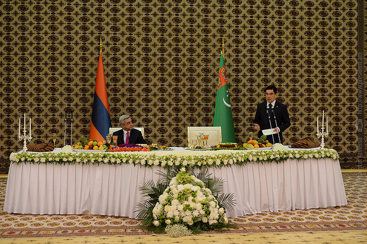Նախագահ Սերժ Սարգսյանն առաջարկել է բաժակ բարձրացնել Թուրքմենստանի Նախագահ Գուրբանգուլի Բերդիմուհամեդովի, Հայաստանի և Թուրքմենստանի միջև բարեկամության և համագործակցության հետագա ամրապնդման ու երկու երկրների ժողովուրդների խաղաղության և բարեկեցության համար: