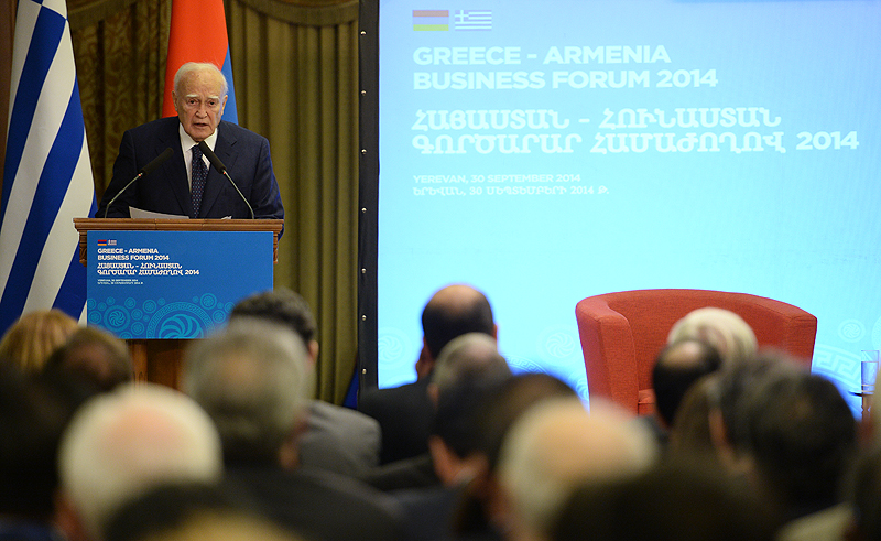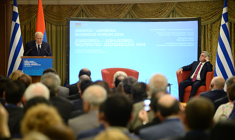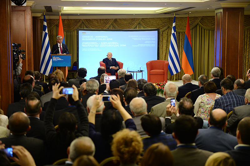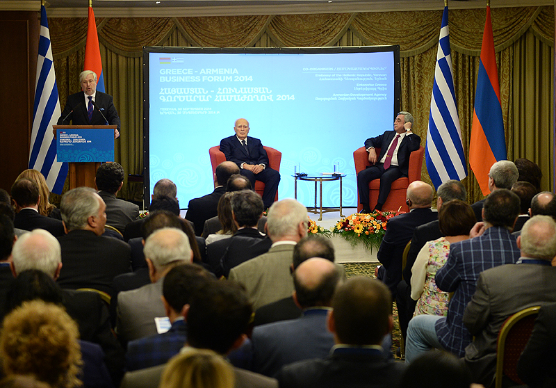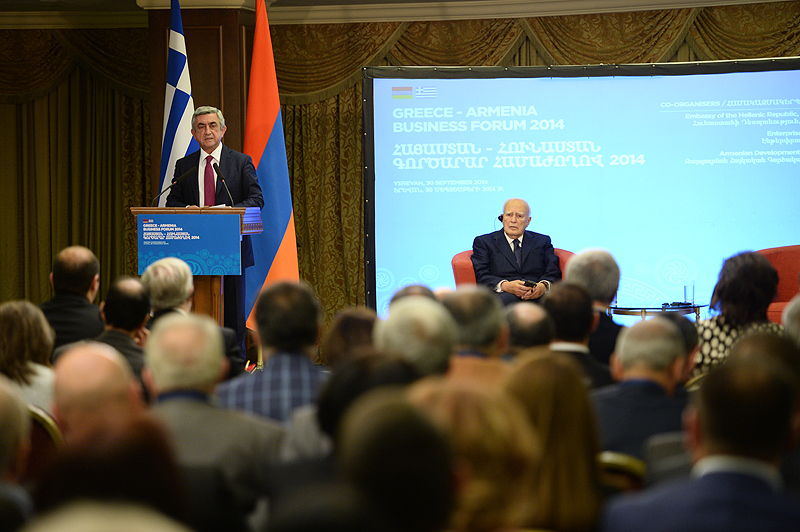 Ուրախ եմ ողջունել ձեզ հայ-հունական գործարար համաժողովի շրջանակներում: Նախագահ Պապուլիասի հետ մենք այսօր շատ ենք խոսել տնտեսական ոլորտում փոխգործակցության խորացման մասին և այն մասին, թե ինչպիսի հնարավորություններ կան: Մեր խորին համոզմունքն է, որ մեր տնտեսական հարաբերությունները շատ են զիջում մեր քաղաքական և բարեկամական հարաբերություններին, և մեր խնդիրն է տնտեսական հարաբերությունները բերել-հասցնել մեր քաղաքական հարաբերություններին: