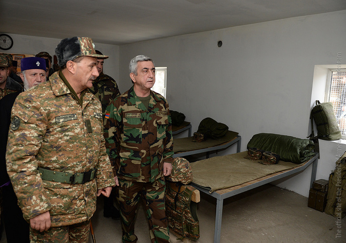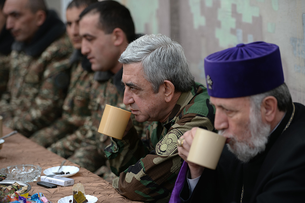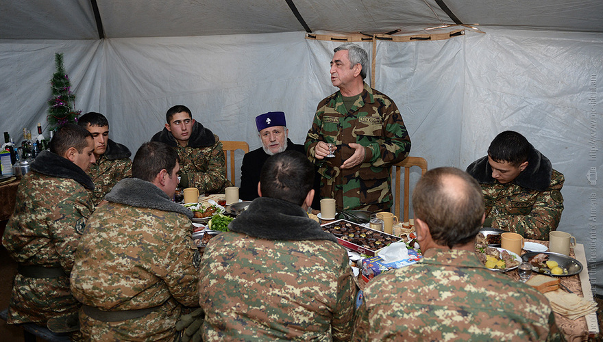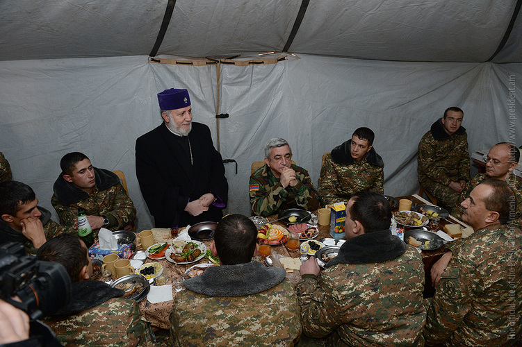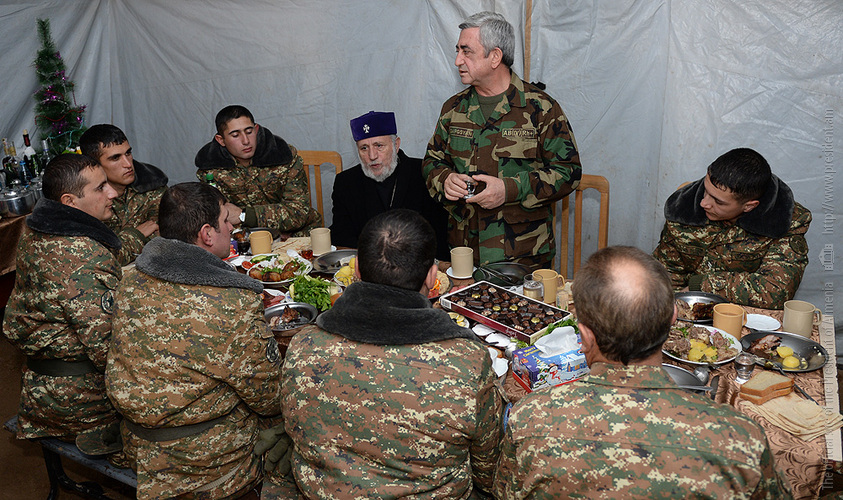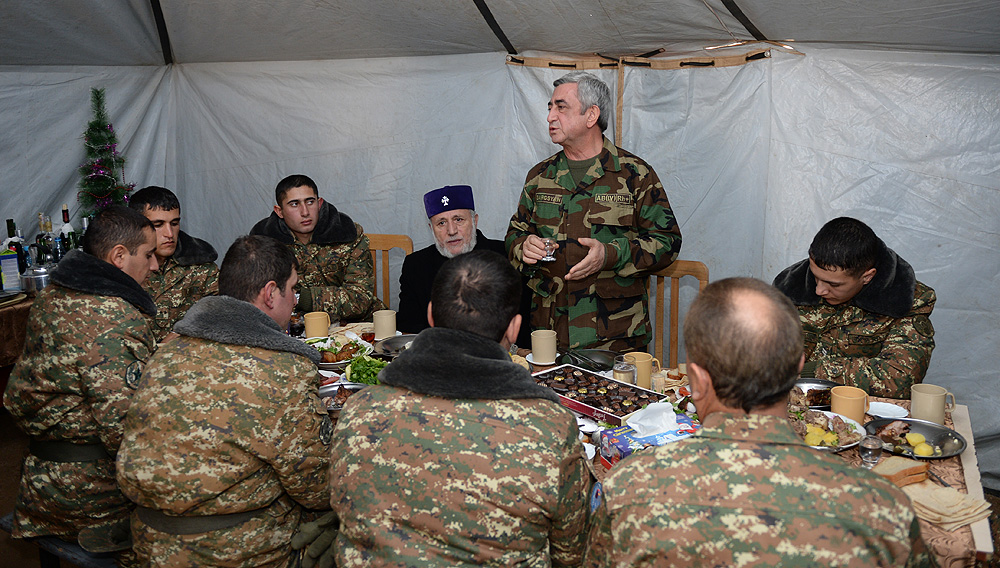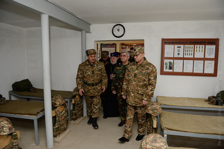 Հայաստանի Հանրապետության Նախագահ, Հայաստանի զինված ուժերի գերագույն գլխավոր հրամանատար Սերժ Սարգսյանն Ամանորի և Սուրբ Ծննդյան տոների կապակցությամբ, Ամենայն Հայոց Կաթողիկոս Գարեգին Երկրորդի, ՀՀ պաշտպանության նախարար Սեյրան Օհանյանի հետ այսօր այցելել է հանրապետության հարավ-արևմտյան հատվածի սահմանագիծը պահող պաշտպանական տեղամասերից մեկը: Նախագահը հանդիպել է մարտական դիրքում ծառայությունն անցկացնող զինվորների և հրամանատարների հետ, շրջայց կատարել մարտական հենակետում և ծանոթացել ծառայության անցկացման, ինչպես նաև զինվորների կենցաղային պայմաններին: