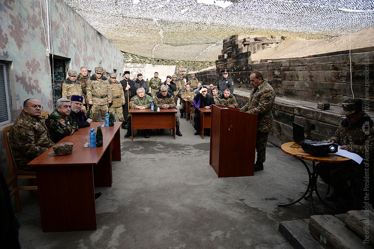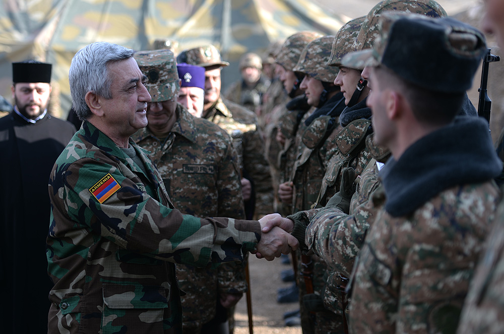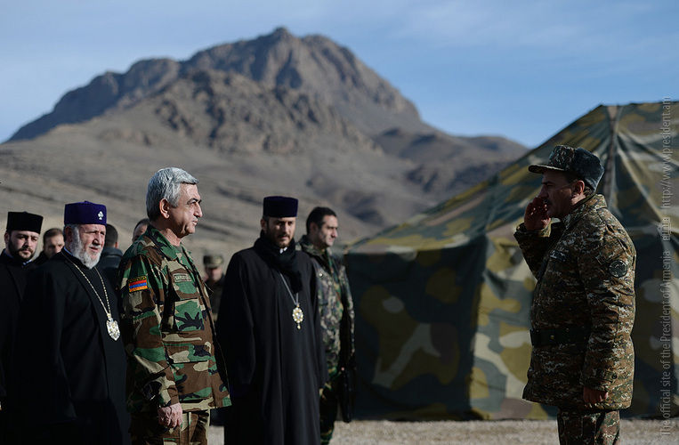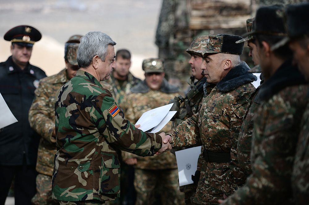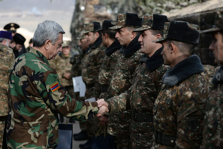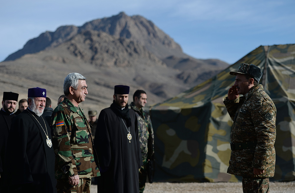 Հայաստանի Հանրապետության Նախագահ, Հայաստանի զինված ուժերի գերագույն գլխավոր հրամանատար Սերժ Սարգսյանն Ամանորի և Սուրբ Ծննդյան տոների կապակցությամբ, Ամենայն Հայոց Կաթողիկոս Գարեգին Երկրորդի, ՀՀ պաշտպանության նախարար Սեյրան Օհանյանի հետ այսօր այցելել է հանրապետության հարավ-արևմտյան հատվածի սահմանագիծը պահող պաշտպանական տեղամասերից մեկը: Նախագահը հանդիպել է մարտական դիրքում ծառայությունն անցկացնող զինվորների և հրամանատարների հետ, շրջայց կատարել մարտական հենակետում և ծանոթացել ծառայության անցկացման, ինչպես նաև զինվորների կենցաղային պայմաններին:
