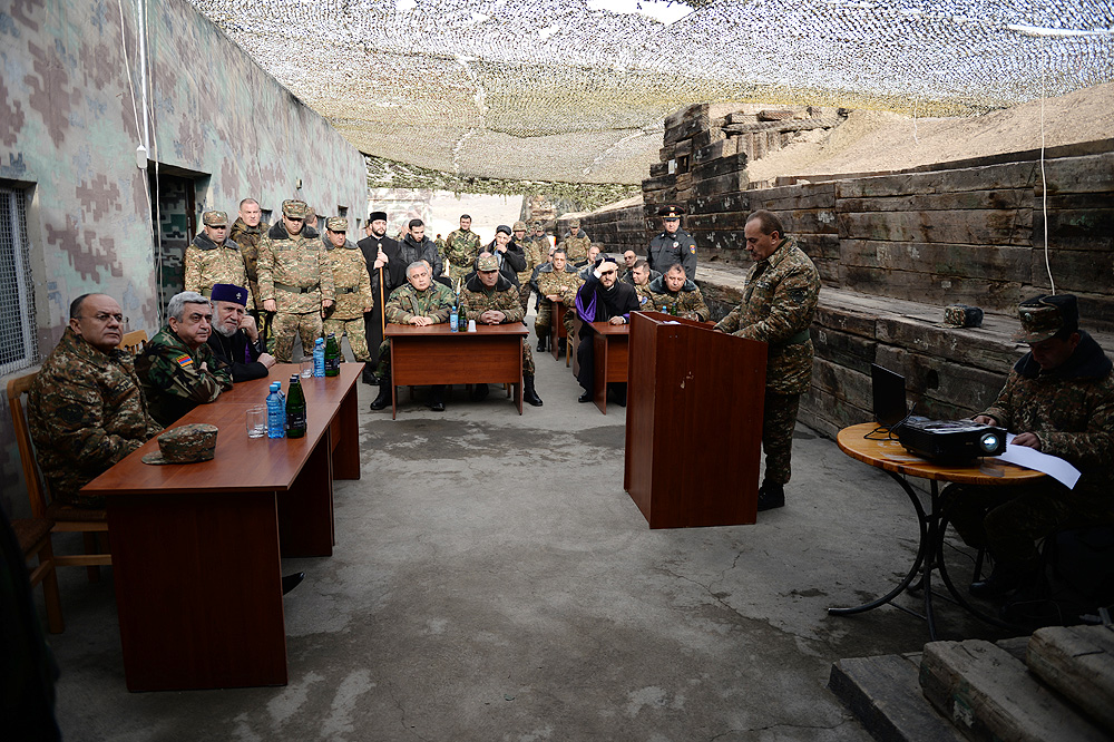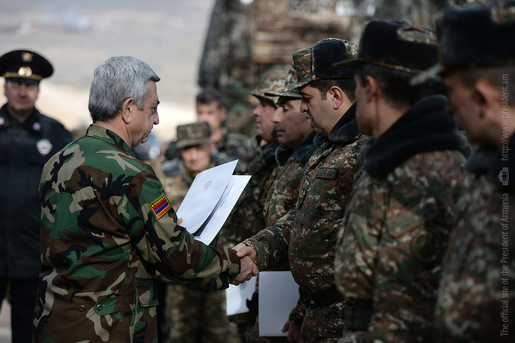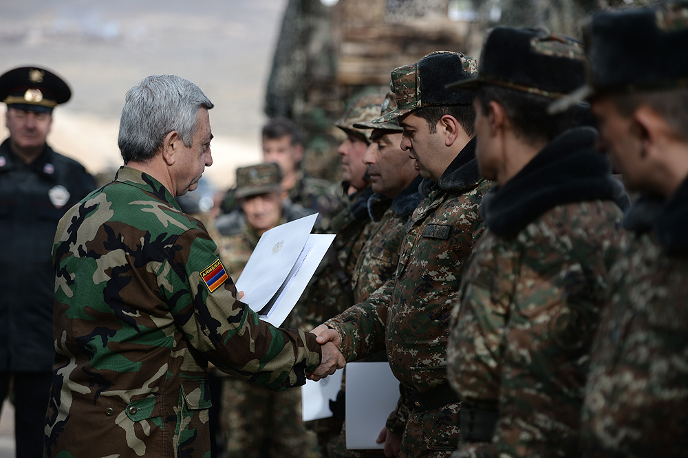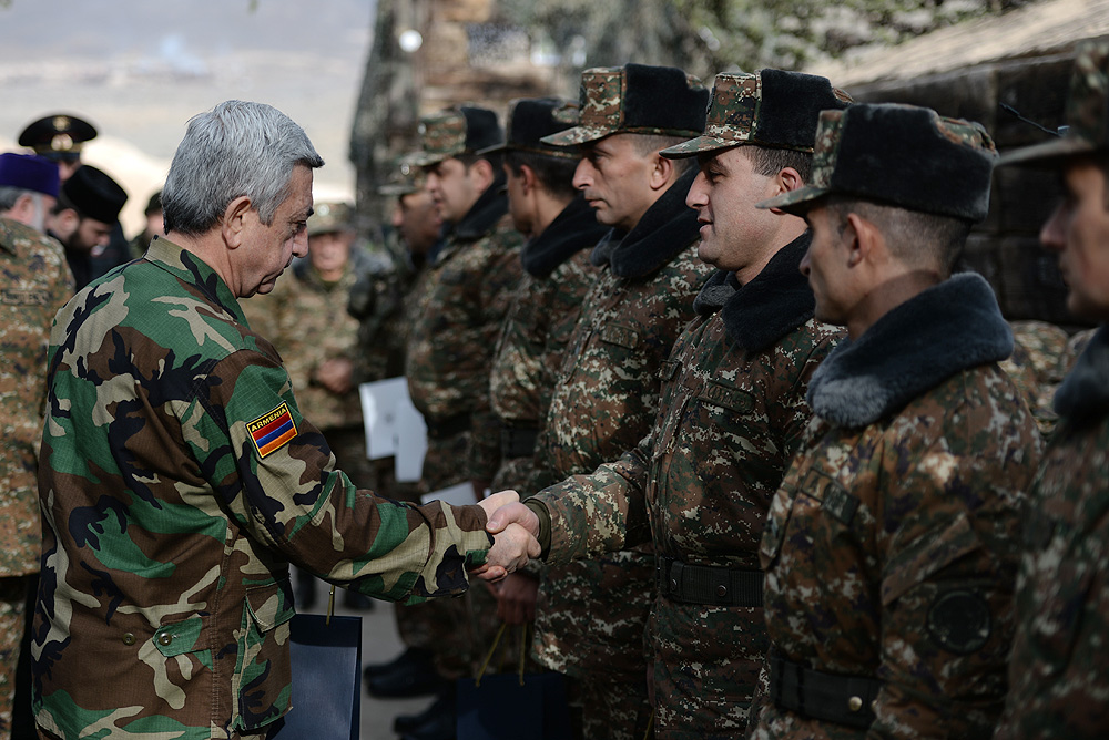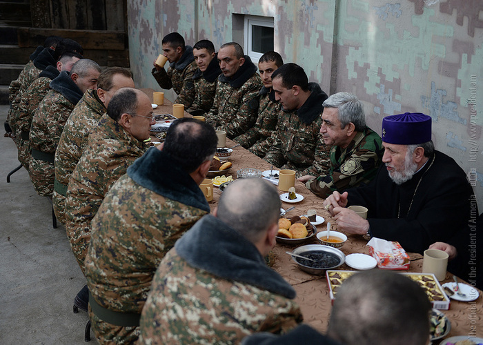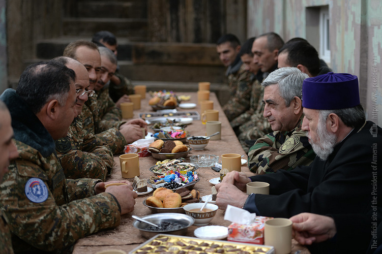 Հանրապետության Նախագահը ծառայության ընթացքում իրենց անձնվիրությամբ և խիզախությամբ աչքի ընկած զինծառայողներին՝ մի խումբ սպաների և զինվորների հանձնել է նվերներ: Սերժ Սարգսյանը տոնական սեղանի շուրջ զրուցել է զինվորների հետ, շնորհավորել Հայոց բանակի բոլոր զինծառայողներին գալիք տոների կապակցությամբ, հղել բարեմաղթանքներ և շնորհակալություն հայտնել անձնվեր ծառայության համար. «Մեզնից յուրաքանչյուրին Աստված կամ ճակատագիրը հատկացնում է մի ժամանակահատված, որտեղ կարևորն ինքն է, որտեղ պատասխանատուն ինքն է՝ և՛ հայրենյաց հողի պաշտպանն է ինքը, և՛ երկրի կայունության պատասխանատուն է ինքը, բարեկեցության պատասխանատուն է ինքը: Այսօր այստեղ նստածներով, մեր ողջ զինված ուժերով պատասխանատուն մենք ենք: Այստեղ նստած քյավառցի տղայից սկսած վերջացրած գեներալներով պատասխանատուն մենք ենք և՛ Ղարաբաղի համար, և՛ Գյումրու համար, և՛ Լոռու համար, և՛ Արարատի համար, մեր հայրենի հողի համար: Բոլորիդ ուժ, կորով, կարողություն, որպեսզի այս պատասխանատու խնդիրը մեզ հատկացված ժամկետում մենք կատարենք պատվով»,-ասել է ՀՀ Նախագահը: