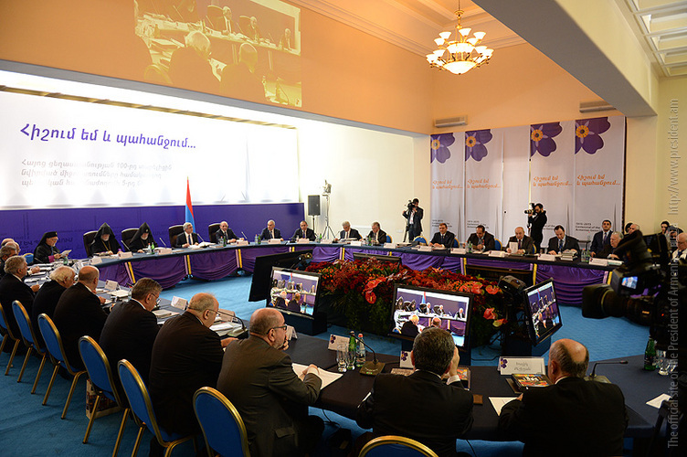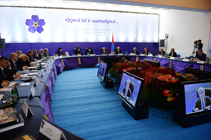 Մեր անցյալ նիստի ժամանակ, Ձեզ հետ խորհրդակցելով, հրավերներ հղեցի մի շարք պետությունների և միջազգային կարևորագույն կառույցների առաջնորդների՝ մասնակցելու 100-րդ տարելիցի միջոցառումներին: Պետք է տեղեկացնեմ ձեզ, որ ստացվել են դրական պատասխաններ մի շարք պետություններից և կազմակերպություններից: Որոշ երկրներ հաստատել են իրենց ներկայությունը բարձր պետական պատվիրակությունների մակարդակով: Ոմանք նշել են, որ կարևորում են այդ օրն անցկացնել իրենց երկրների հայ համայնքի հետ: Ես խնդրում եմ և՛ պետական հանձնաժողովի անդամներին, և՛ տարածաշրջանային հանձնախմբերին` Հայաստանի Հանրապետության դիվանագիտական ներկայացուցչությունների հետ միասին ձեռնամուխ լինել այդ օրերին կայանալիք միջոցառումներին, ինչպես նաև մարտի վերջին անցկացվող միջազգային մեդիաֆորումին հնարավորինս լայն մասնակցություն ապահովելու ուղղությամբ: Դա հատկապես կարևոր է՝ հաշվի առնելով Թուրքիայում կայացված անհեռատես և ցինիկ որոշումը` խմբագրել սեփական պատմությունը` Գալիպոլիի ճակատամարտի տարեդարձը Հայոց ցեղասպանության 100-րդ տարելիցի օրը նշելու միջոցով: Ասում են, որ քաղաքականության մեջ բոլոր միջոցները հարմար են, բայց կարծում եմ՝ այդ հարցում պաշտոնական Անկարան վատ ծառայություն մատուցեց ինքն իրեն: