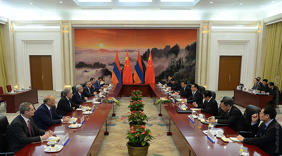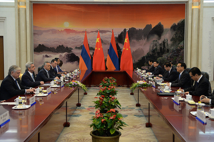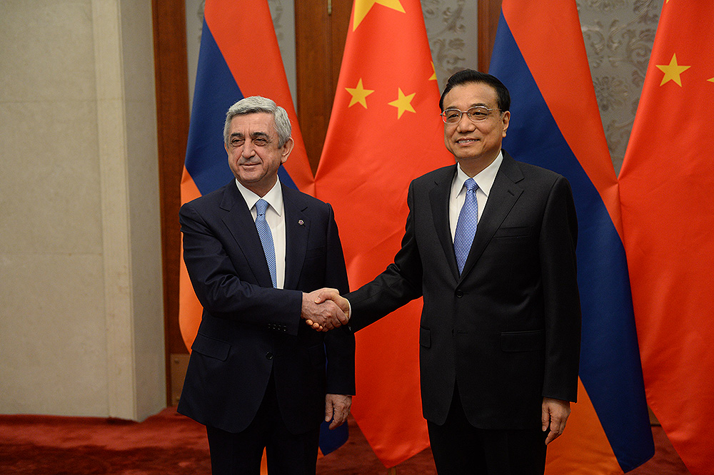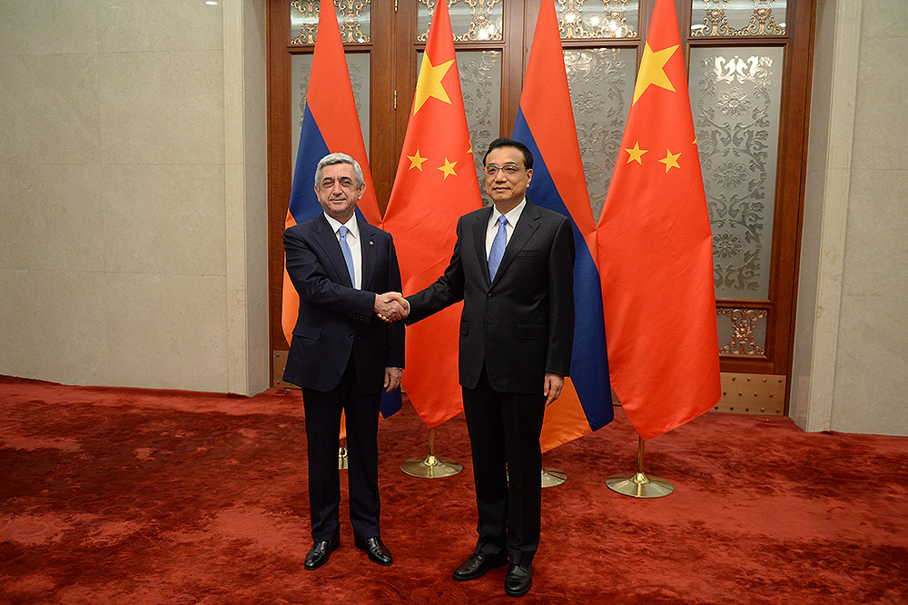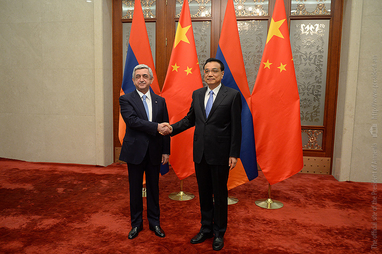 Նախագահ Սերժ Սարգսյանն այսօր Պեկինում հանդիպում է ունեցել ՉԺՀ պետական խորհրդի նախագահ (վարչապետ) Լի Քեցյանի հետ: Քննարկվել է փոխշահավետ և հեռանկարային մի շարք ոլորտներում երկկողմ հարաբերությունները խորացնելու, Հայաստանի և Չինաստանի միջև փոխգործակցության առկա մեծ ներուժը ի նպաստ երկու բարեկամ երկրների լիարժեքորեն օգտագործելու հետ կապված հարցերի լայն շրջանակ: Այն ներառել է էներգետիկայի, տրանսպորտի, քիմիական արդյունաբերության, կրթության, գիտության, մշակույթի, գյուղատնտեսության, ավիացիայի, զբոսաշրջության, ենթակառուցվածքների զարգացման և մի շարք այլ բնագավառներ: