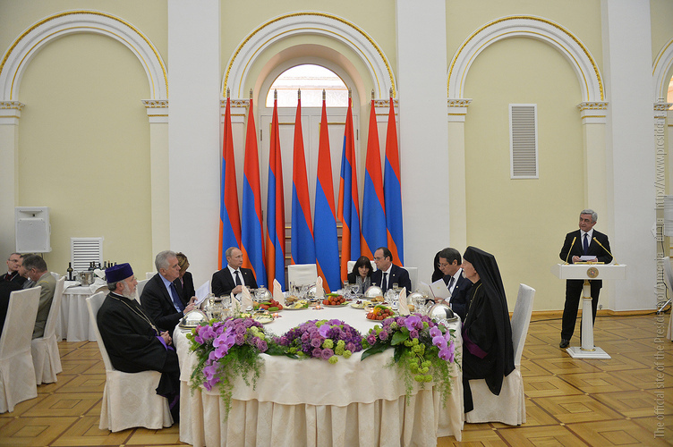 ՀՀ Նախագահ, Հայոց ցեղասպանության 100-րդ տարելիցին նվիրված միջոցառումները համակարգող պետական հանձնաժողովի նախագահ Սերժ Սարգսյանի անունից այսօր ի պատիվ Հայաստան ժամանած բարձրաստիճան պատվիրակությունների և պետությունների ղեկավարների, Նախագահի նստավայրում տրվել է պետական ճաշ, որի ժամանակ Սերժ Սարգսյանը հանդես է եկել բաժակաճառով.