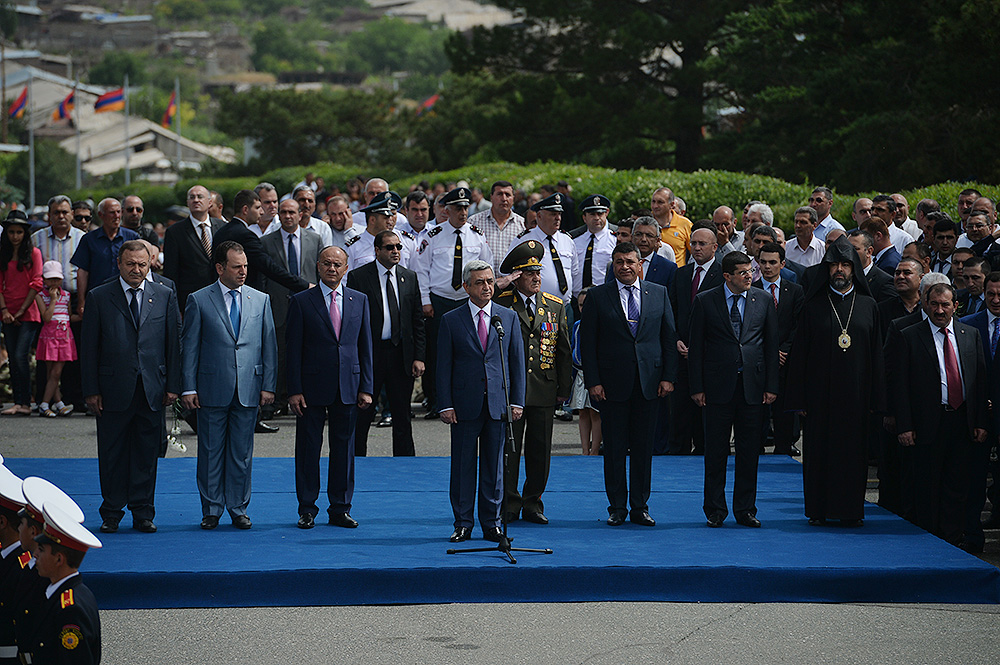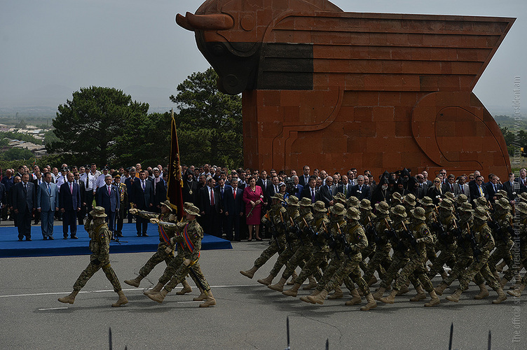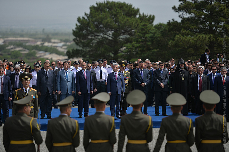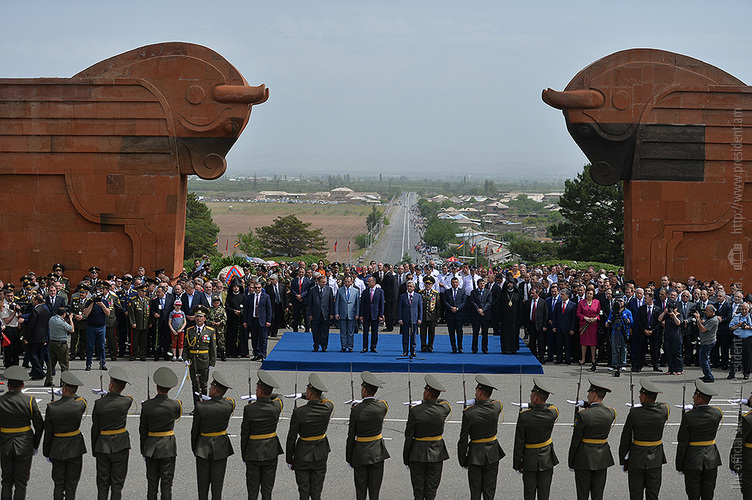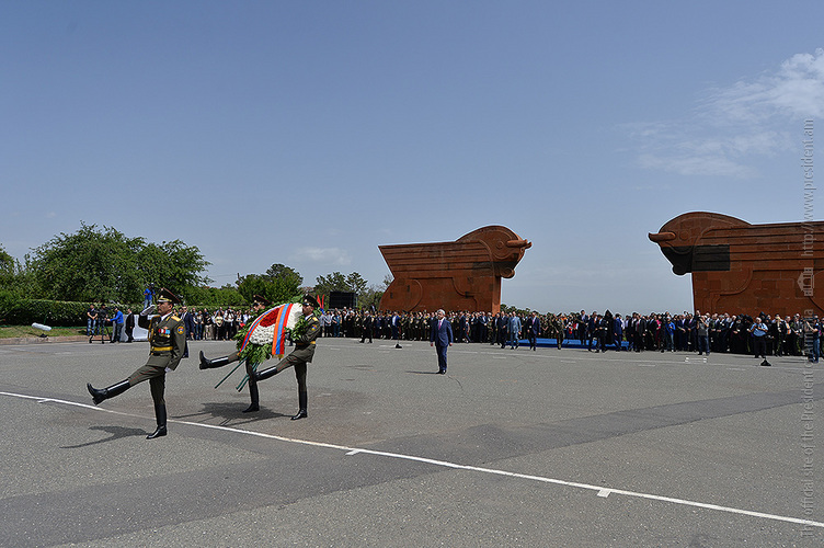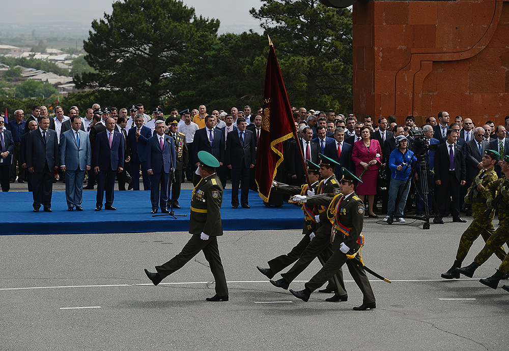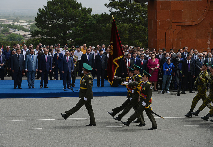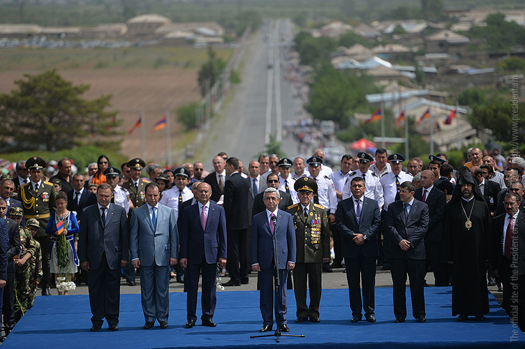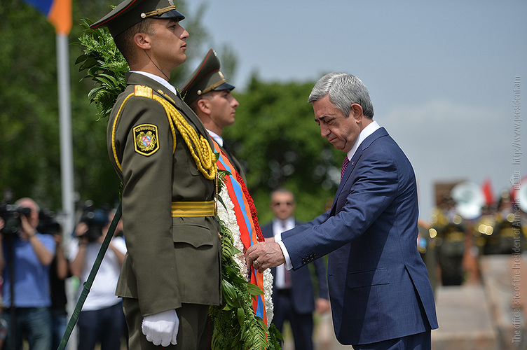 Նախագահ Սերժ Սարգսյանն այսօր Սարդարապատի հերոսամարտի հուշահամալիրում ՀՀ բարձրագույն ղեկավարության և հյուրերի հետ մասնակցել է Հանրապետության տոնին նվիրված տոնակատարությանը: Նախագահը ծաղկեպսակ է դրել Սարդարապատի ճակատամարտի հերոսների հիշատակը հավերժացնող հուշակոթողին և հարգանքի տուրք մատուցել: ՀՀ Նախագահ, զինված ուժերի գերագույն գլխավոր հրամանատար Սերժ Սարգսյանը ողջունել է տոնի կապակցությամբ անցկացված զորահանդեսի մասնակիցներին, շնորհավորել Հանրապետության տոնի առթիվ: Հանդիսության մասնակիցների հետ Նախագահն այնուհետև դիտել է տոնական մշակութային ծրագիրը:
