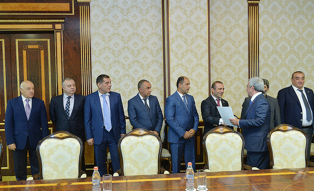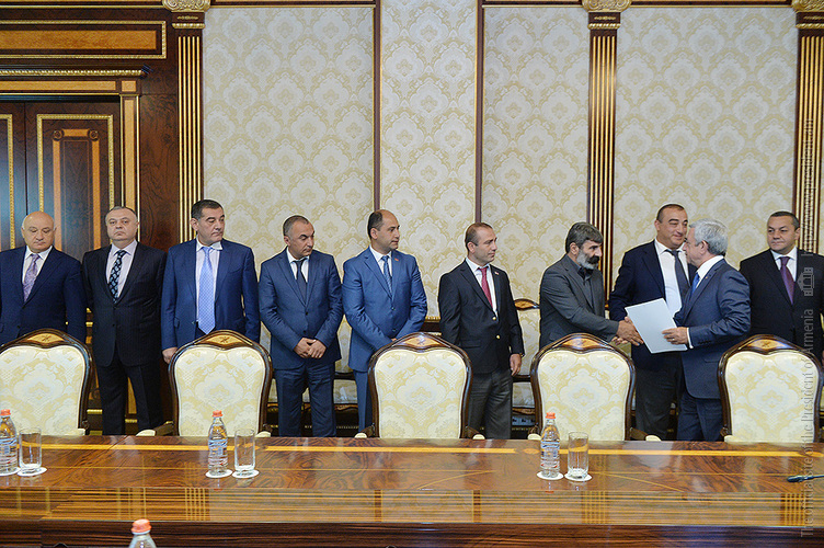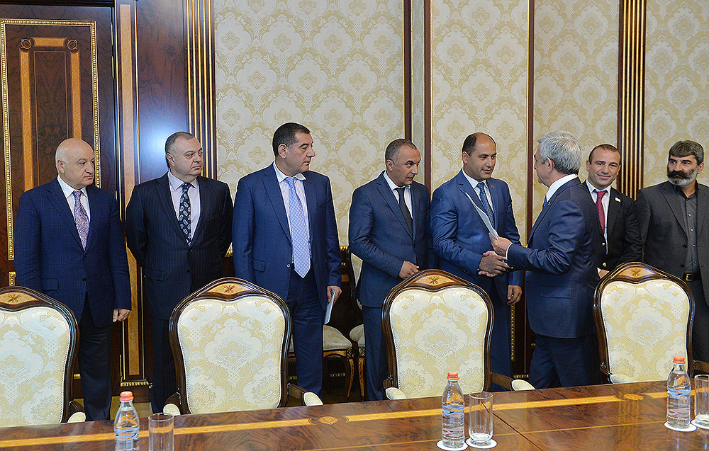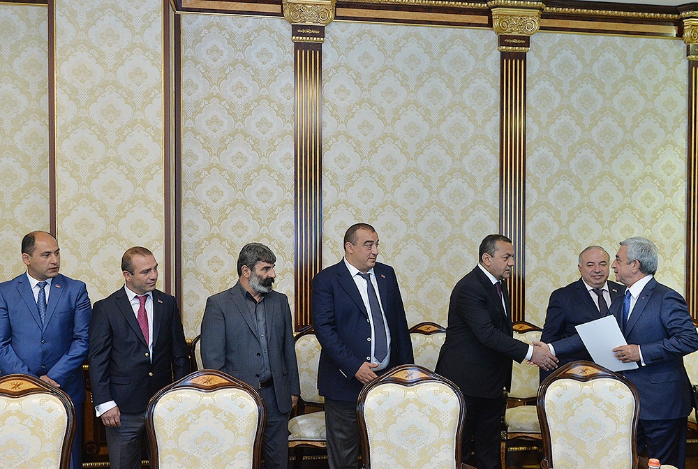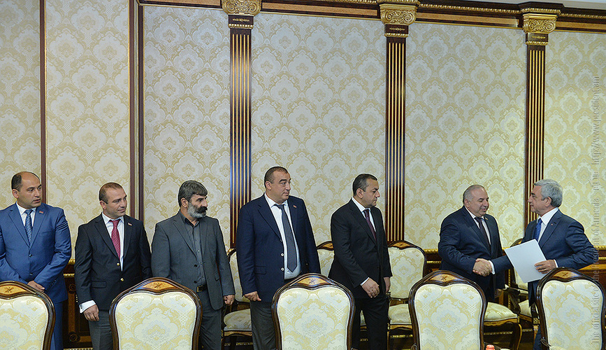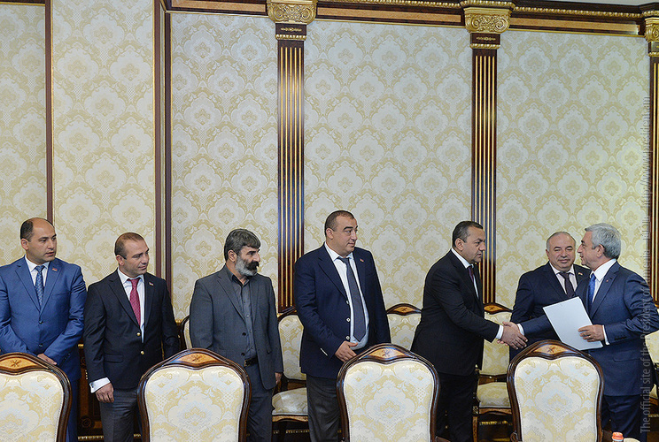 ՀՀ Նախագահի նստավայրում սահմանադրական բարեփոխումների շուրջ անցկացվող խորհրդակցությունների շրջանակում Նախագահ Սերժ Սարգսյանն այսօր հանդիպում է ունեցել ՀՀ Ազգային ժողովի պատգամավորներ Արայիկ Գրիգորյանի, Գրիգորի Մարգարյանի, Բազմասեր Առաքելյանի, Մարտուն Գրիգորյանի, Մուշեղ Պետոյանի, Դավիթ Քոչարյանի, Ռուստամ Գասպարյանի, Արագած Ախոյանի, Կարո Կարապետյանի, Հարություն Ղարագյոզյանի հետ: