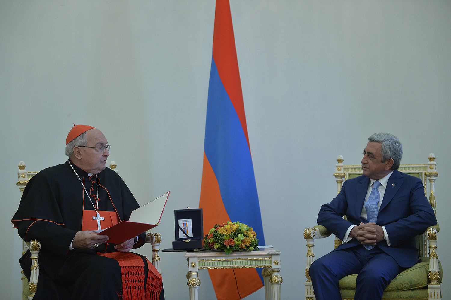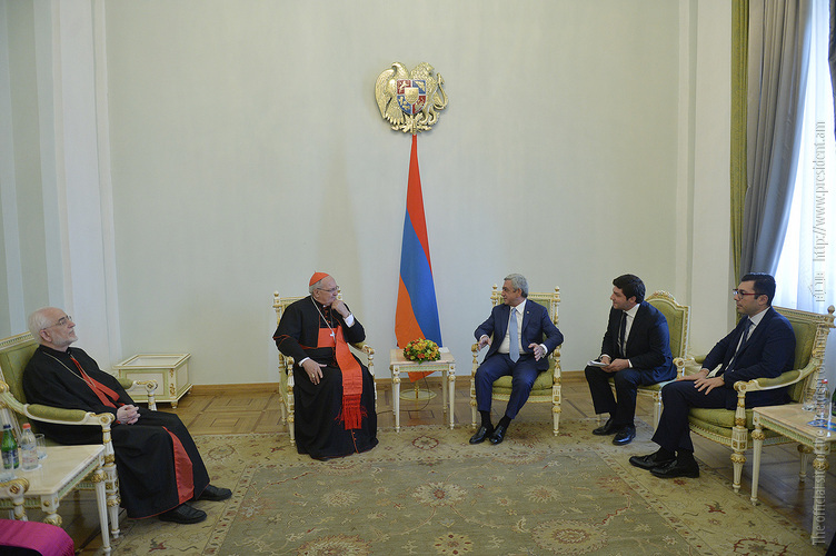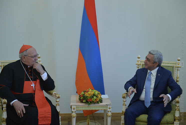 Նախագահ Սերժ Սարգսյանն այսօր ընդունել է Սուրբ Աթոռի Արևելյան եկեղեցիների միաբանության պրեֆեկտ, կարդինալ Լեոնարդո Սանդրիին և նրա գլխավորած պատվիրակությանը: Հանդիպմանը ներկա է եղել նաև Հայ Կաթողիկե Եկեղեցու նորընտիր Կաթողիկոս Պատրիարք Ամենապատիվ Տեր Գրիգոր Պետրոս Ի Գապրոյանը: