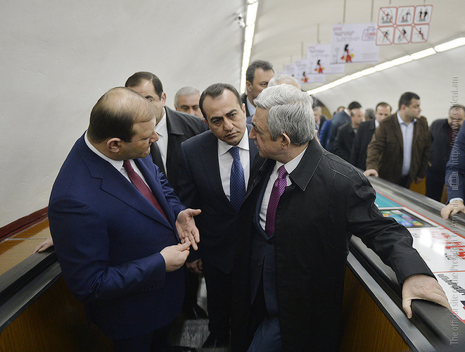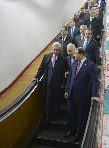 Նախագահ Սերժ Սարգսյանն այսօր այցելել է Կարեն Դեմիրճյանի անվան Երևանի մետրոպոլիտեն: Քաղաքապետ Տարոն Մարգարյանը և «Կարեն Դեմիրճյանի անվան Երևանի մետրոպոլիտեն» ՓԲԸ-ի պատասխանատու պաշտոնյաները Հանրապետության Նախագահին ներկայացրել են Երևանի մետրոպոլիտենի ենթակառուցվածքների արդիականացման ուղղությամբ իրականացված աշխատանքները, առկա խնդիրները, ինչպես նաև մետրոպոլիտենի անվտանգ շահագործումն ապահովելու նպատակով վերակառուցման առաջին և երկրորդ վարկային ծրագրերով նախորդ վեց տարիներին իրականացված աշխատանքների արդյունքների հիման վրա հետագա անելիքները: