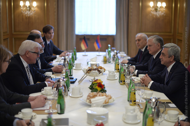 Պաշտոնական այցով Գերմանիայի Դաշնային Հանրապետությունում գտնվող Նախագահ Սերժ Սարգսյանն այսօր հանդիպում է ունեցել ԳԴՀ արտաքին գործերի նախարար, ԵԱՀԿ գործող նախագահ Ֆրանկ-Վալտեր Շտայնմայերի հետ: