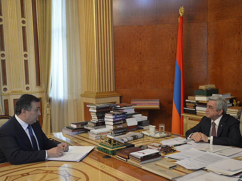 ՀՀ Նախագահ Սերժ Սարգսյանին այսօր ՀՀ մշակույթի նախարար Արմեն Ամիրյանը զեկուցել է նախարարության գործունեության գերակա ուղղություններից մեկի՝ Հայաստանում և արտերկրում հայկական մշակույթի հանրահռչակման ու զարգացման, մայրաքաղաքից բացի մարզերում ևս մշակութային կյանքի աշխուժացման ուղղությամբ նախարարության նոր նախաձեռնությունների մասին, որոնց Սերժ Սարգսյանն անդրադարձել էր օրերս՝ ՀՀԿ 16-րդ համագումարում հնչեցրած զեկույցի ժամանակ: Արմեն Ամիրյանը Հանրապետության Նախագահի հետ քննարկել է դրանց իրականացման, Հայաստանը մշակույթի միջոցով միջազգային հարթակներում լավագույնս ներկայացնելու հնարավորությունները: