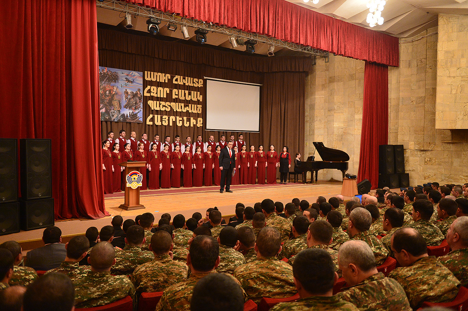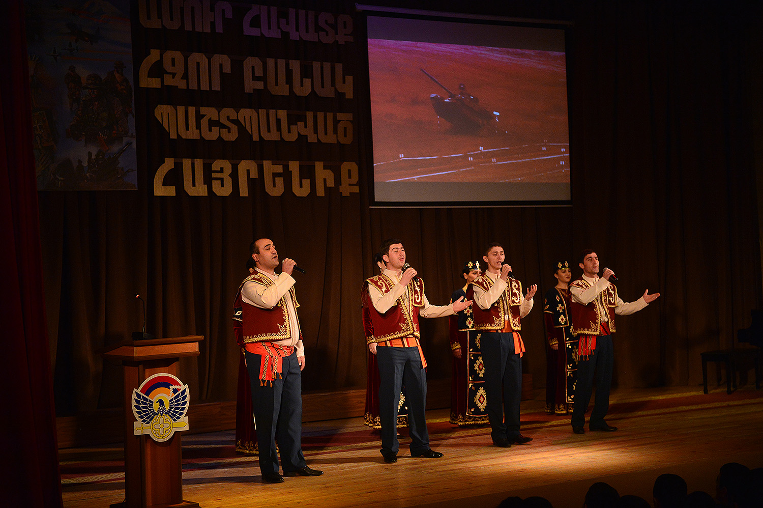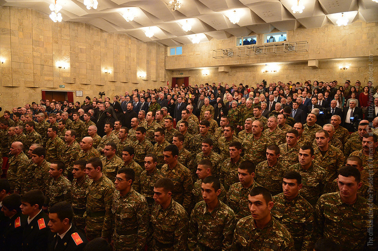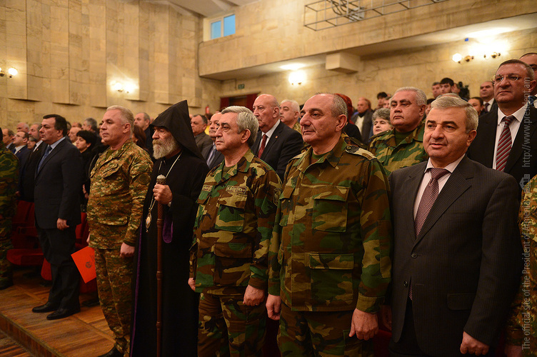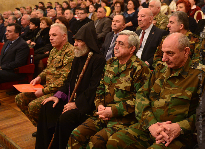 Երեկոյան Ստեփանակերտի մշակույթի և երիտասարդության պալատում ՀՀ և ԼՂՀ նախագահները ներկա են գտնվել «Ամուր հավատք, հզոր բանակ, պաշտպանված հայրենիք» միջոցառմանը: