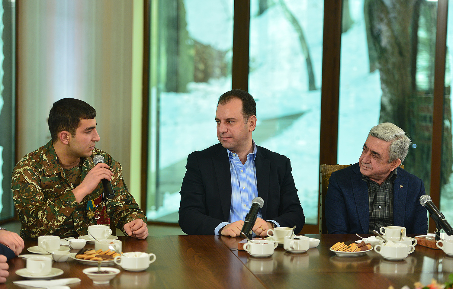 Սերժ Սարգսյանն առաջարկելով անկաշկանդ խոսել եղած խնդիրների և առհասարակ մեր երկրի հետագա զարգացման մասին՝ նշել է, որ ինքը ևս ունի հարցեր, որոնց շուրջ կցանկանար լսել հայրենիքի պաշտպանների կարծիքը:
