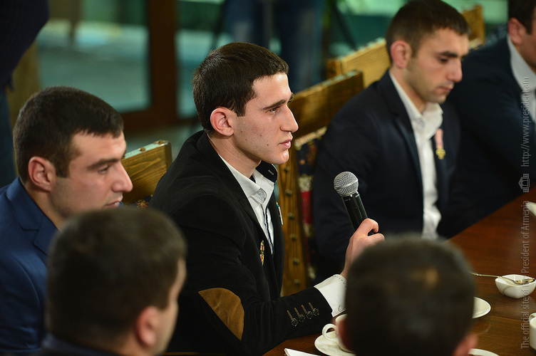 Հանրապետության Նախագահը զրույցի ընթացքում զինվորներից լսել է իրեն հետաքրքրող հարցերի պատասխանները, այդ թվում, թե ի՞նչ կցանկանային զինծառայողները, որ փոխվեր զինված ուժերում, ի՞նչ խնդիրներ են նրանք տեսնում, ի՞նչ տվեց բանակում ծառայությունը հայրենիքի առջև իրենց պարտքը կատարած զինվորներին, ո՞վ է ամենահիշված հրամանատարն ու ինչո՞ւ, մինչև մարտական գործողությունները զինվորների ստացած գիտելիքները բավարա՞ր էին մարտական գործողություններին արդյունավետ մասնակցելու համար, մտադի՞ր է, արդյոք, հանդիպման մասնակիցներից որևէ մեկը ներգրավվել պայմանագրային ծառայության մեջ կամ դառնալ սպա, որքանո՞վ էին բանակի մասին նրանց պատկերացումները համապատասխանում մինչև զորակոչվելն ունեցած սպասելիքներին, զորացրվելուց հետո կապ պահպանո՞ւմ են ծառայակից ընկերների հետ: