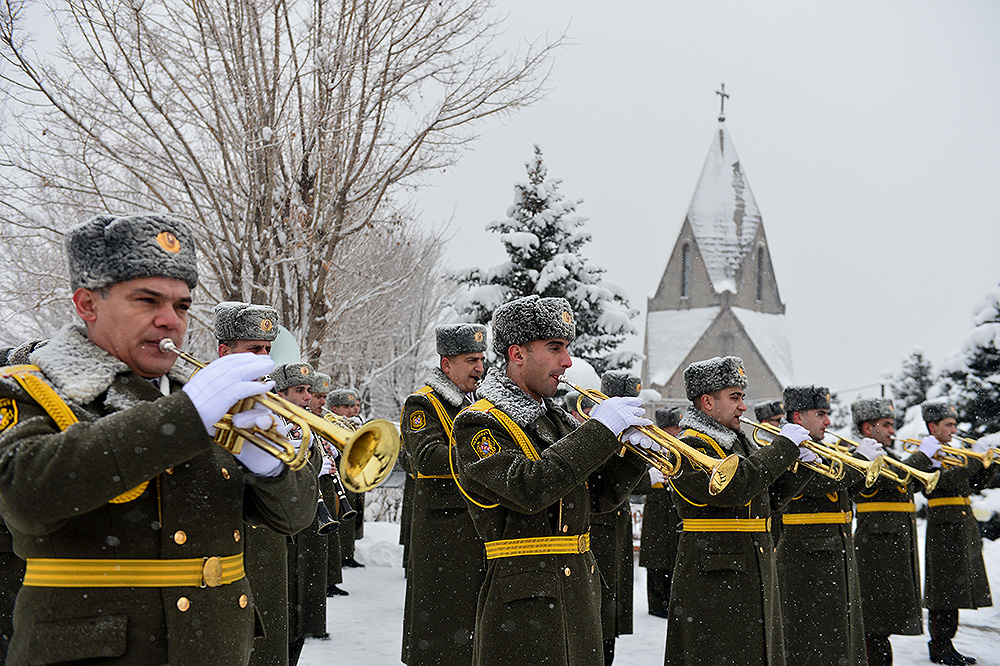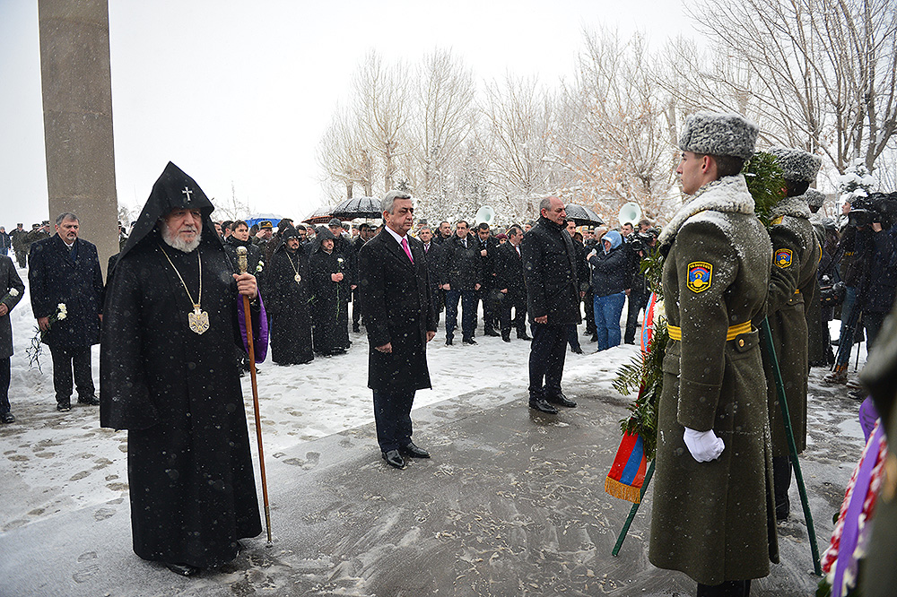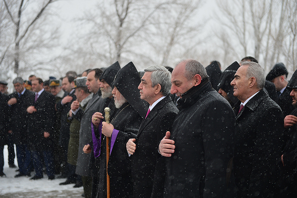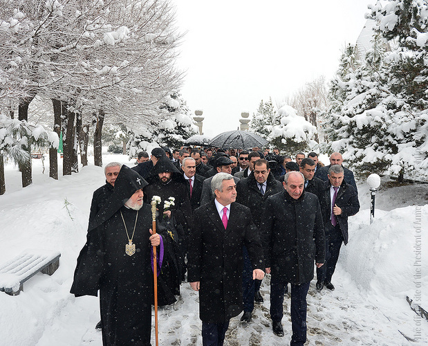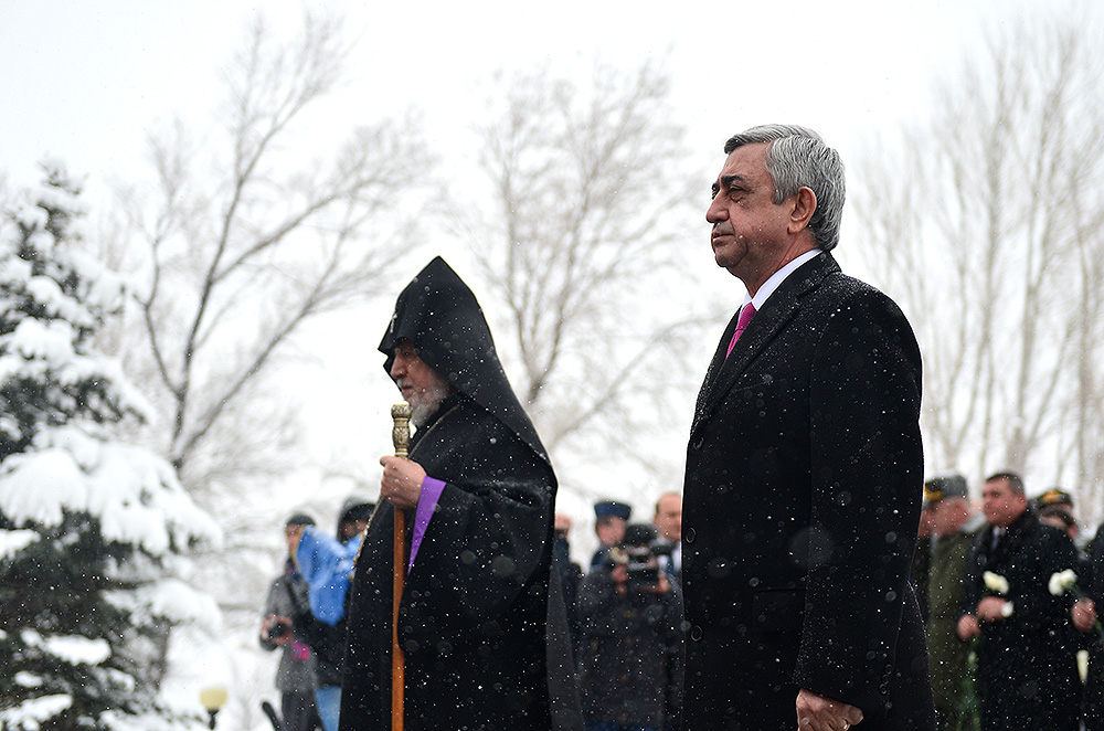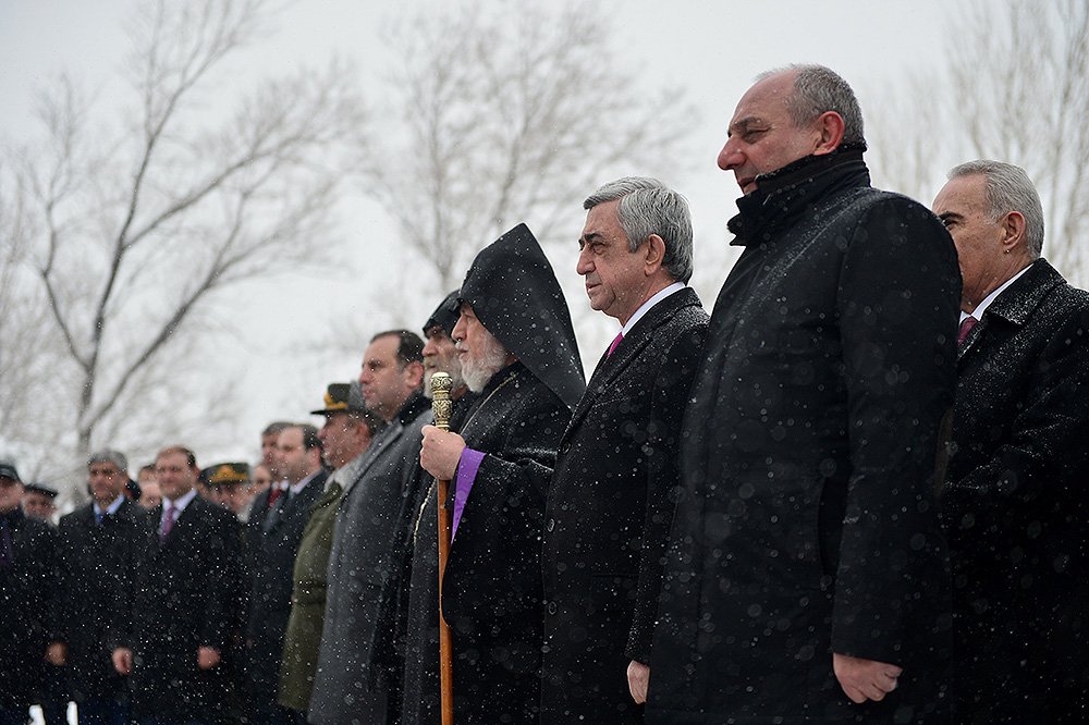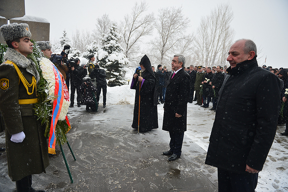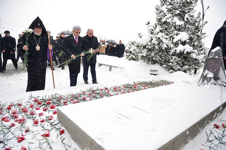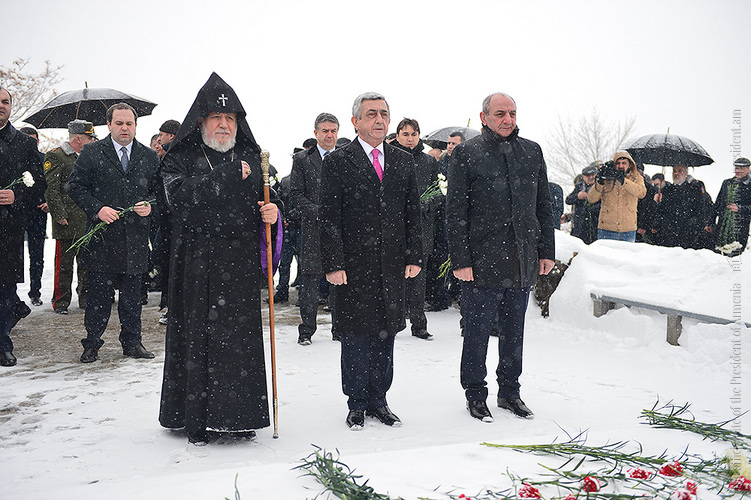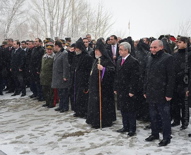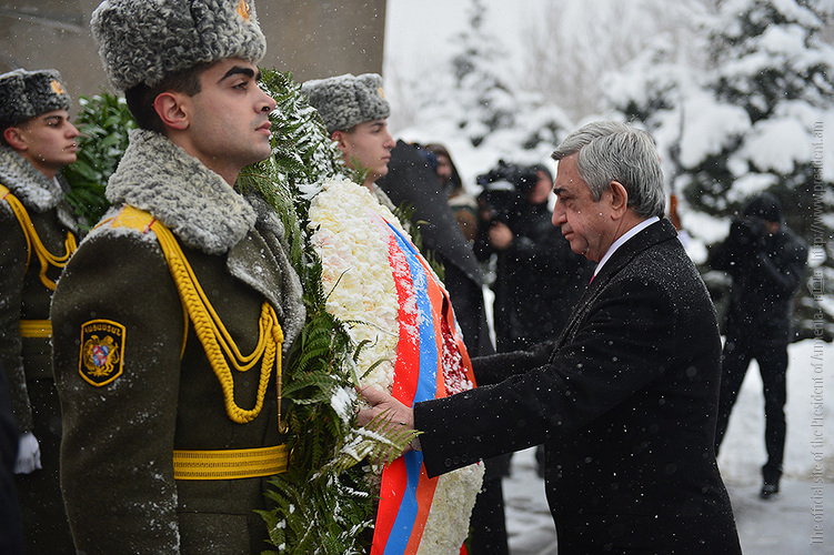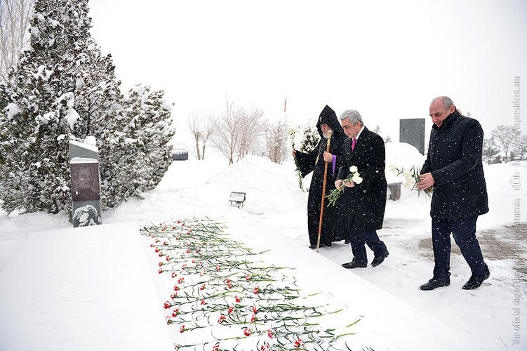 ՀՀ զինված ուժերի կազմավորման 25-րդ տարեդարձի կապակցությամբ Նախագահ Սերժ Սարգսյանը Ն.Ս.Օ.Տ.Տ. Գարեգին Բ Ամենայն Հայոց Կաթողիկոսի, ԼՂՀ նախագահ Բակո Սահակյանի հետ և Հանրապետության բարձրագույն ղեկավարության ուղեկցությամբ այսօր այցելել է «Եռաբլուր» զինվորական պանթեոն` հարգանքի տուրք մատուցել իրենց կյանքը Հայրենիքի անկախության համար զոհաբերած հայորդիների հիշատակին: