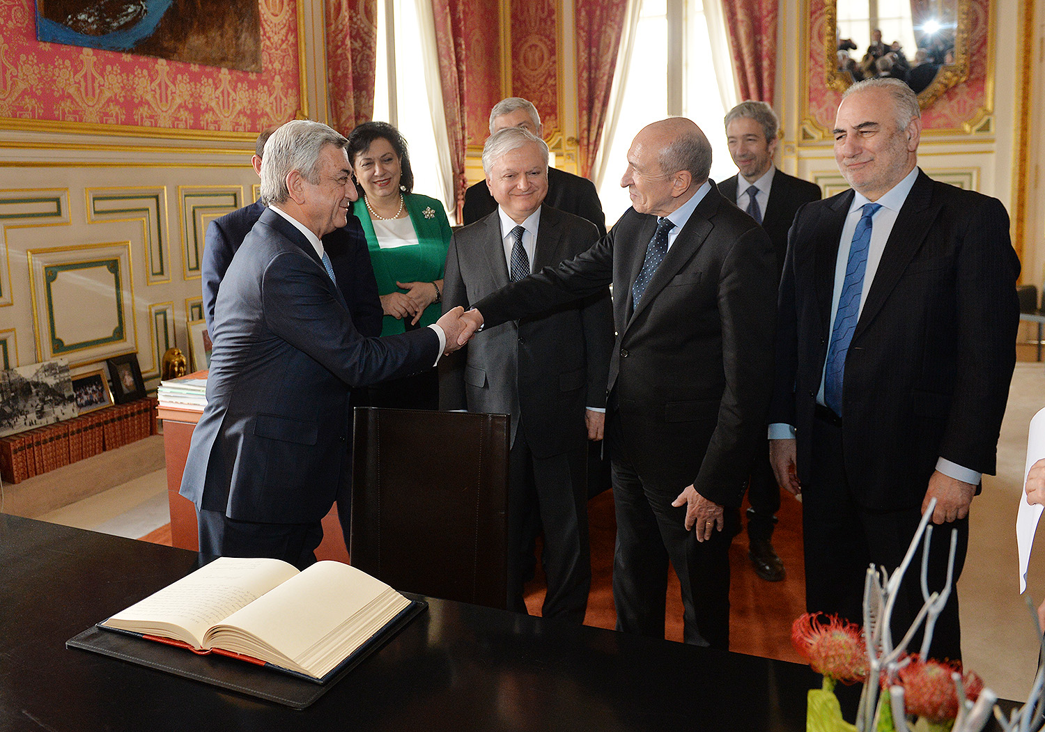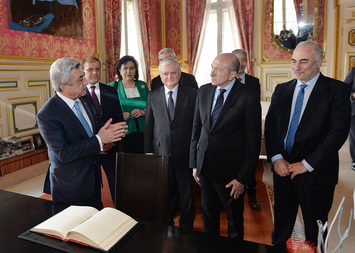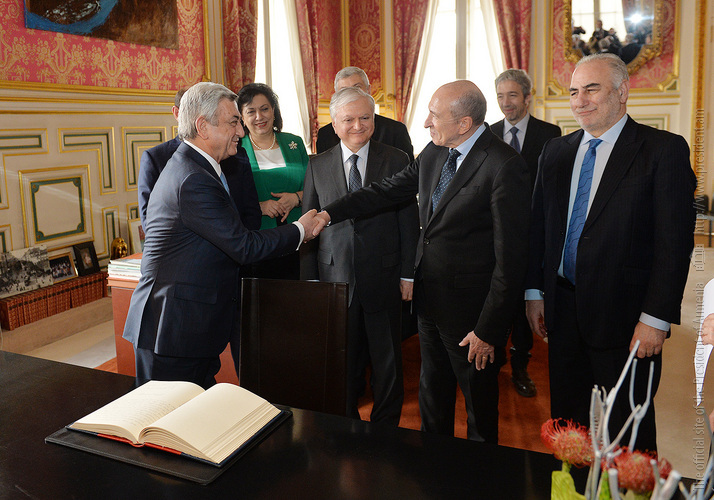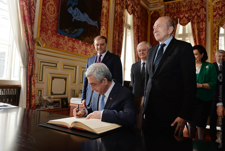 Նախագահ Սերժ Սարգսյանը Լիոնի քաղաքապետարանում նաև գրառում է կատարել Պատվավոր հյուրերի գրքում. «Ամեն անգամ մեծ ջերմությամբ եմ վերադառնում հարազատ դարձած այս քաղաքը՝ Լիոն, որ գերում է իր գեղեցկությամբ, ներդաշնակությամբ, հորդող կենսուրախությամբ և ստեղծագործ մթնոլորտով։ Հատկանիշներ, որոնք համապատասխանում են հայ ժողովրդի բնավորությանն ու նկարագրին։ Շնորհակալ եմ Լիոնի իշխանություններին՝ հայկական պատվիրակությանը ցուցաբերած սրտաբացության համար, դժվար պահին մեր հայրենակիցներին գրկաբաց ընդունելու համար։ Հպարտ եմ, որ որքան այս քաղաքն է հյուրընկալ եղել հայերի հանդեպ, նույնքան էլ հայերը, որպես վերգտած հայրենիք, սիրում ու շենացնում են Լիոնը։ Թող հայ-ֆրանսիական բարեկամությունը մշտապես լինի նույնքան փոխհարստացնող»,-գրել է Նախագահը: