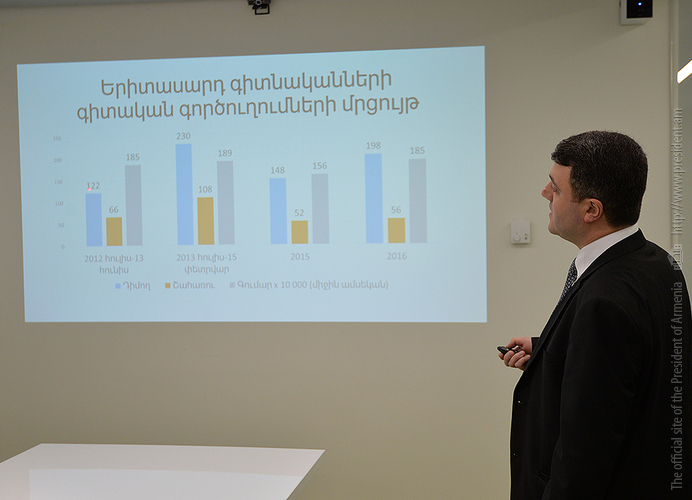 Երիտասարդ գիտնականները Հանրապետության Նախագահին ներկայացրել են 2015-2016թթ. հաշվետու ժամանակահատվածում աջակցության ծրագրի շրջանակներում իրականացված աշխատանքները, համագործակցության ծրագրերը՝ համեմատություններ անցկացնելով նախորդ տարիների հետ: Նրանք խոսել են նաև հետագա անելիքների ու ակնկալիքների մասին: «Երիտասարդ գիտնականների աջակցության ծրագրի» հաշվետվությունը ներառել է ութ հիմնական ուղղություն՝ երիտասարդ գիտնականներին միջազգային գիտական գործուղումների, գիտաժողովների, սիմպոզիումների, սեմինարների կազմակերպման ֆինանսական աջակցության տրամադրում, գիտական դրամաշնորհների տրամադրում, երիտասարդ գիտնականների հեղինակած գրքերի տպագրության համար ֆինանսական աջակցության տրամադրում, գիտական սարքերի և/կամ նյութերի ձեռքբերման համար ֆինանսական աջակցության տրամադրում, ազդեցության գործակից ունեցող պարբերականներում երիտասարդ գիտնականների գիտական հոդվածների տպագրության համար ֆինանսական աջակցության տրամադրում, գիտական մրցույթի կազմակերպում և հայազգի գիտնականների դասախոսությունների կազմակերպում: