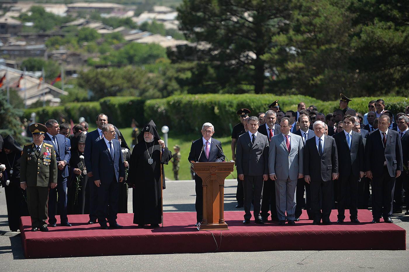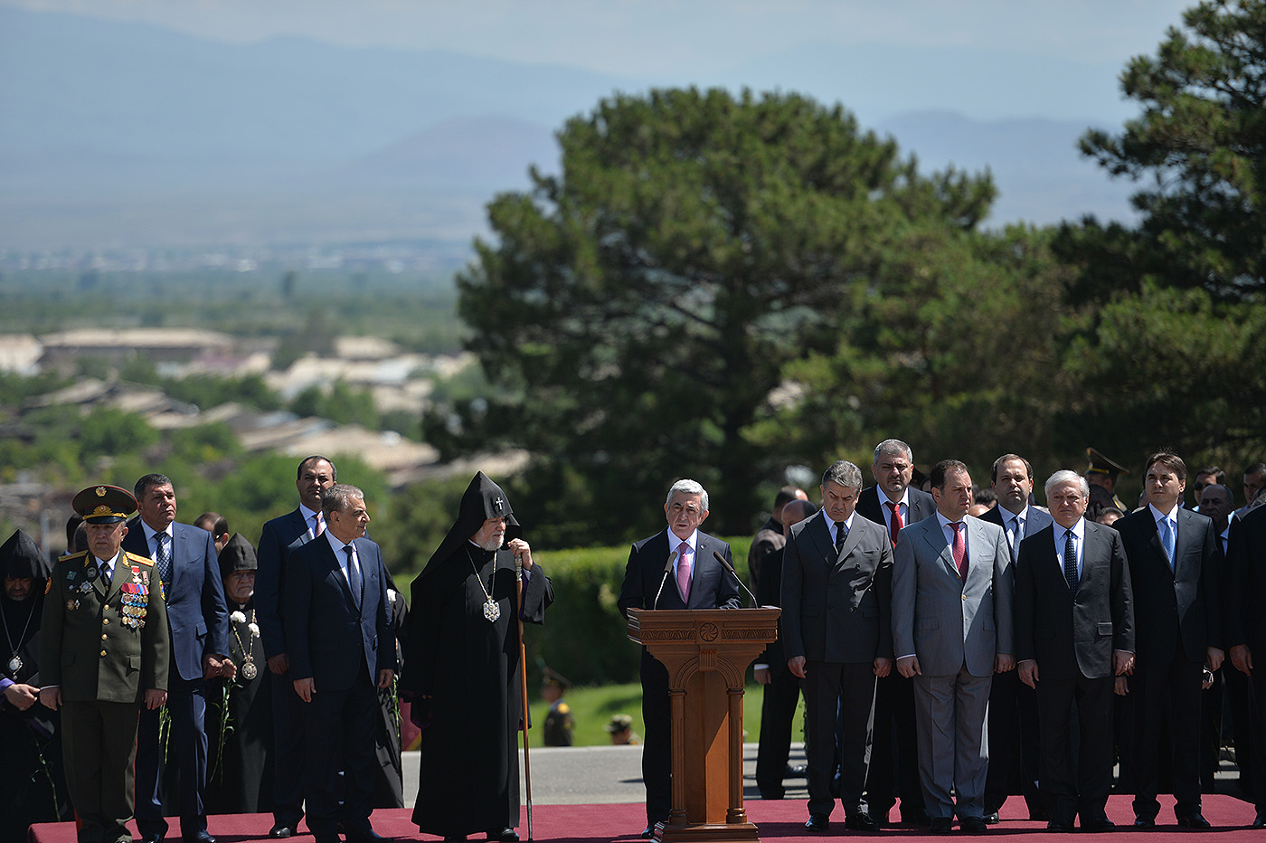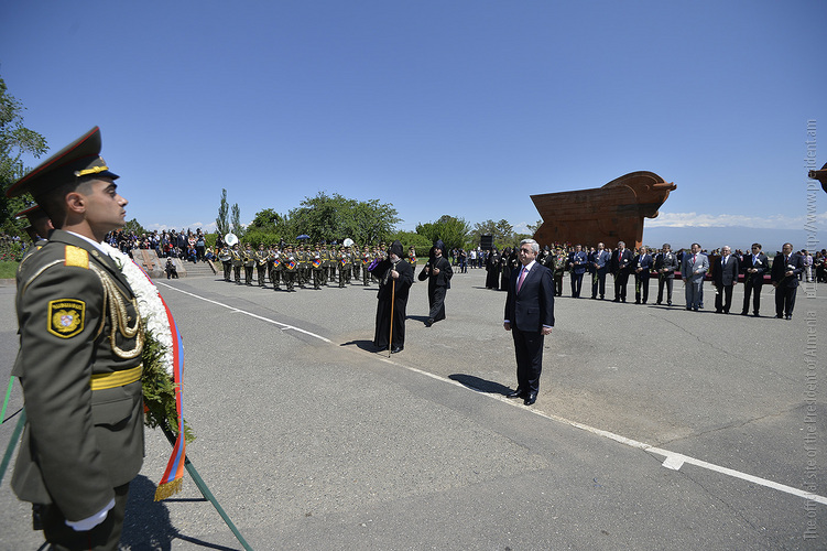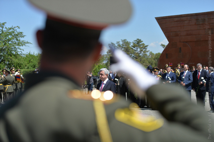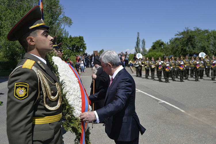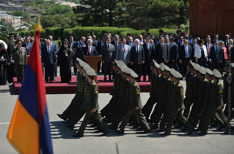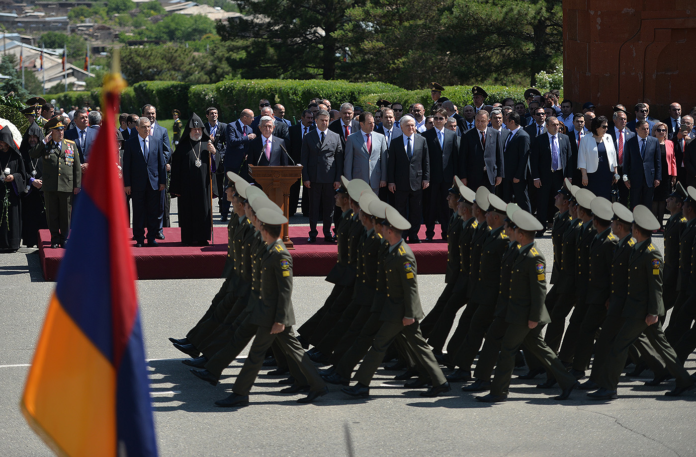 Նախագահ Սերժ Սարգսյանն այսօր Սարդարապատի հերոսամարտի հուշահամալիրում Ն.Ս.Օ.Տ.Տ. Գարեգին Բ Ամենայն Հայոց Կաթողիկոսի, Հանրապետության բարձրագույն ղեկավարության և հուշահամալիր այցելած հյուրերի հետ մասնակցել է Հանրապետության տոնին նվիրված տոնակատարությանը: Հանրապետության Նախագահը ծաղկեպսակ է դրել Սարդարապատի ճակատամարտի հերոսների հիշատակը հավերժացնող հուշակոթողին և հարգանքի տուրք մատուցել: Զորահանդեսի մասնակիցներին ողջունելուց և Պատվո նվագախմբի հանդիսավոր քայլերթը ընդունելուց հետո Նախագահը միջոցառման մասնակիցների հետ Սարդարապատի հուշահամալիրի Հայոց ազգագրության և ազատագրական պայքարի պատմության ազգային թանգարանում դիտել է «Գալէմքեարեաններ պղնձագործ վարպետաց սիրիահայոց դպրոց. փրկված և Հայրենիքին նվիրաբերված մշակութային արժեքներ» խորագրով ցուցահանդեսը: