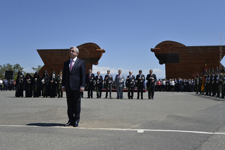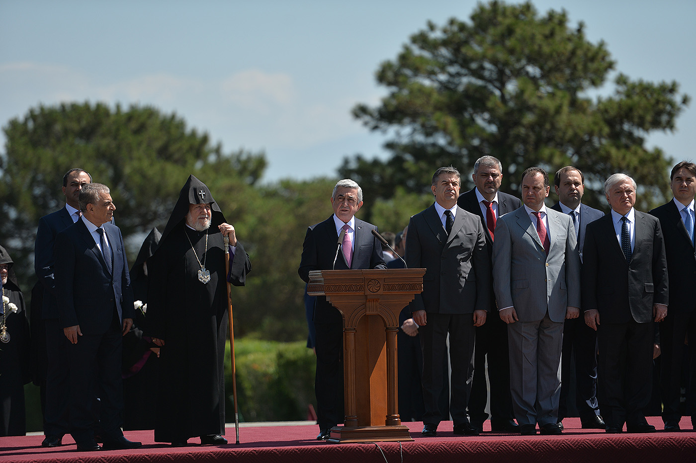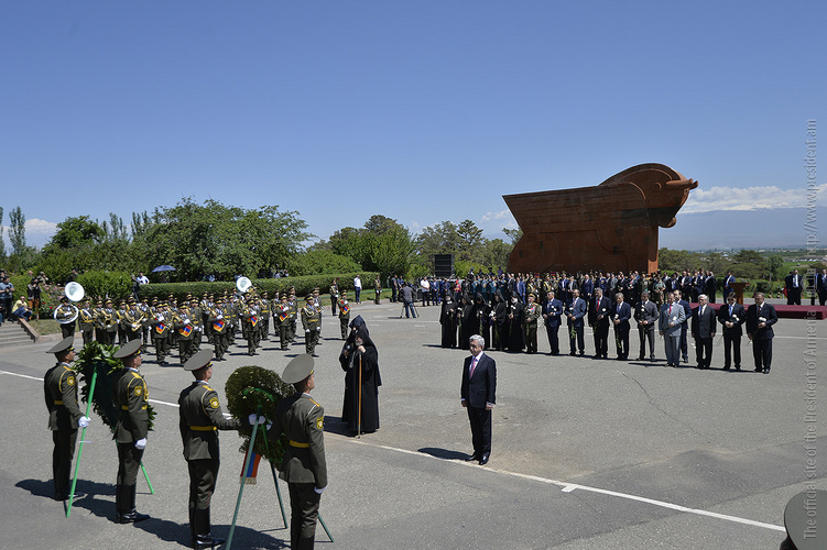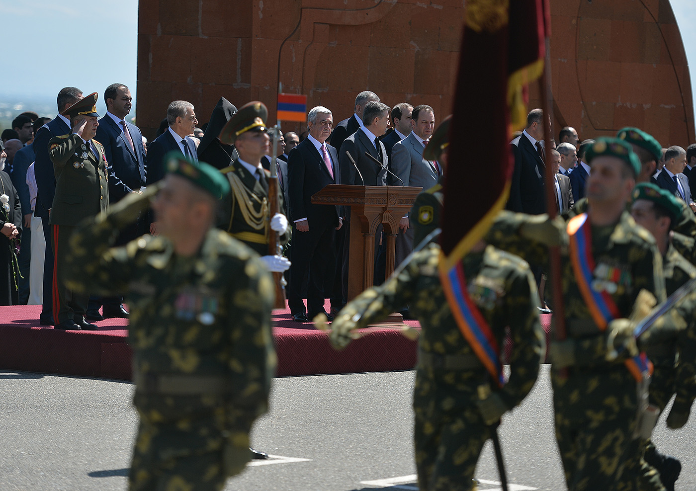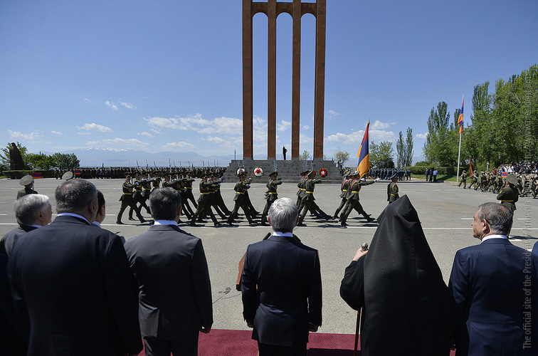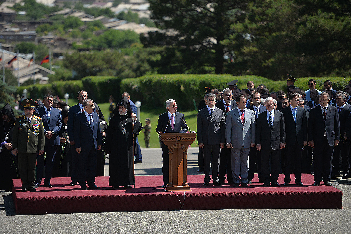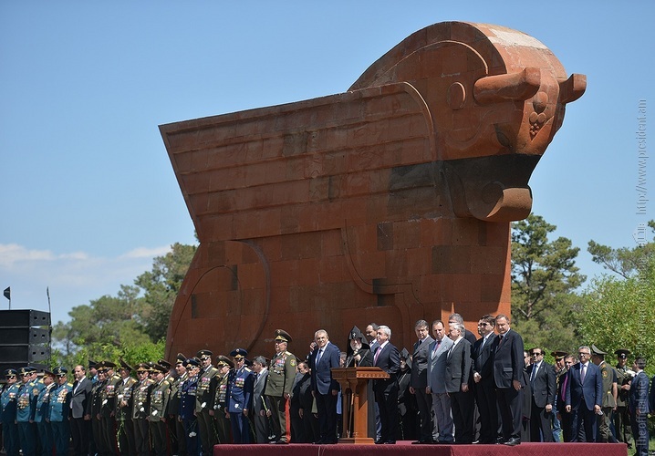 Նախագահ Սերժ Սարգսյանն այսօր Սարդարապատի հերոսամարտի հուշահամալիրում Ն.Ս.Օ.Տ.Տ. Գարեգին Բ Ամենայն Հայոց Կաթողիկոսի, Հանրապետության բարձրագույն ղեկավարության և հուշահամալիր այցելած հյուրերի հետ մասնակցել է Հանրապետության տոնին նվիրված տոնակատարությանը: Հանրապետության Նախագահը ծաղկեպսակ է դրել Սարդարապատի ճակատամարտի հերոսների հիշատակը հավերժացնող հուշակոթողին և հարգանքի տուրք մատուցել: Զորահանդեսի մասնակիցներին ողջունելուց և Պատվո նվագախմբի հանդիսավոր քայլերթը ընդունելուց հետո Նախագահը միջոցառման մասնակիցների հետ Սարդարապատի հուշահամալիրի Հայոց ազգագրության և ազատագրական պայքարի պատմության ազգային թանգարանում դիտել է «Գալէմքեարեաններ պղնձագործ վարպետաց սիրիահայոց դպրոց. փրկված և Հայրենիքին նվիրաբերված մշակութային արժեքներ» խորագրով ցուցահանդեսը: