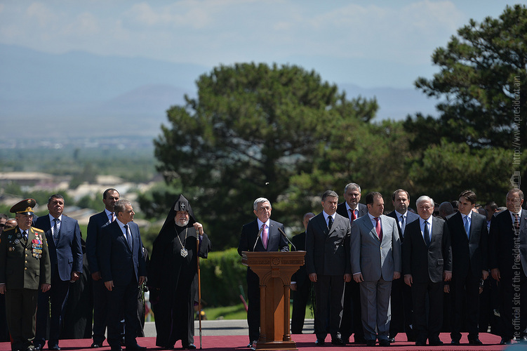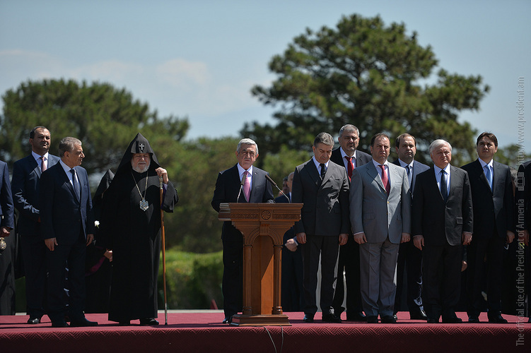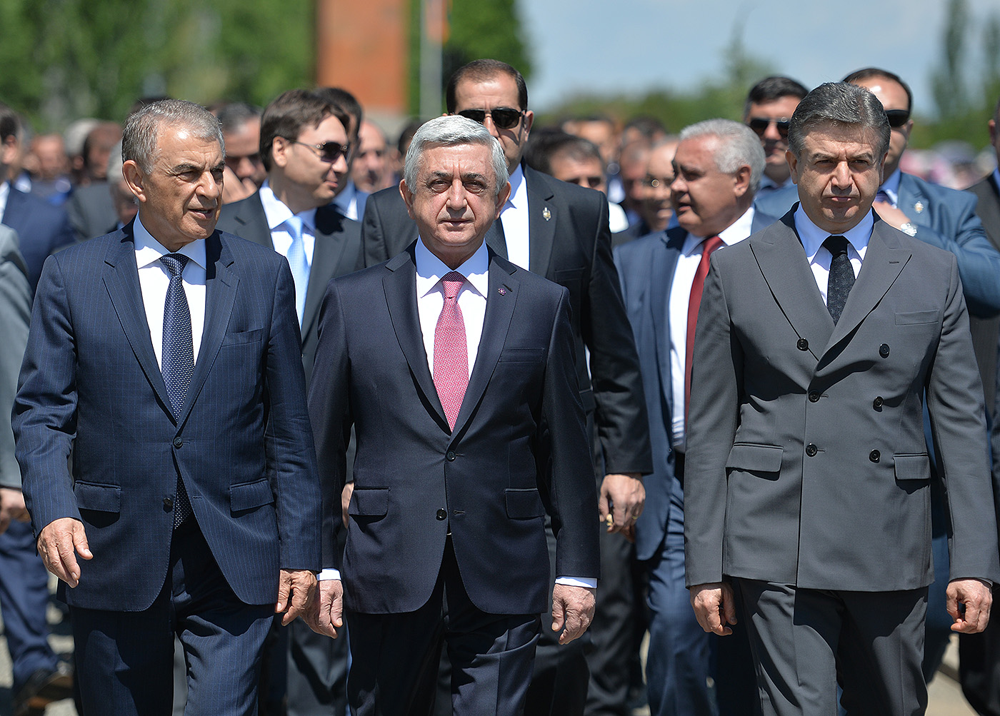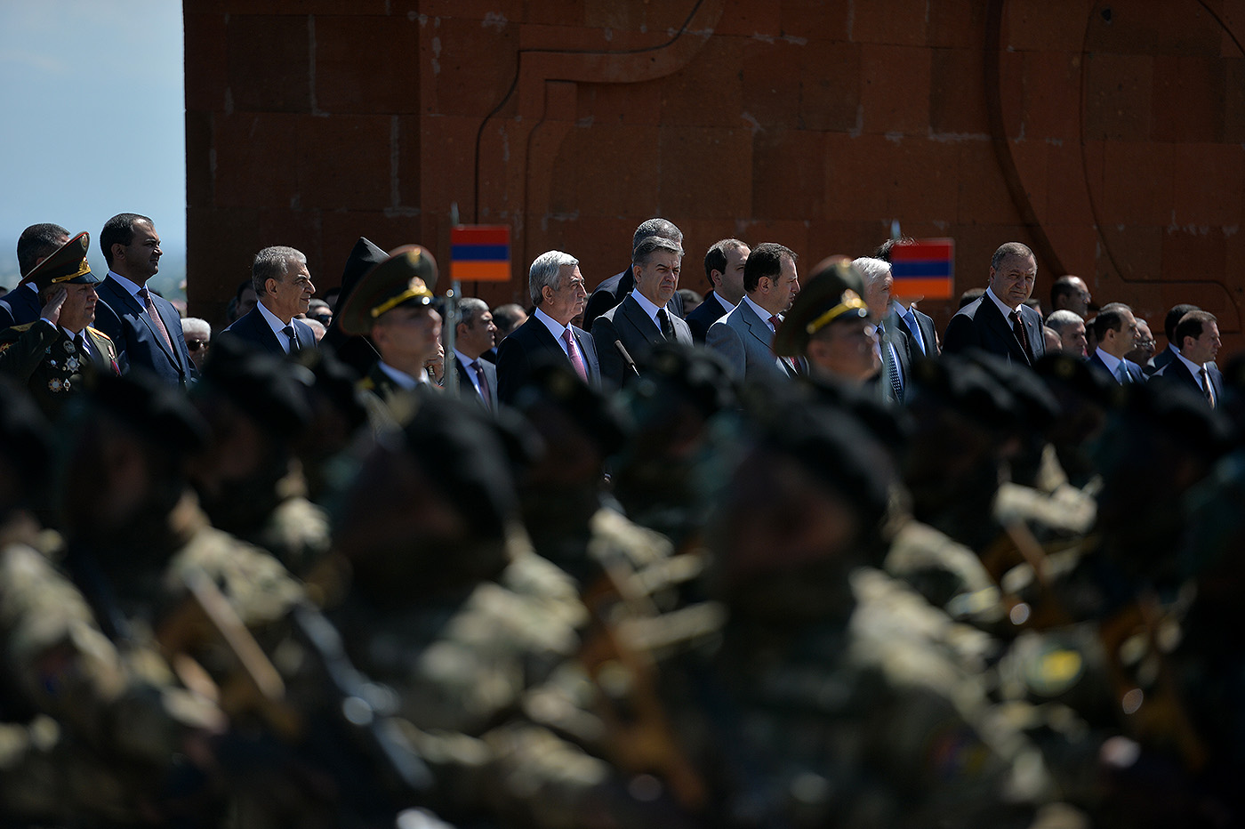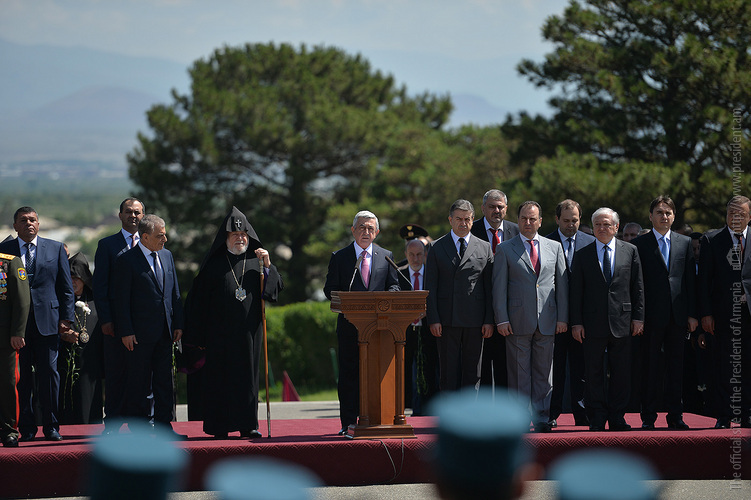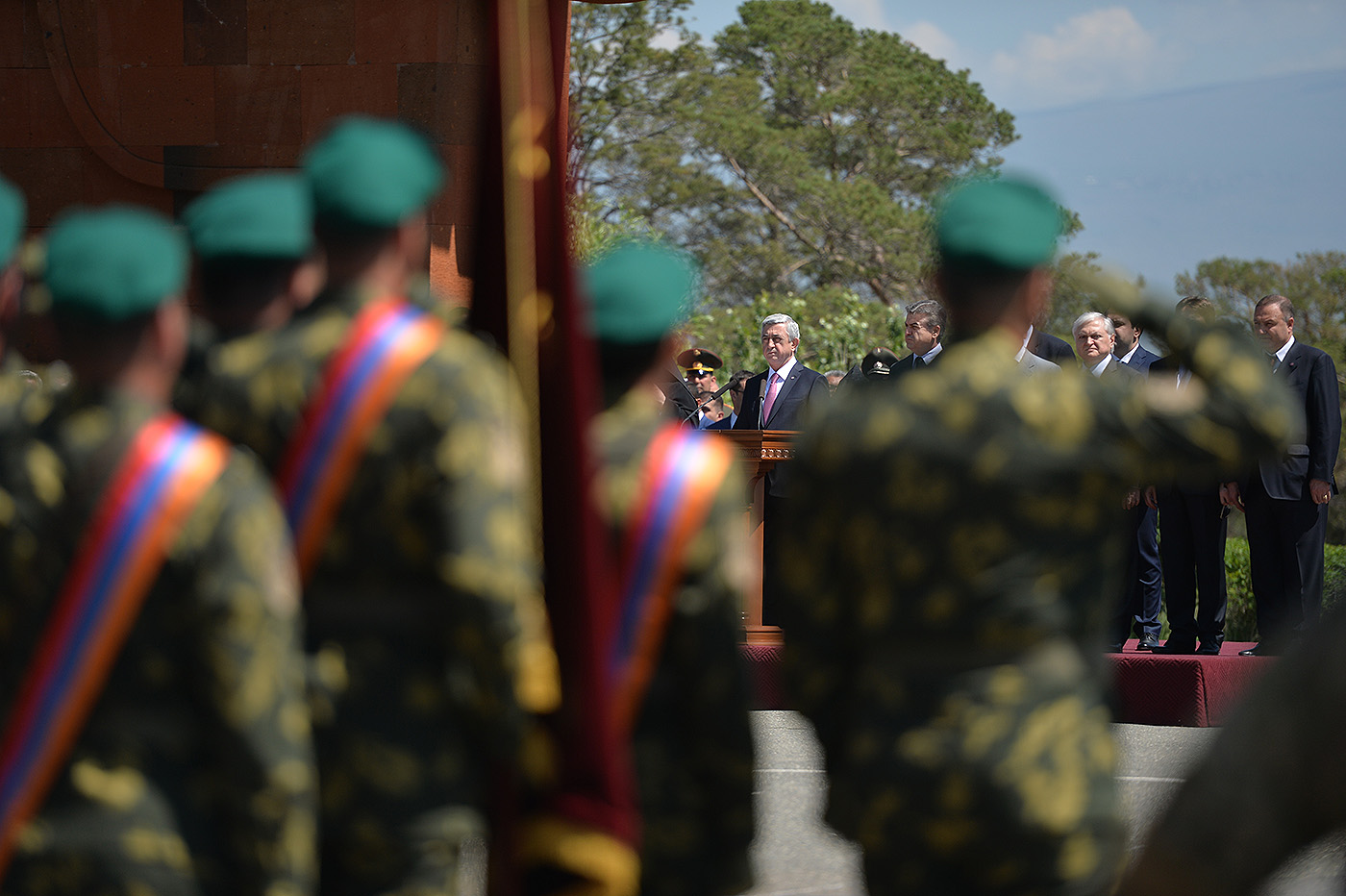 Նախագահ Սերժ Սարգսյանն այսօր Սարդարապատի հերոսամարտի հուշահամալիրում Ն.Ս.Օ.Տ.Տ. Գարեգին Բ Ամենայն Հայոց Կաթողիկոսի, Հանրապետության բարձրագույն ղեկավարության և հուշահամալիր այցելած հյուրերի հետ մասնակցել է Հանրապետության տոնին նվիրված տոնակատարությանը: Հանրապետության Նախագահը ծաղկեպսակ է դրել Սարդարապատի ճակատամարտի հերոսների հիշատակը հավերժացնող հուշակոթողին և հարգանքի տուրք մատուցել: Զորահանդեսի մասնակիցներին ողջունելուց և Պատվո նվագախմբի հանդիսավոր քայլերթը ընդունելուց հետո Նախագահը միջոցառման մասնակիցների հետ Սարդարապատի հուշահամալիրի Հայոց ազգագրության և ազատագրական պայքարի պատմության ազգային թանգարանում դիտել է «Գալէմքեարեաններ պղնձագործ վարպետաց սիրիահայոց դպրոց. փրկված և Հայրենիքին նվիրաբերված մշակութային արժեքներ» խորագրով ցուցահանդեսը: