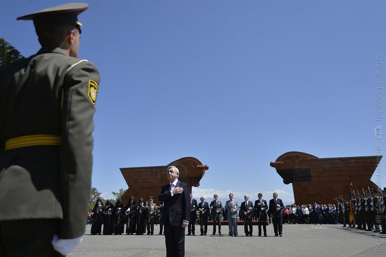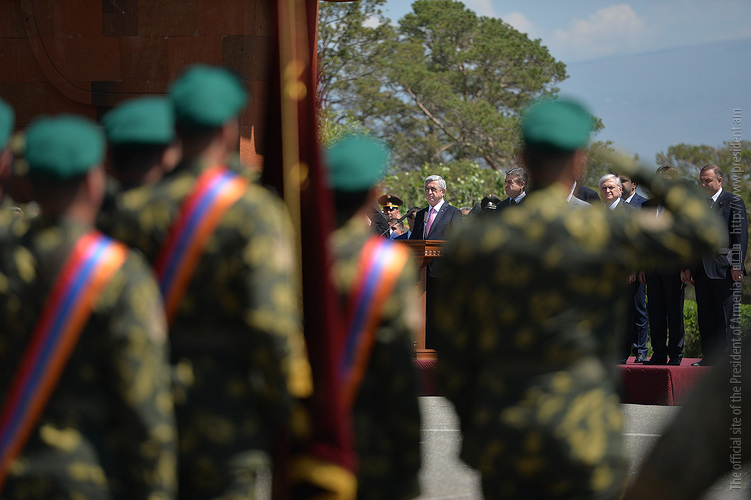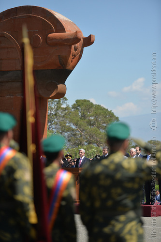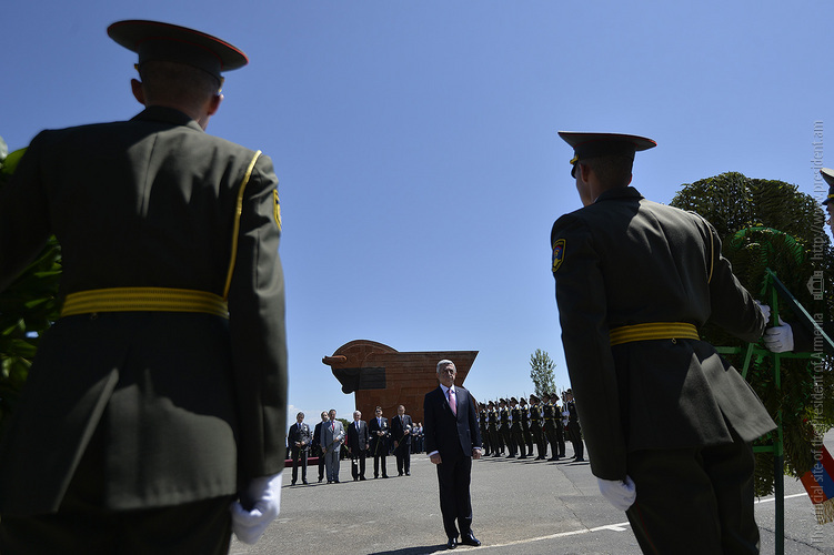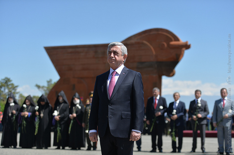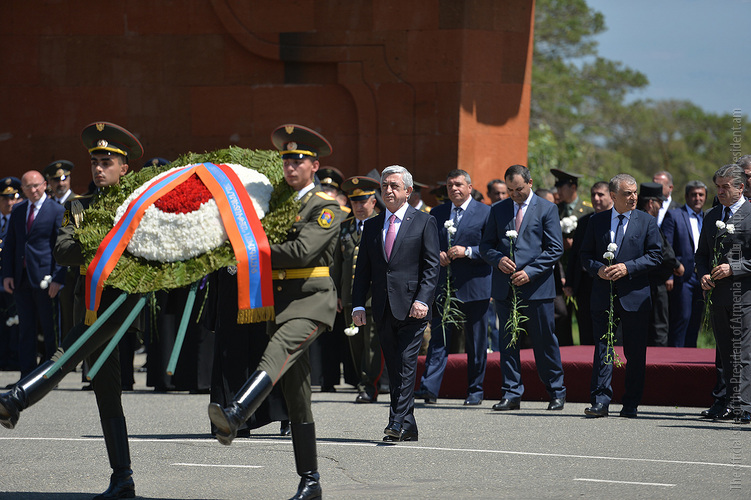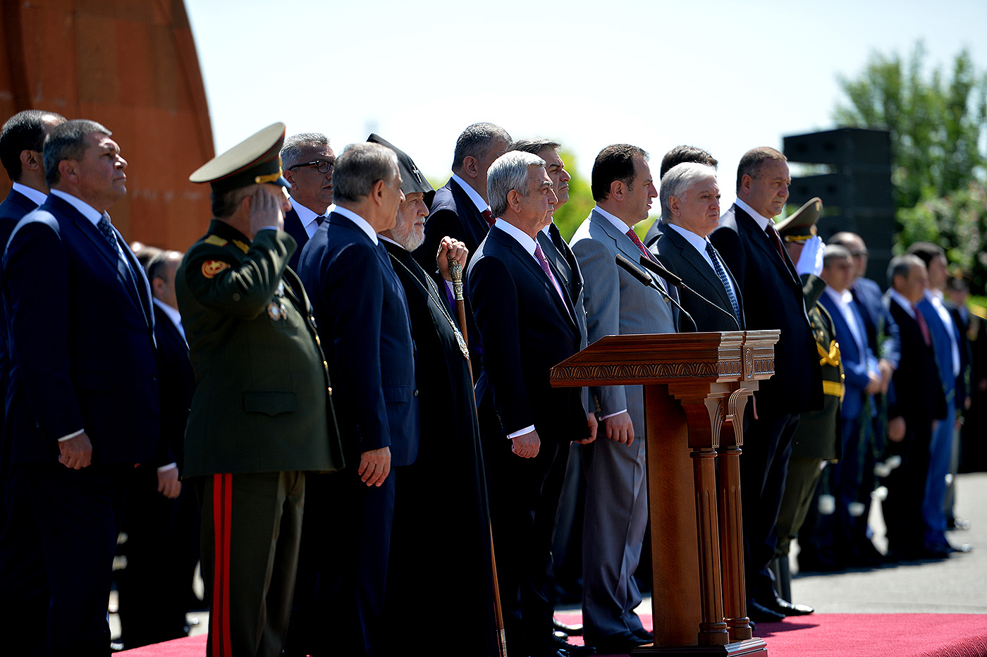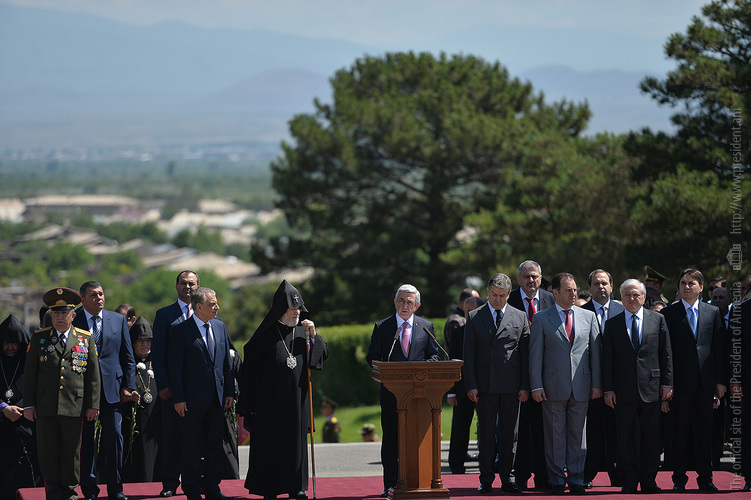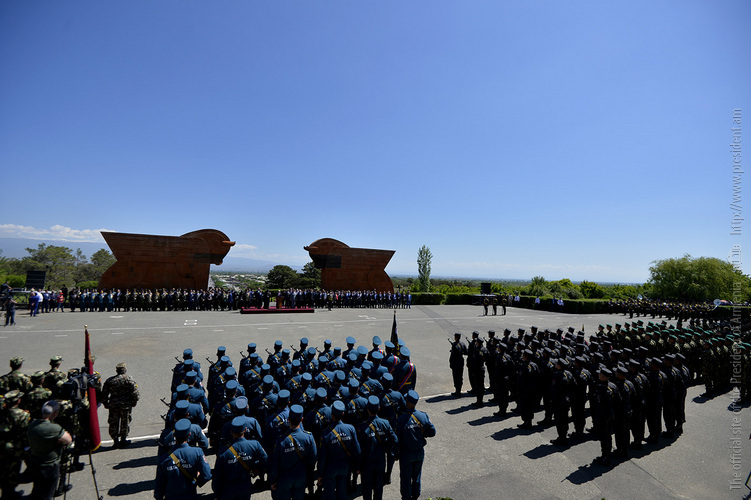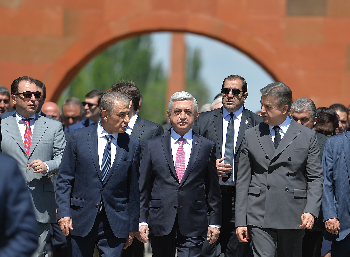 Նախագահ Սերժ Սարգսյանն այսօր Սարդարապատի հերոսամարտի հուշահամալիրում Ն.Ս.Օ.Տ.Տ. Գարեգին Բ Ամենայն Հայոց Կաթողիկոսի, Հանրապետության բարձրագույն ղեկավարության և հուշահամալիր այցելած հյուրերի հետ մասնակցել է Հանրապետության տոնին նվիրված տոնակատարությանը: Հանրապետության Նախագահը ծաղկեպսակ է դրել Սարդարապատի ճակատամարտի հերոսների հիշատակը հավերժացնող հուշակոթողին և հարգանքի տուրք մատուցել: Զորահանդեսի մասնակիցներին ողջունելուց և Պատվո նվագախմբի հանդիսավոր քայլերթը ընդունելուց հետո Նախագահը միջոցառման մասնակիցների հետ Սարդարապատի հուշահամալիրի Հայոց ազգագրության և ազատագրական պայքարի պատմության ազգային թանգարանում դիտել է «Գալէմքեարեաններ պղնձագործ վարպետաց սիրիահայոց դպրոց. փրկված և Հայրենիքին նվիրաբերված մշակութային արժեքներ» խորագրով ցուցահանդեսը:
