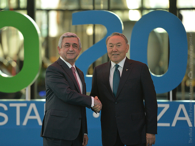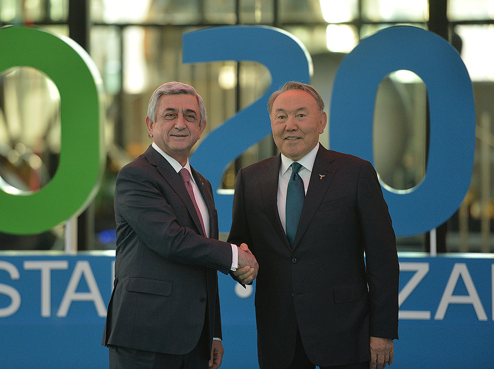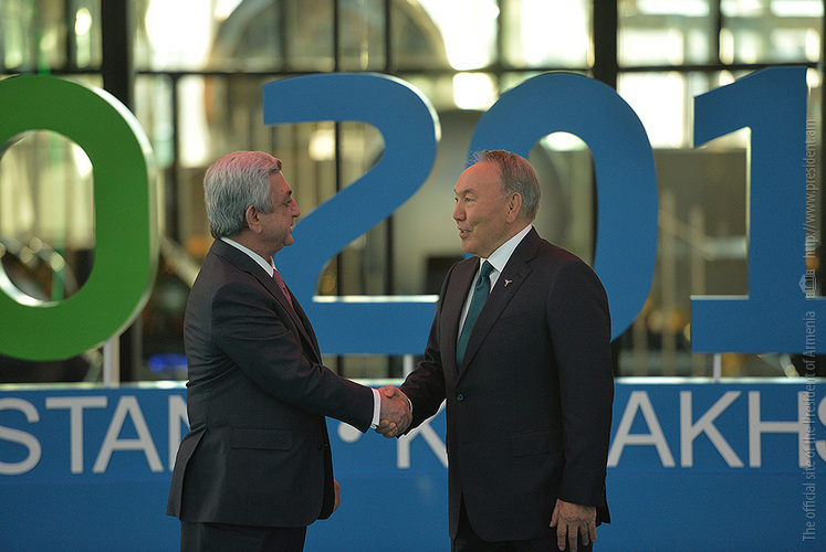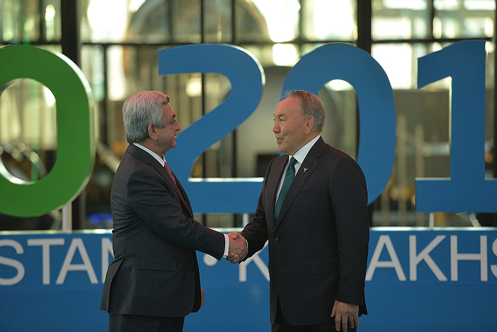 Աշխատանքային այցով Ղազախստանի Հանրապետություն ժամանած Նախագահ Սերժ Սարգսյանն այսօր երեկոյան հյուրընկալող երկրի նախագահ Նուրսուլթան Նազարբաևի, Աստանա այցելած այլ երկրների պատվիրակությունների ղեկավարների հետ «Համագումարների» կենտրոնում ներկա է գտնվել «Ապագայի էներգիա» խորագիրը կրող «Աստանա Էքսպո 2017» միջազգային մասնագիտացված ցուցահանդեսի բացման պաշտոնական արարողությանը: Մինչ այդ Նախագահ Սարգսյանը հյուրընկալվել է ցուցահանդեսային համալիրում, որտեղ մասնակից երկրների պատվիրակությունների ղեկավարների արարողակարգային համատեղ լուսանկարահանումից հետո, այցելել է «Նուր-Ալեմ» կոչվող կենտրոնական տաղավար, որից միևնույն հեռավորության վրա տեղակայված են բոլոր ազգային տաղավարները: