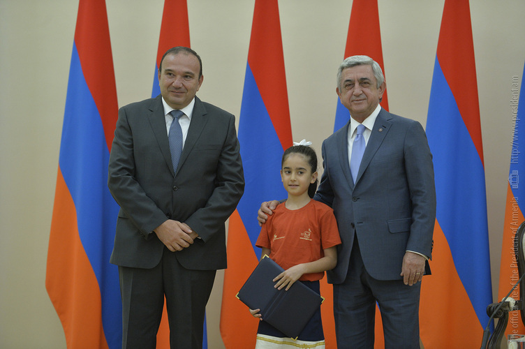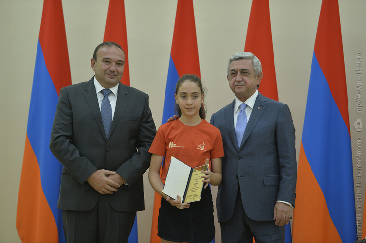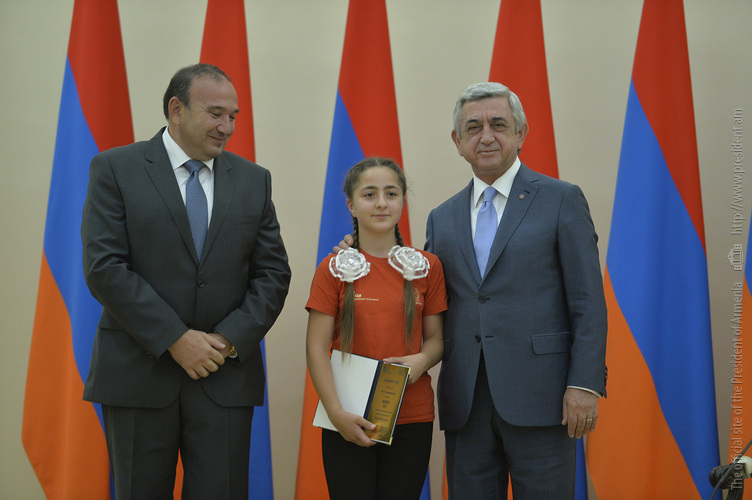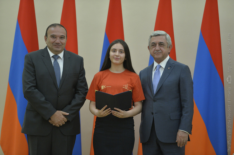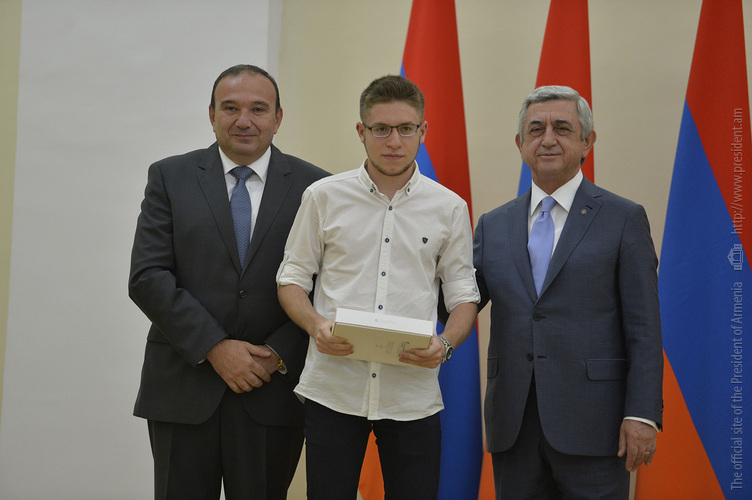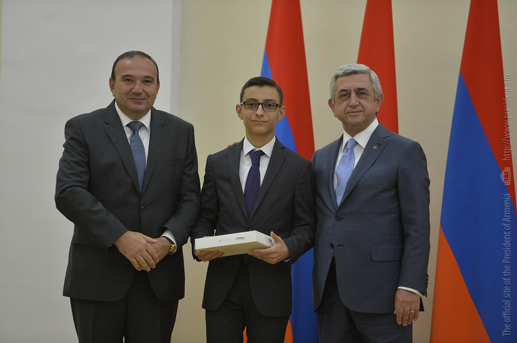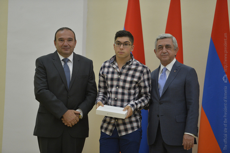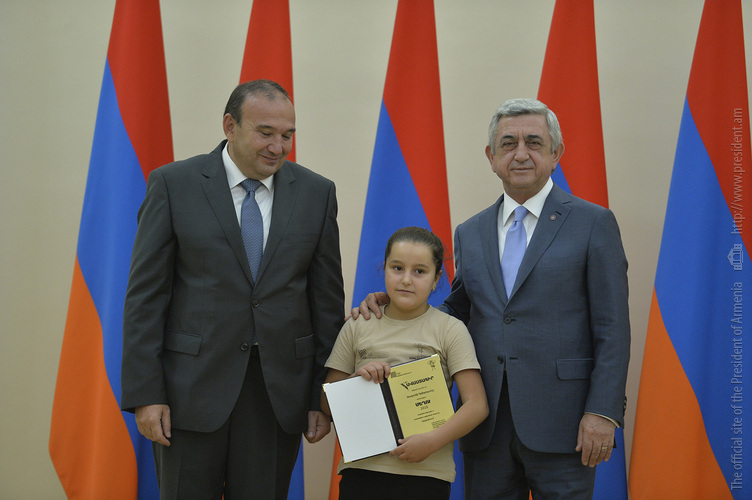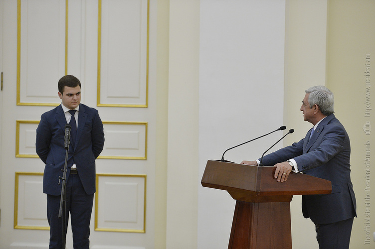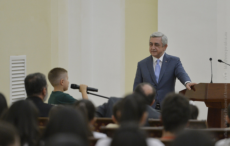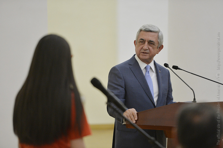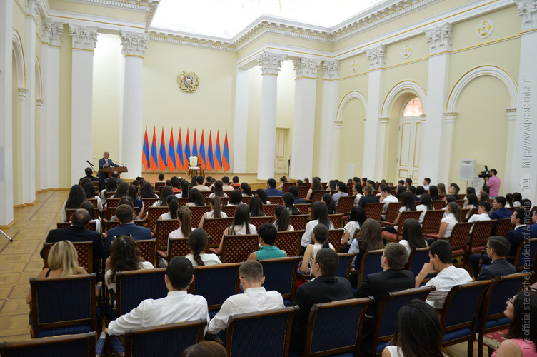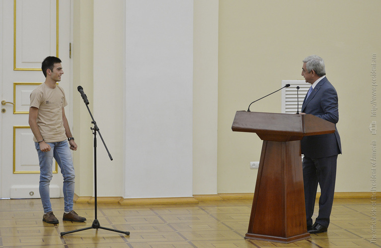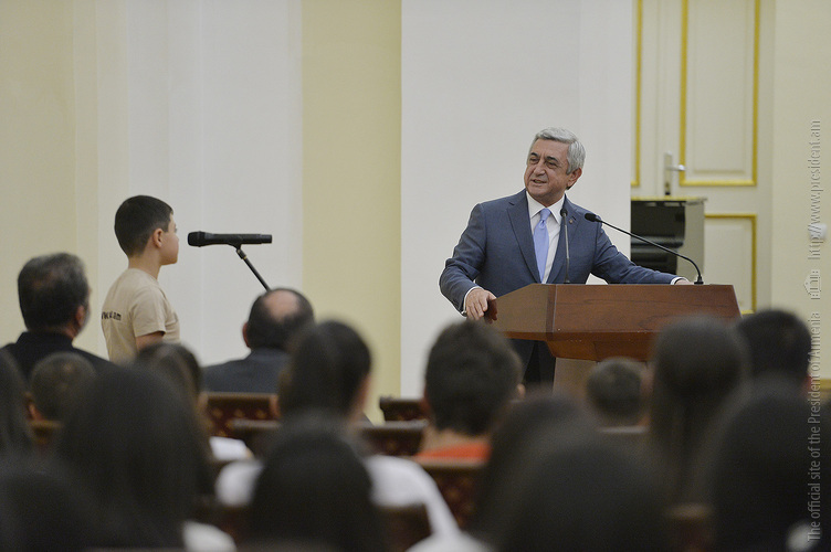 Մեծ սիրով ողջունում եմ ձեզ Հայաստանի Հանրապետության Նախագահի նստավայրում: Մեկ անգամ ևս ջերմորեն շնորհավորում եմ ձեզ համաշխարհային առարկայական օլիմպիադաներում, «Կենգուրու» և «Մեղու» մրցույթներում ունեցած հաջողությունների համար, անշուշտ նաև՝ դպրոցը գերազանցությամբ ավարտելու կապակցությամբ: Ձեր հաջողությունները մեր ողջ ժողովրդին ուժ ու եռանդ են հաղորդում, ինձ անձամբ ոգևորում և հավատ են ներշնչում մեր երկրի ապագայի հանդեպ: Այսպիսի հանդիպումներն արդեն դարձել են ավանդական, և պարզ է թե ինչու: Մենք ուզում ենք սրանով ընդգծել, որ մենք մեր երկրի ապագան կապում են գիտության և կրթության զարգացման հետ ու նաև ցանկանում ենք, որպեսզի ձեր օրինակը վարակիչ լինի ձեր հասակակիցների, ձեր հեռու ու մոտիկ բարեկամների, ձեր դասընկերների համար: Գիտության և ուսման նկատմամբ ծարավը, եթե այն կարելի է լավ առումով վարակ համարել, երբեք չի կարելի կանխարգելել, ընդհակառակը՝ մենք ցանկանում ենք, որ այդ վարակը տարածվի ամենուր: