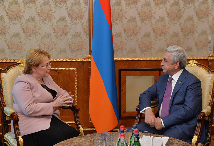 Նախագահ Սերժ Սարգսյանն այսօր ընդունել է Ռուսաստանի Դաշնության առողջապահության նախարար Վերոնիկա Սկվորցովային, ով Հայաստան է ժամանել մասնակցելու Հայ-ռուսական առողջապահական երրորդ համաժողովին: Հանրապետության Նախագահը ողջունել է հյուրին և կարևորել արդեն ավանդական դարձած առողջապահական համաժողովի անցկացումը, որը, Նախագահի համոզմամբ, շատ լավ հարթակ է երկու երկրների պետական ու մասնավոր առողջապահական կազմակերպությունների միջև փոխգործակցության զարգացման, ոլորտի արդիական հարցերի շուրջ մասնագիտական քննարկումների և փորձի փոխանակման համար: