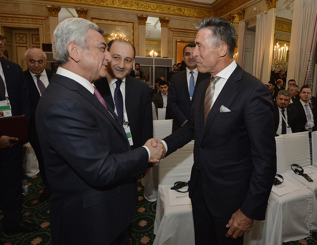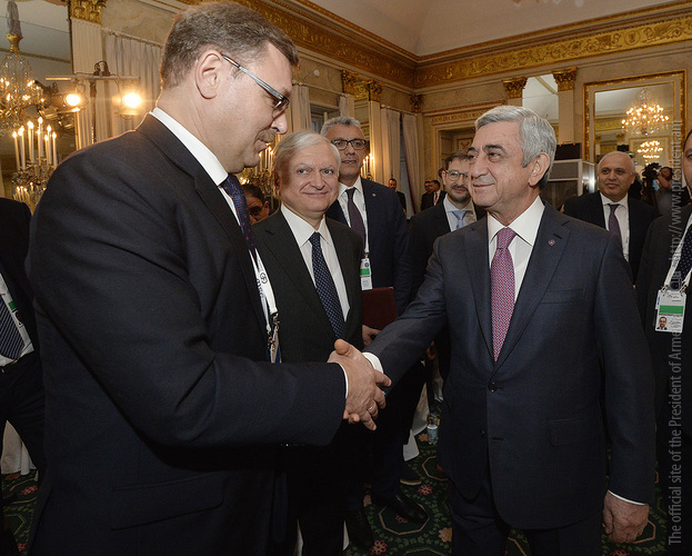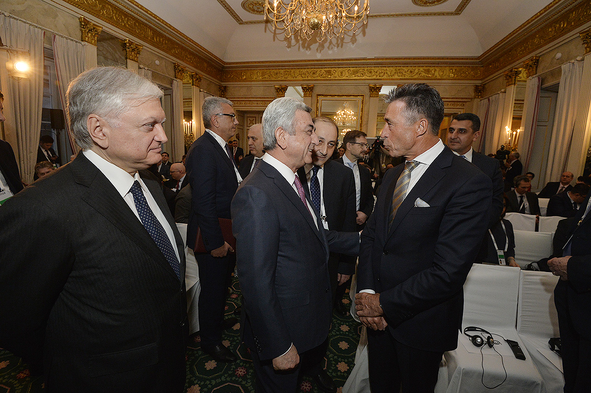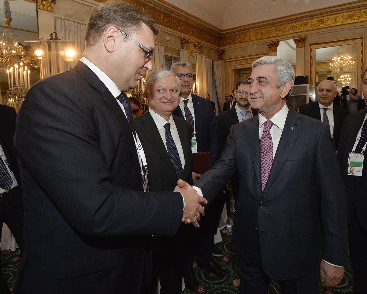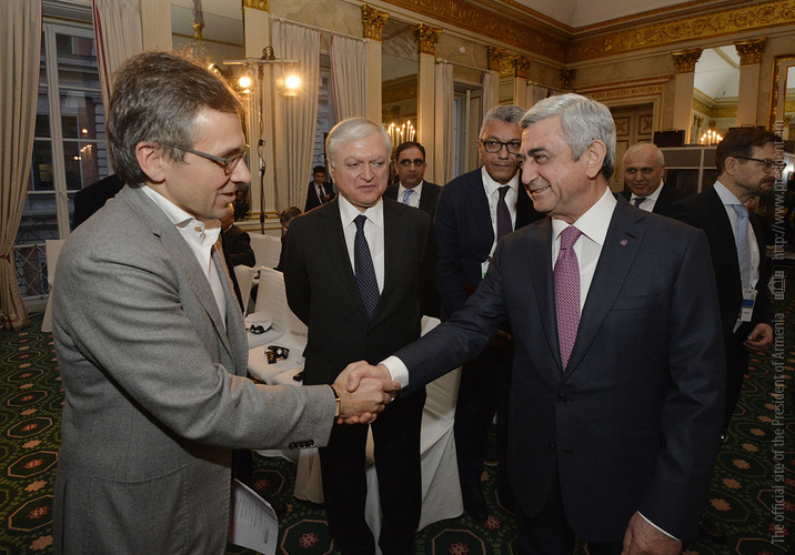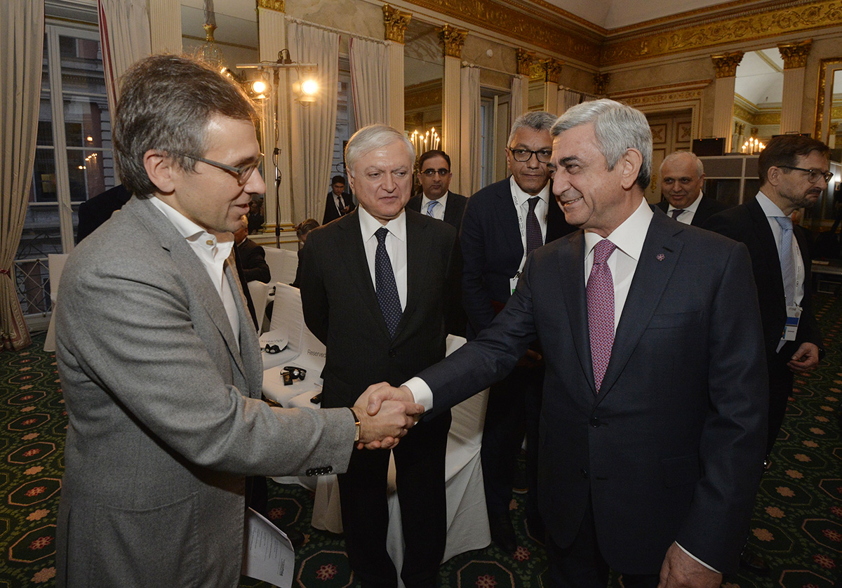 Սերժ Սարգսյանն անդրադարձել է աշխարհաքաղաքական ներկայիս պայմաններում Հայաստանի կողմից վարվող արտաքին քաղաքականությանը, ինտեգրացիոն գործընթացների շրջանակներում Հայաստանի արդյունավետ փոխգործակցությանը ԵԱՏՄ-ի և ԵՄ-ի հետ, անվտանգության տեսանկյունից տարածաշրջանի խնդիրներին և մարտահրավերներին, այդ համատեքստում` ԵԱՀԿ Մինսկի խմբի համանախագահների միջնորդությամբ Լեռնային Ղարաբաղի հակամարտության կարգավորման բանակցային գործընթացին ու դրա առաջմղմանն իր ապակառուցողական քաղաքականությամբ խոչընդոտող Ադրբեջանի իշխանությունների քայլերին: Նախագահը խոսել է նաև Եվրոպայի անվտանգության և համագործակցության կազմակերպության շրջանակում ստանձնված ու բանակցված հանձնառությունների մասին, ընդգծելով, որ դեռևս նախորդ դարի 70-ական թվականներին սկիզբ առած Հելսինկյան գործընթացի նպատակը Եվրոպայում անվտանգության և համագործակցության ամրապնդումն էր` ապահովելով ժողովուրդների համերաշխությունը, արժանապատիվ և իրավահավասար համակեցությունը, որը, Նախագահ Սարգսյանի գնահատմամբ, այսօր էլ շարունակում է արդիական մնալ։