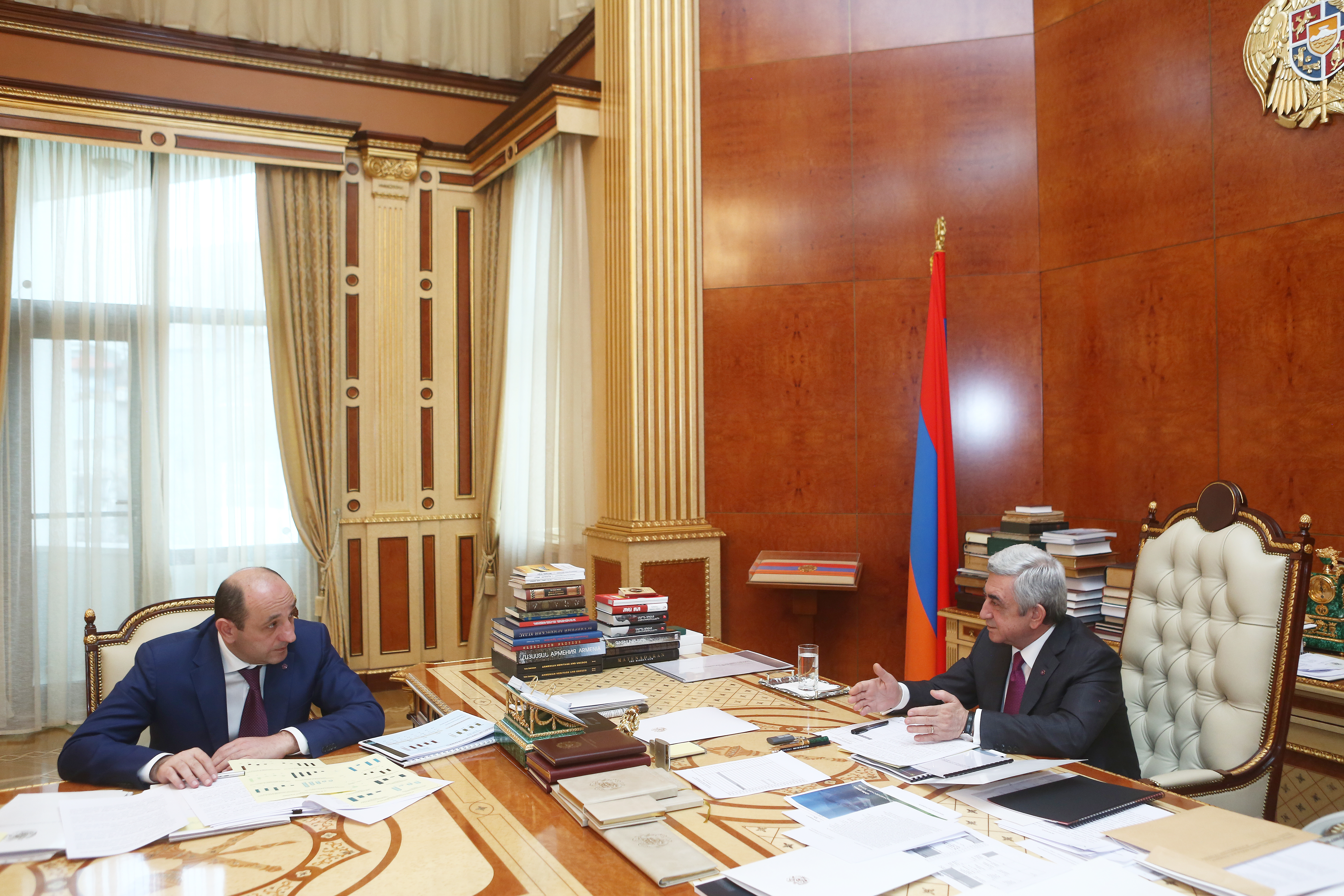 Հանրապետության Նախագահի հետ աշխատանքային հանդիպման ժամանակ տնտեսական զարգացման և ներդրումների նախարար Սուրեն Կարայանն այսօր զեկուցել է նախորդ հանդիպման ժամանակ Նախագահից ստացած հանձնարարականների կատարման ուղղությամբ իրականացված աշխատանքները, դրանց արդյունքները և նախարարության գերակա խնդիրներն ու 2018թ. ծրագրերը: