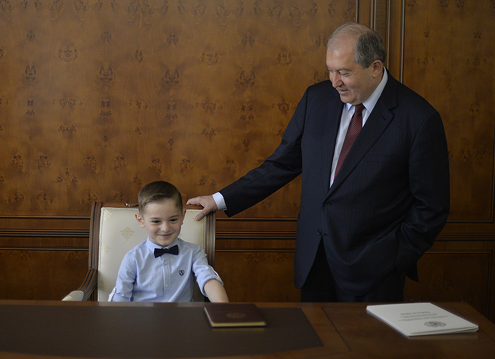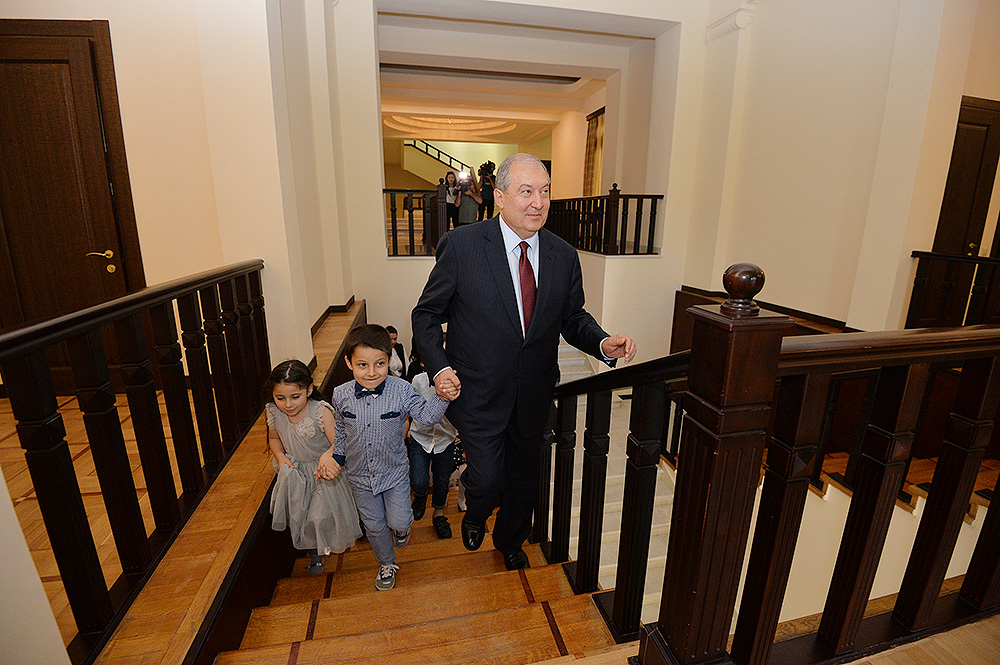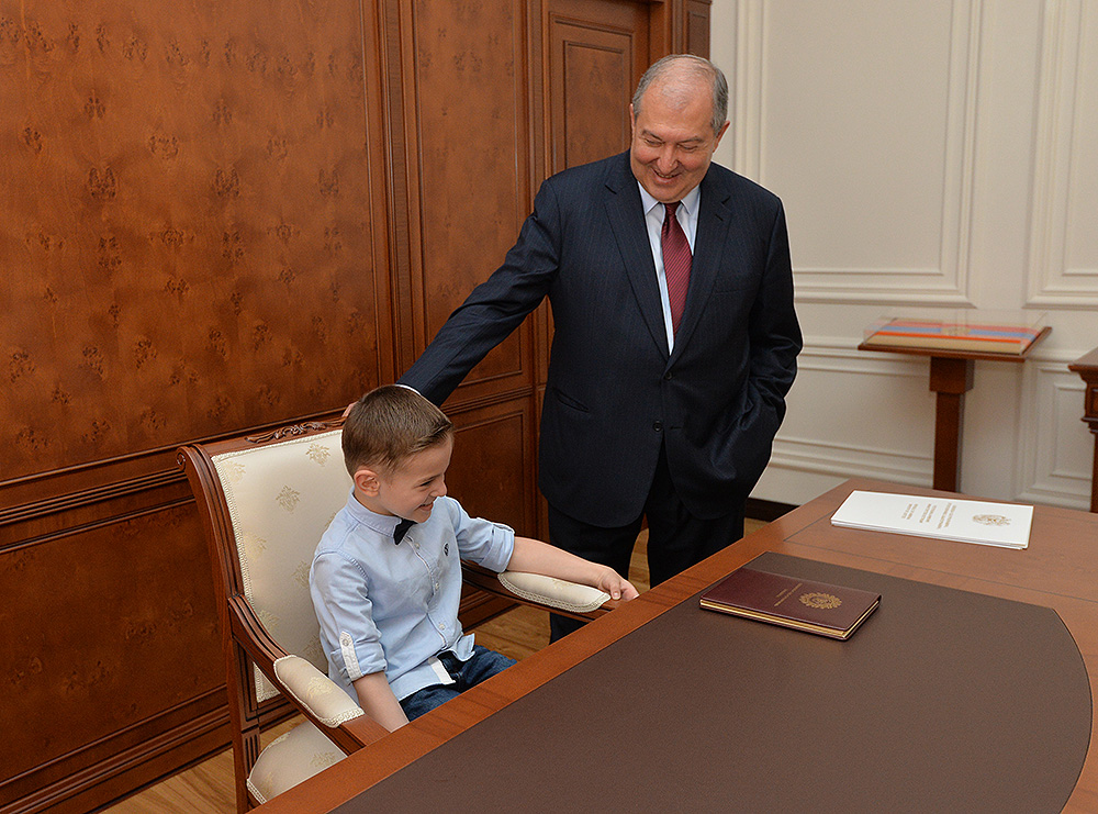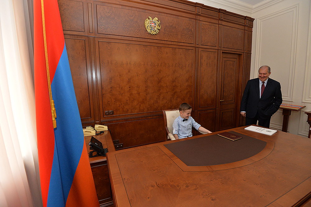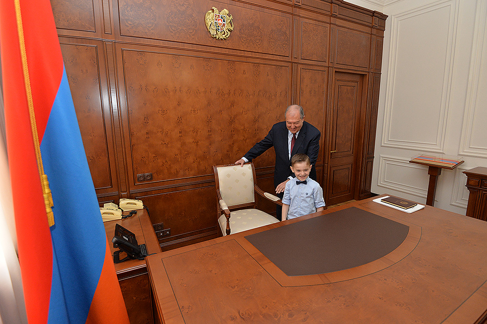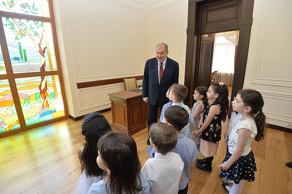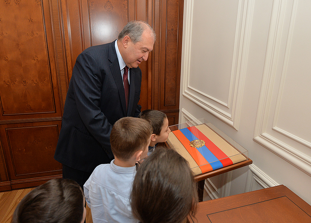 Իր փոքրիկ հյուրերին Նախագահ Արմեն Սարգսյանն այսօր նախ ցույց է տվել իր աշխատասենյակը, որտեղ զրուցել է նրանց հետ, ծանոթացրել նախագահական իշխանության խորհրդանշանի նշանակությանը և պատմությանը: