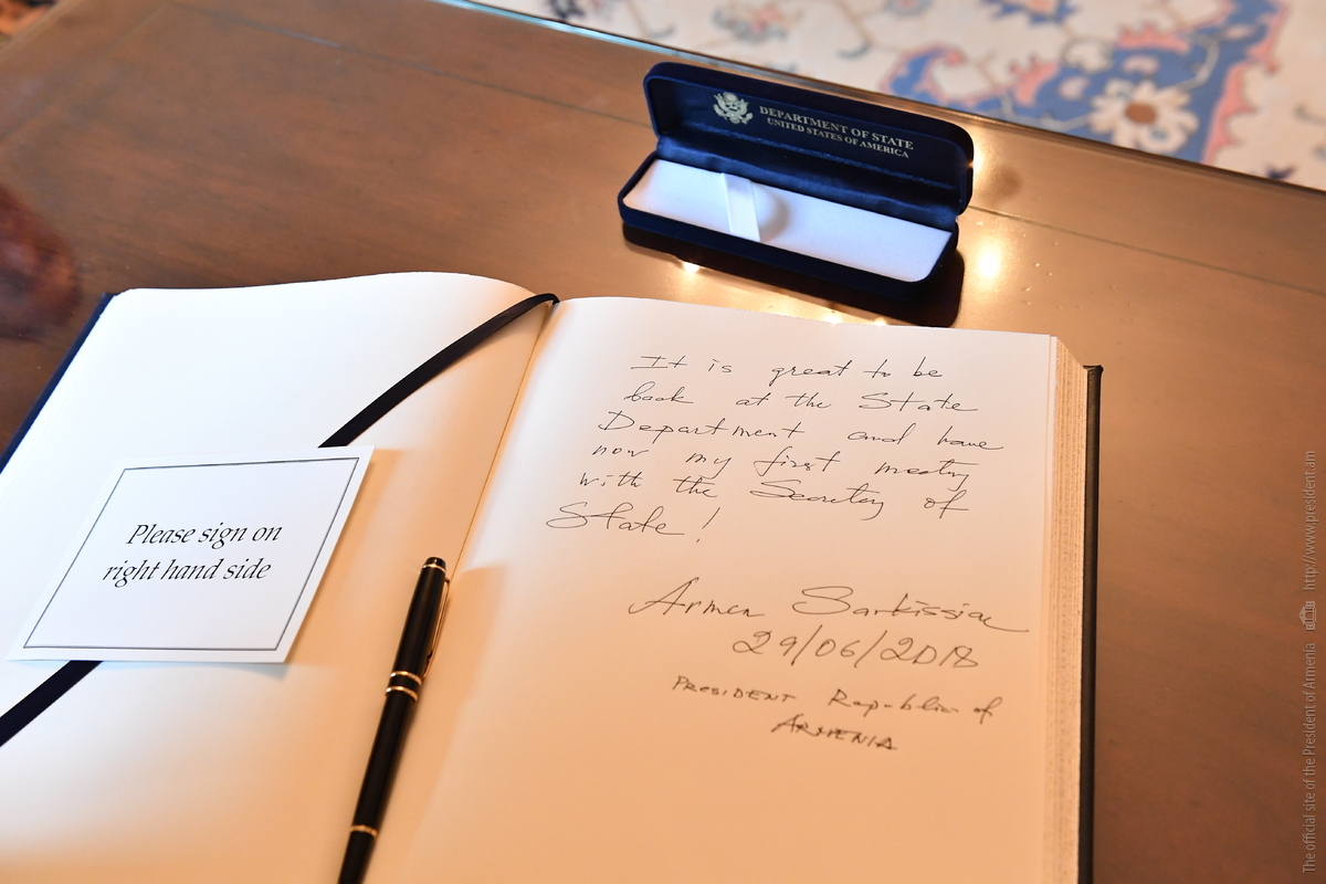 Հանրապետության նախագահը գրառում է կատարել նաեւ ԱՄՆ պետքարտուղարության հյուրերի գրքում։