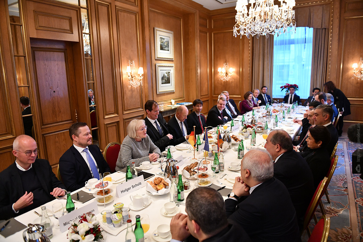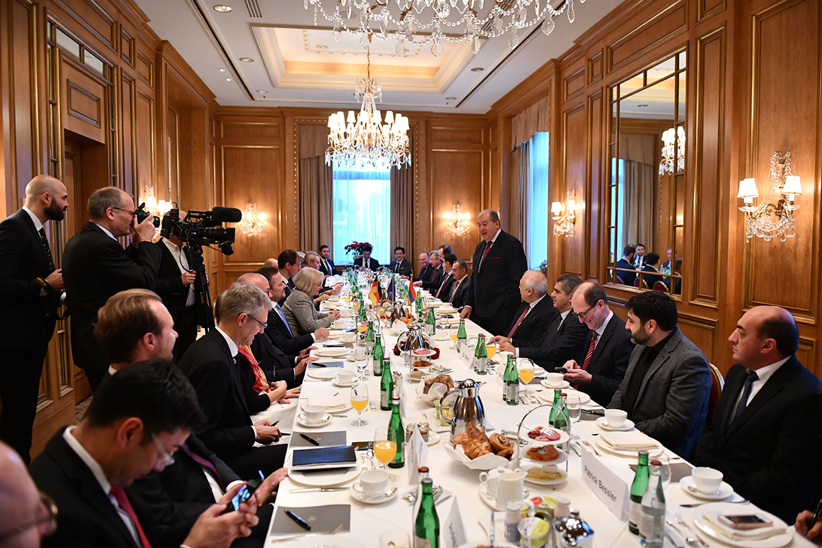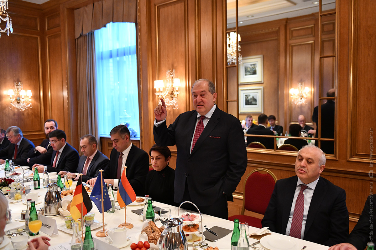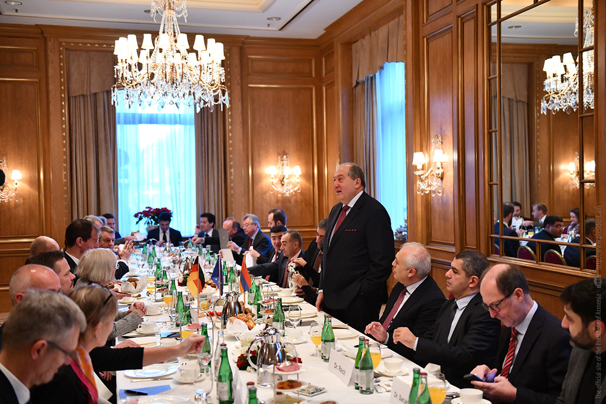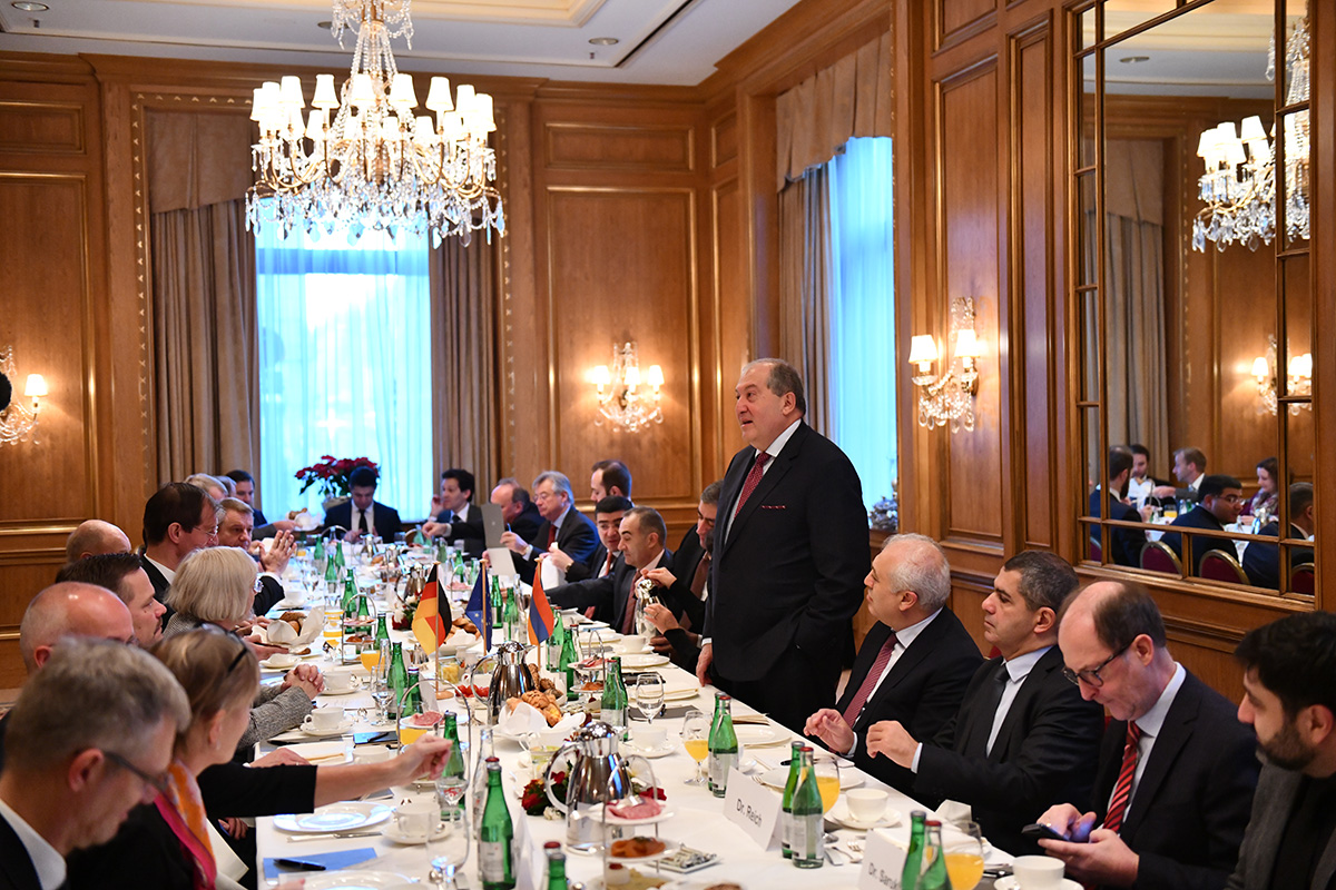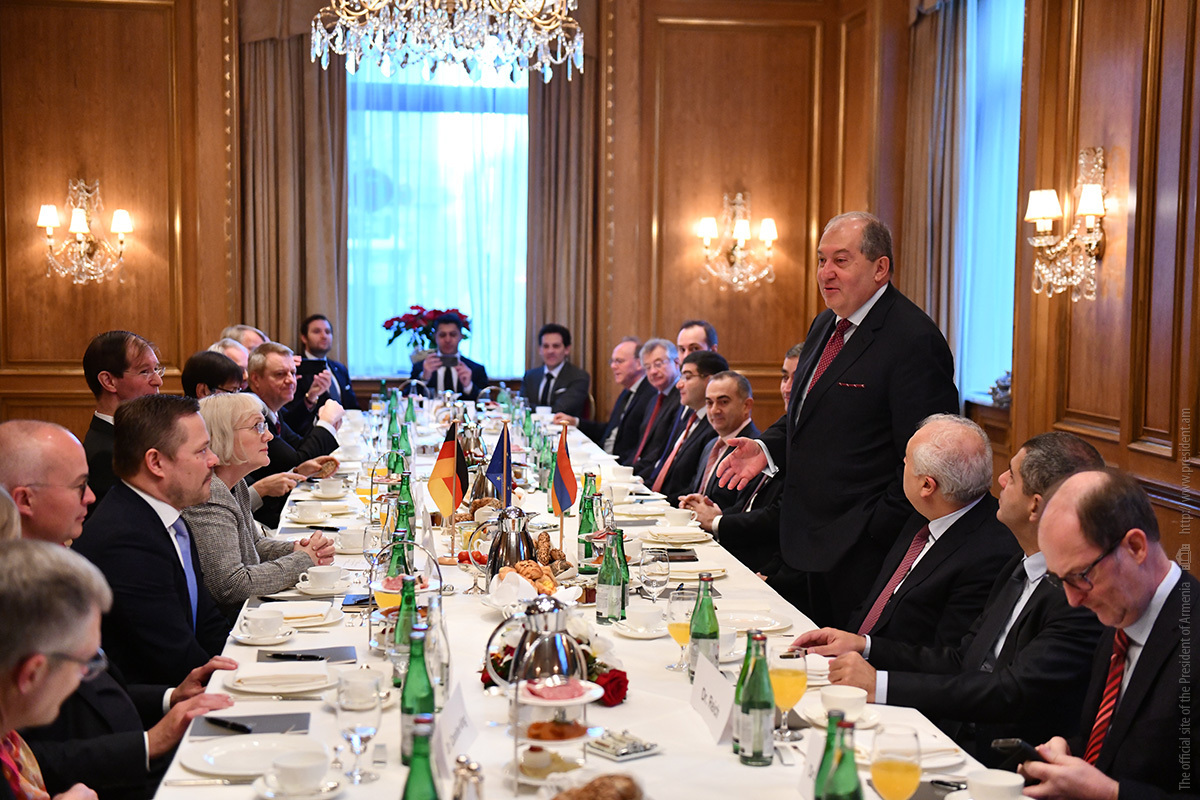 Պաշտոնական այցով Գերմանիայի Դաշնային Հանրապետությունում գտնվող նախագահ Արմեն Սարգսյանը նոյեմբերի 28-ին աշխատանքային նախաճաշ է ունեցել գերմանական մի շարք առաջատար ընկերությունների ղեկավարների հետ, որոնք գործունեություն են ծավալում Հայաստանում կամ հետաքրքրված են Հայաստանի հետ համագործակցությամբ: Հանդիպումը կազմակերպվել է Գերմանիայում ՀՀ դեսպանության, OWC հրատարակչության, Գերմանիայի տնտեսության Արևելյան հանձնաժողովի ու «Արևելյան Եվրոպա. մանր ու միջին տնտեսվարողների միության» կողմից։