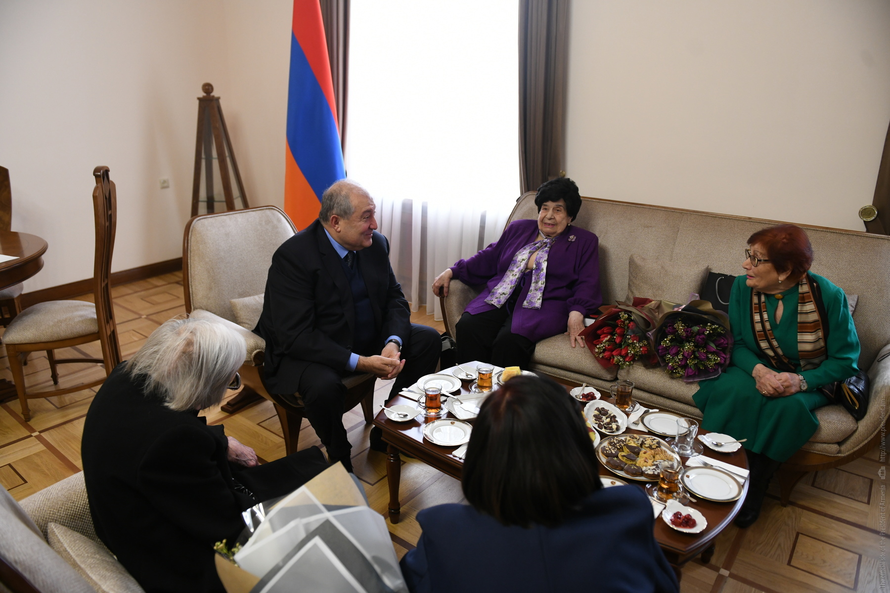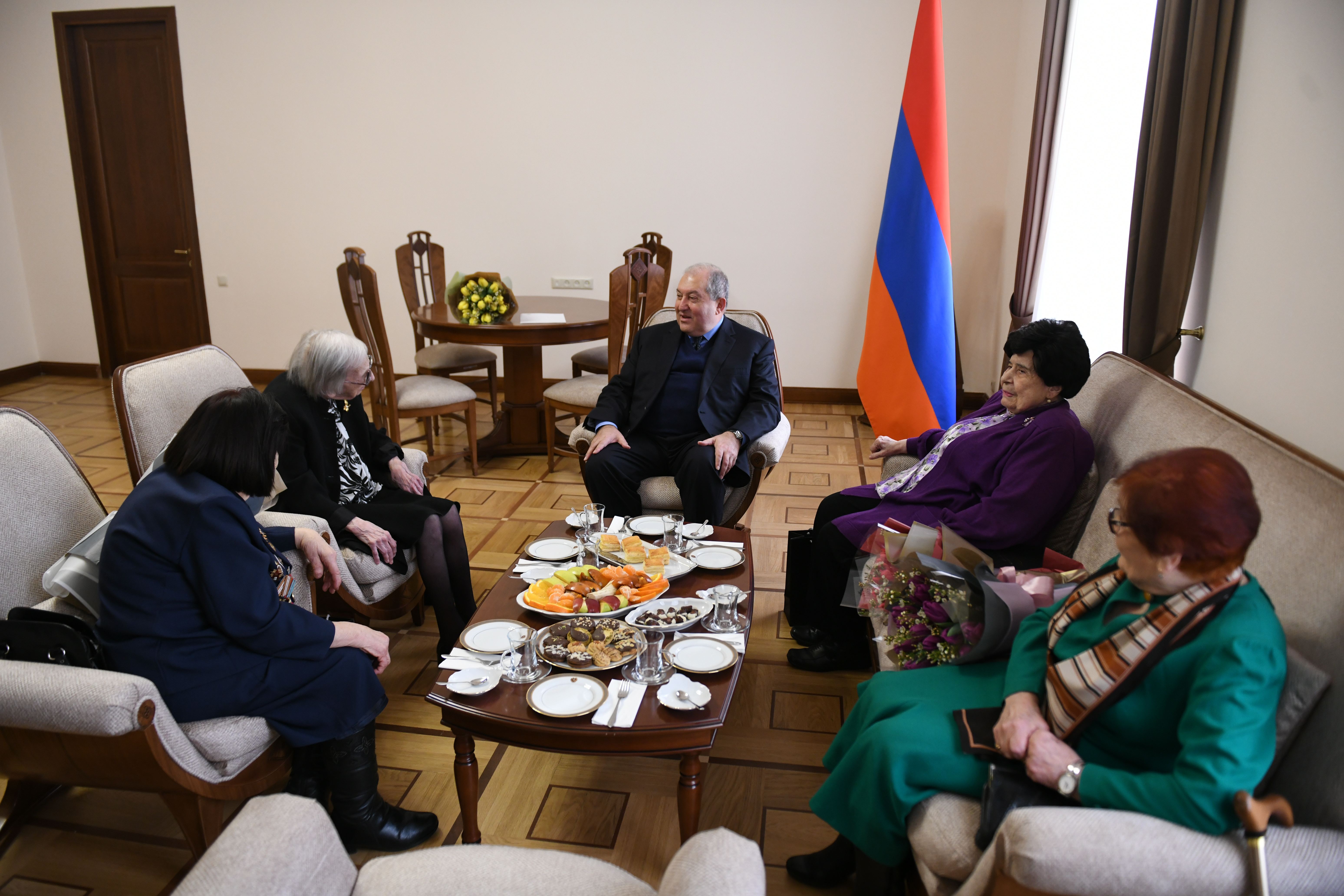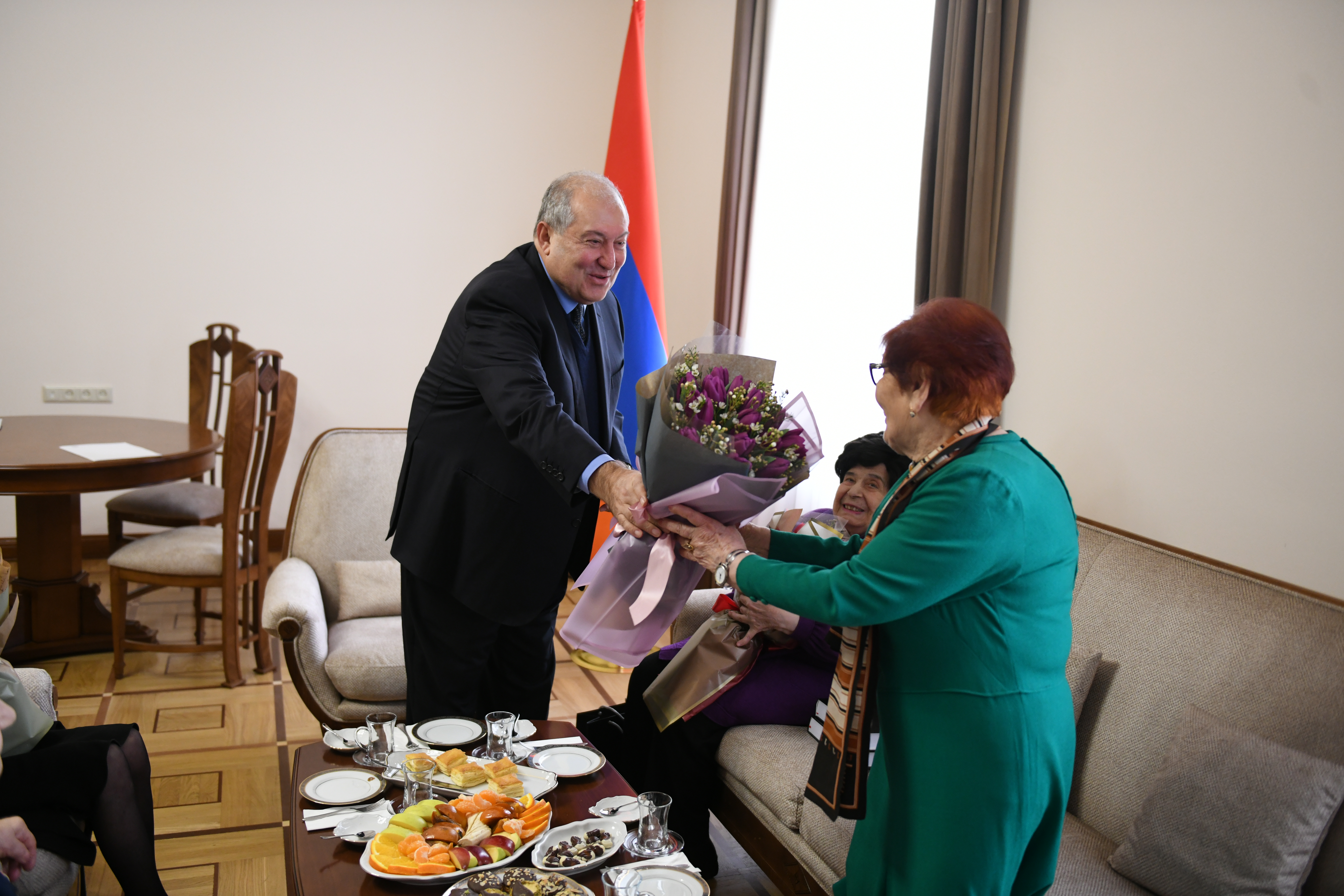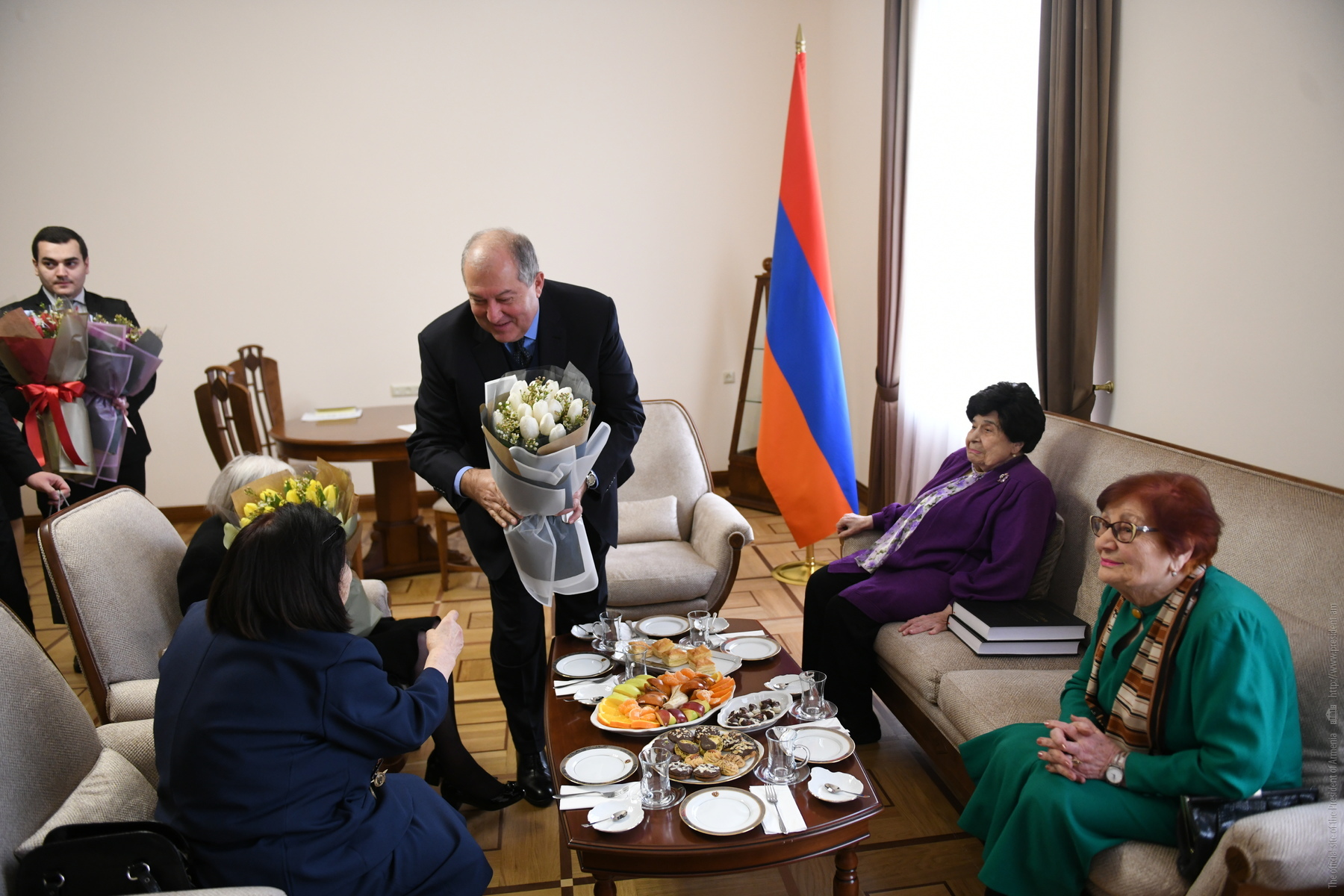 Հանրապետության նախագահ Արմեն Սարգսյանը Կանանց տոնի նախօրեին նախագահական նստավայրում հյուրընկալել է ժողովրդագետ, բանահավաք, ցեղասպանագետ, ՀՀ ԳԱԱ հնագիտության և ազգագրության ինստիտուտի առաջատար գիտաշխատող, բանասիրական գիտությունների դոկտոր, պրոֆեսոր, ՀՀ գիտության վաստակավոր գործիչ Վերժինե Սվազլյանին, պատմաբան, թարգմանիչ, պատմական գիտությունների թեկնածու, Երկրորդ Համաշխարհային պատերազմի մասնակից, Մատենադարանի ավագ գիտաշխատող Մարգարիտա Դարբինյանին, կոմպոզիտոր, մանկավարժ, ՀՀ ժողովրդական արտիստ Գեղունի Չթչյանին, Երկրորդ Համաշխարհային պատերազմի վետերան Ռոզալիա Աբգարյանին: