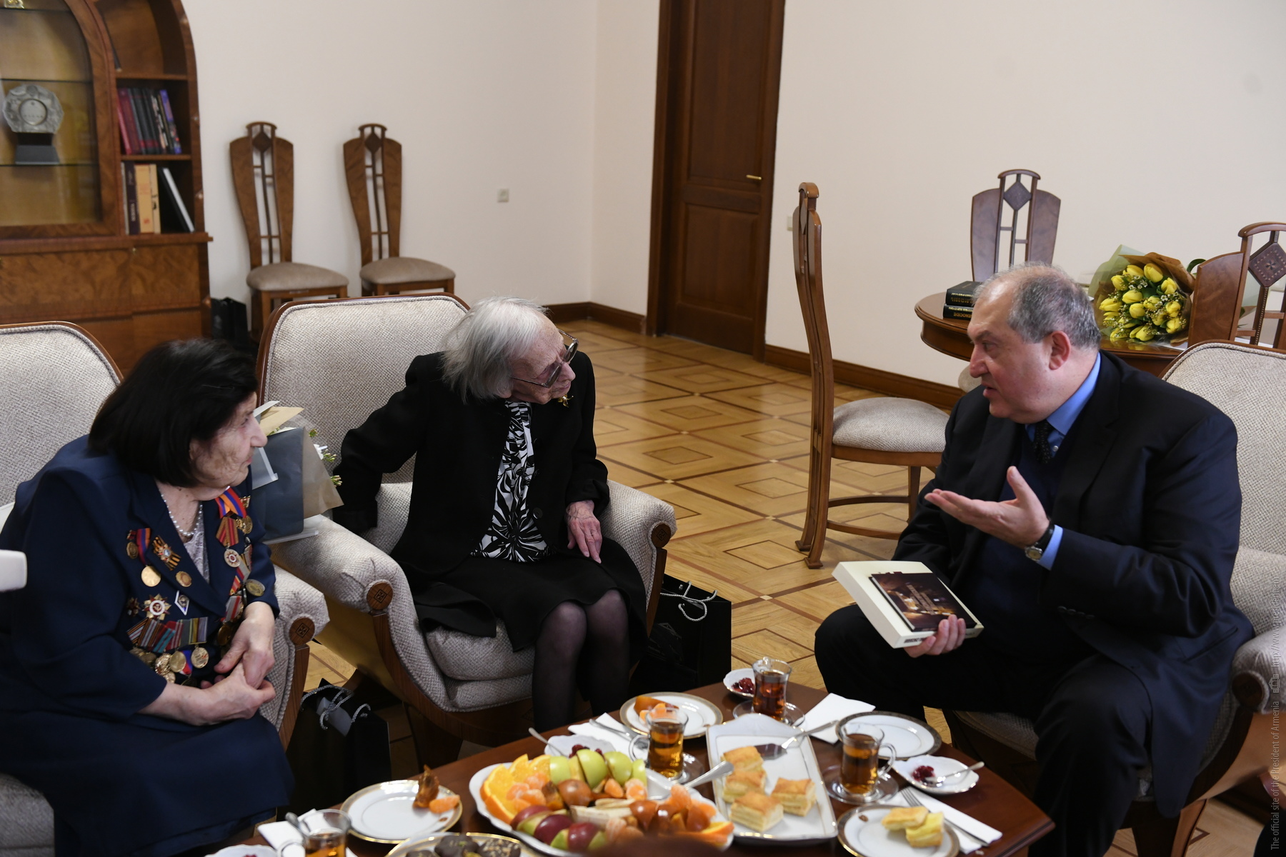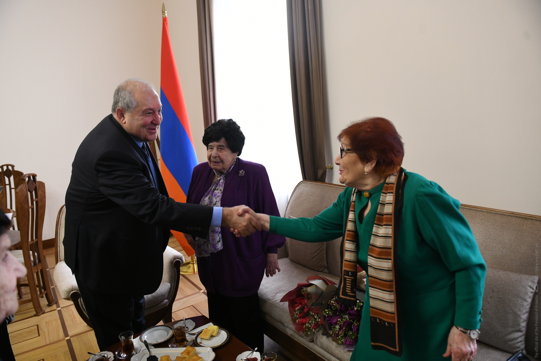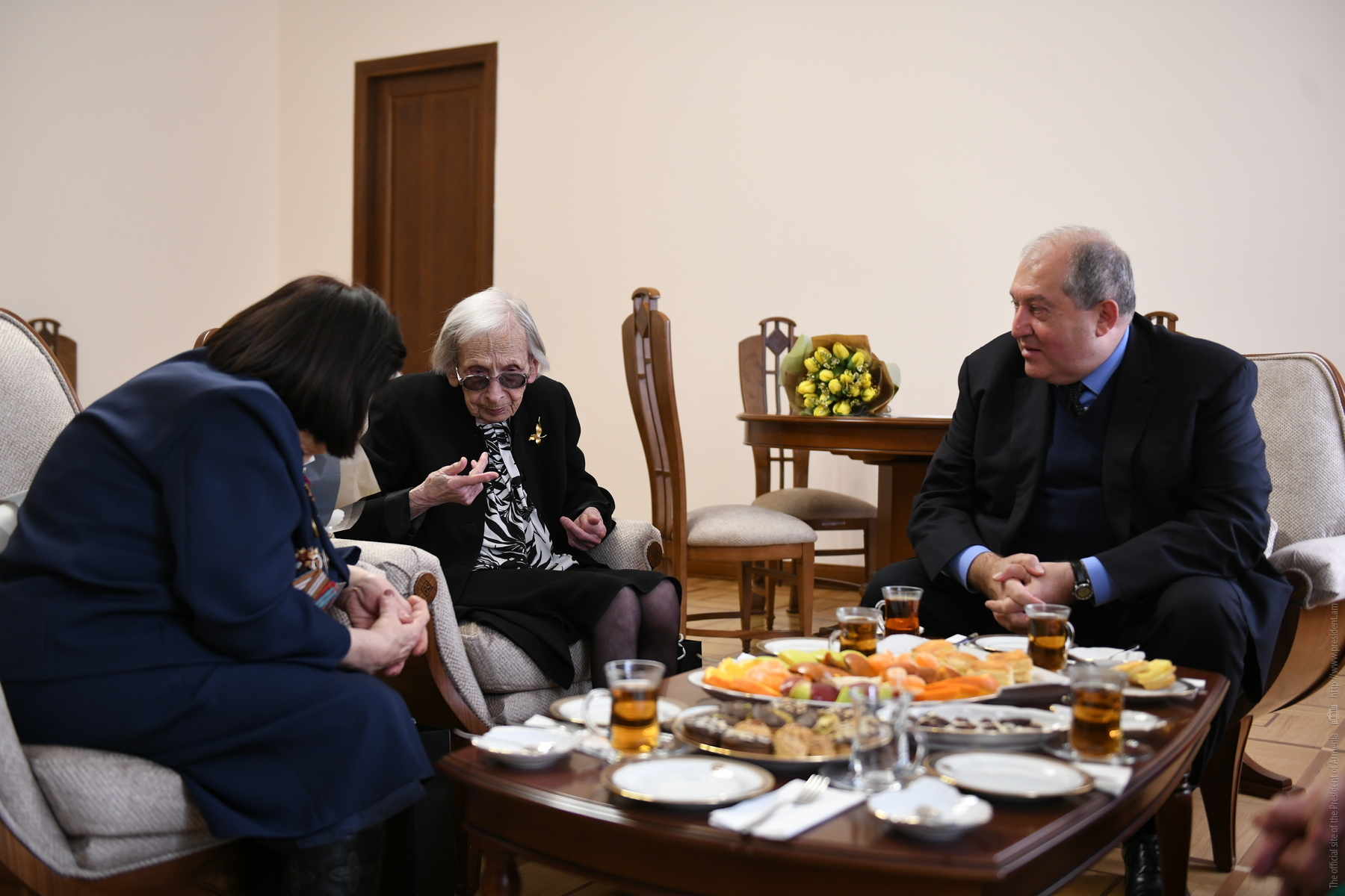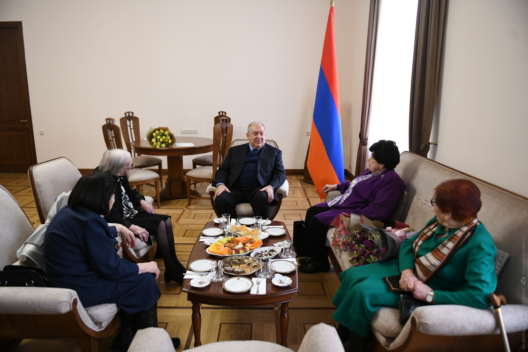 Հանրապետության նախագահ Արմեն Սարգսյանը Կանանց տոնի նախօրեին նախագահական նստավայրում հյուրընկալել է ժողովրդագետ, բանահավաք, ցեղասպանագետ, ՀՀ ԳԱԱ հնագիտության և ազգագրության ինստիտուտի առաջատար գիտաշխատող, բանասիրական գիտությունների դոկտոր, պրոֆեսոր, ՀՀ գիտության վաստակավոր գործիչ Վերժինե Սվազլյանին, պատմաբան, թարգմանիչ, պատմական գիտությունների թեկնածու, Երկրորդ Համաշխարհային պատերազմի մասնակից, Մատենադարանի ավագ գիտաշխատող Մարգարիտա Դարբինյանին, կոմպոզիտոր, մանկավարժ, ՀՀ ժողովրդական արտիստ Գեղունի Չթչյանին, Երկրորդ Համաշխարհային պատերազմի վետերան Ռոզալիա Աբգարյանին: