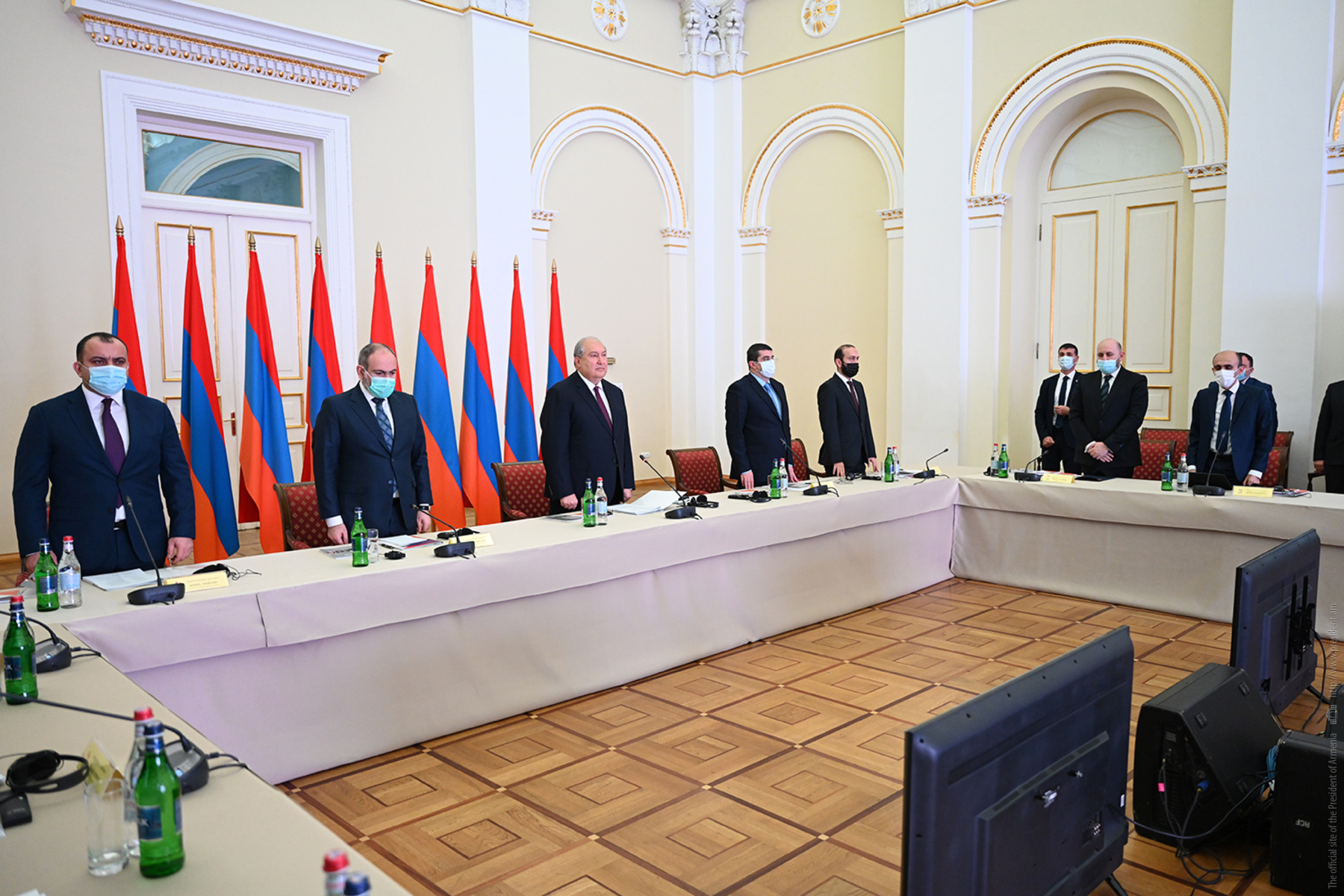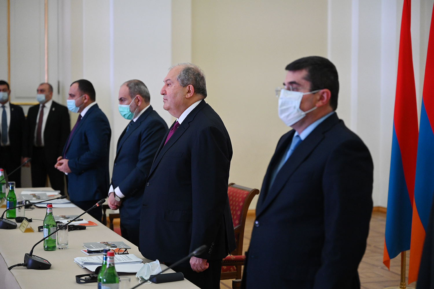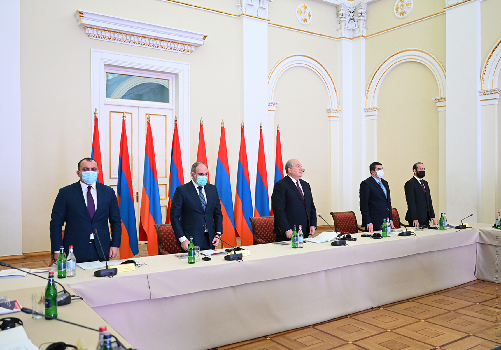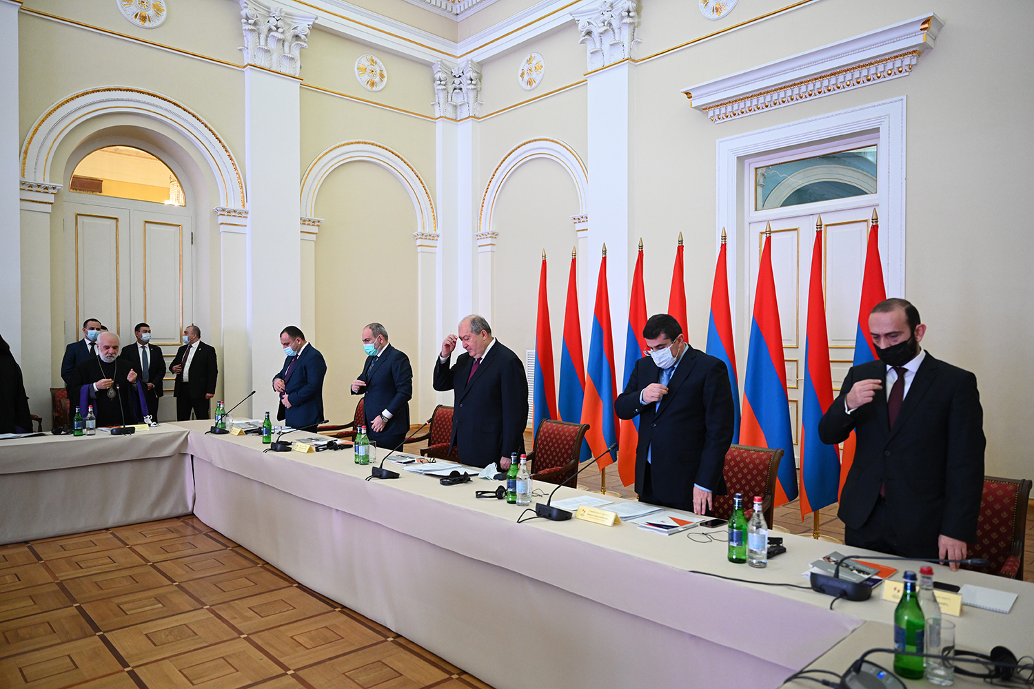 Բացելով նիստը՝ նախագահ Սարգսյանը նշել է, որ այն անցկացվում է փորձություններով ու մարտահրավերներով լի բարդ ժամանակահատվածում՝ ի դեմս Ադրբեջանի կողմից Արցախի դեմ սանձազերծած պատերազմի, Հայաստանի ինքնիշխան տարածքի հանդեպ ռազմական ագրեսիայի, ինչպես նաև համավարակի հետևանքների: «Ցավոք, ունենք կորուստներ, անհետ կորածներ, գերեվարվածներ,- ասել է նախագահը: -Առաջարկում եմ մեկ րոպե լռությամբ հարգել հայրենիքի անվտանգության և պաշտպանության համար զոհվածների և համավարակի հետևանքով մահացած մեր հայրենակիցների հիշատակը՝ ևս մեկ անգամ ցավակցելով նրանց ընտանիքներին ու հարազատներին...