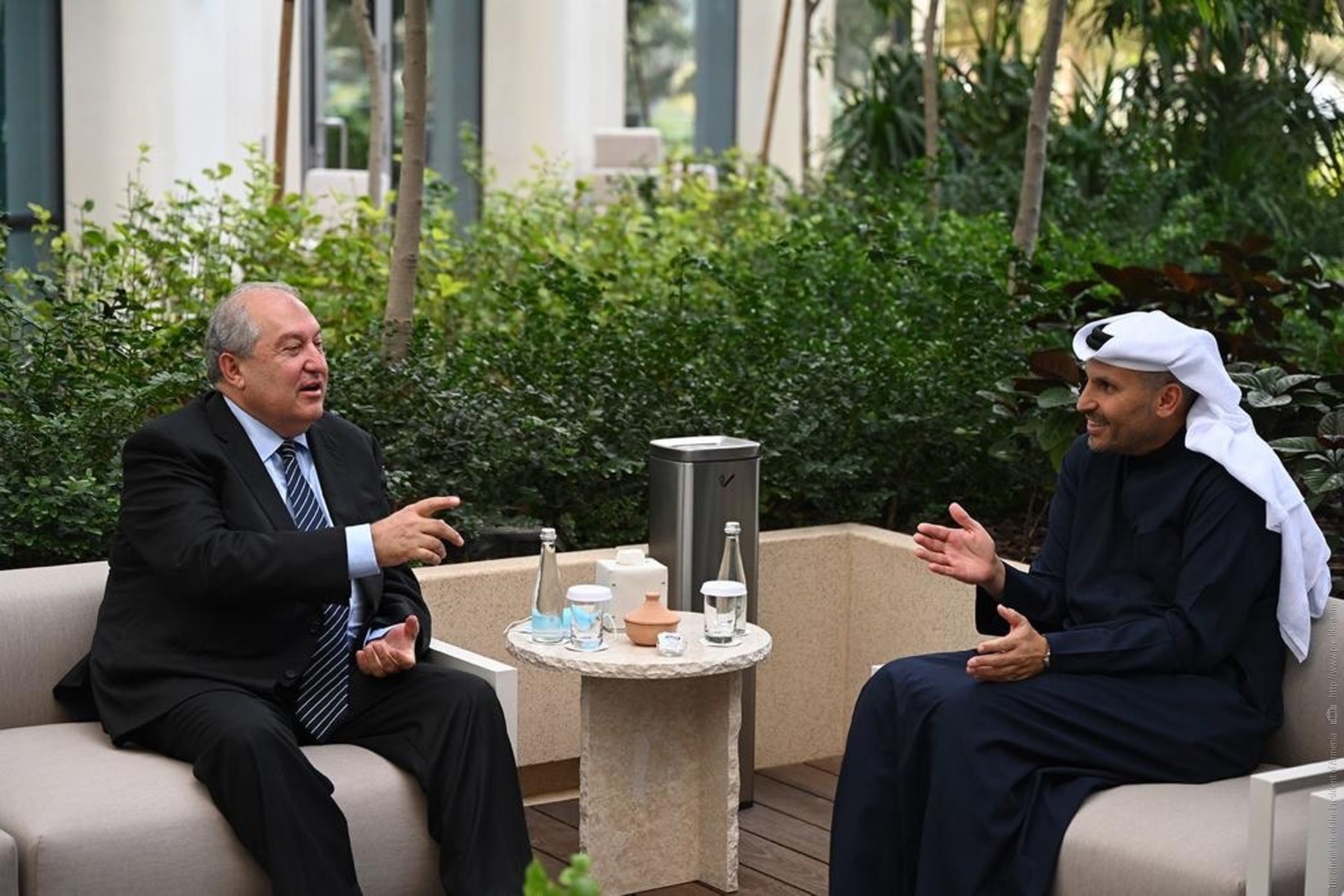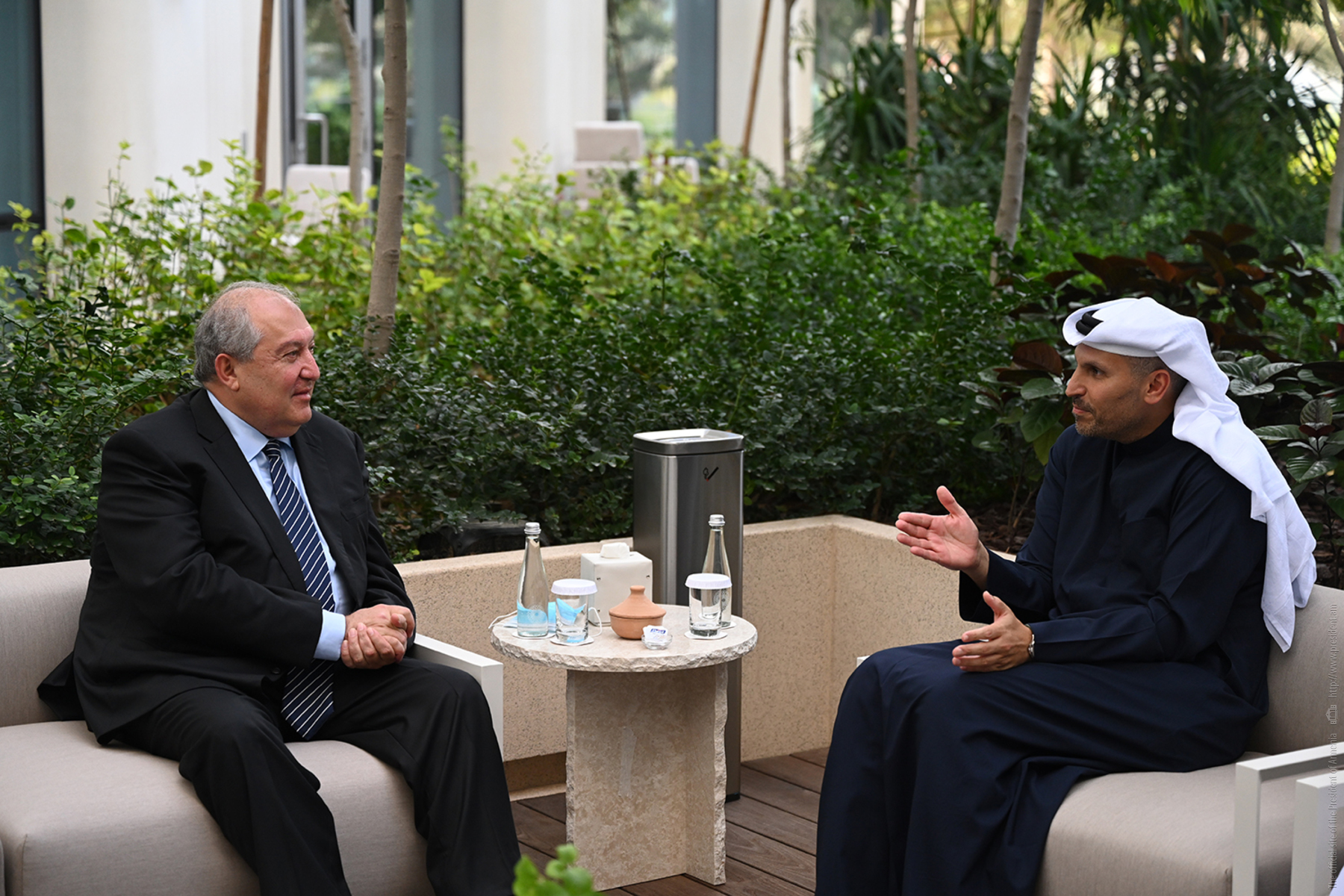 Աշխատանքային այցով Արաբական Միացյալ Էմիրություններում գտնվող՝ Հայաստանի Հանրապետության նախագահ Արմեն Սարգսյանն այսօր հանդիպել է «Մուբադալա» ներդրումային ընկերության գործադիր տնօրեն Քալդուն Խալիֆա Ալ Մուբարաքի հետ։
