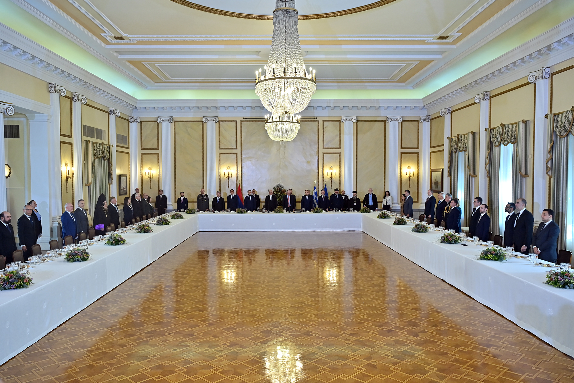Թույլ տվեք բարձրացնել բաժակն ի պատիվ Հունաստանի Հանրապետության նախագահի և բարեկամ հույն ժողովրդի, հանուն Հայաստանի և Հունաստանի միջև դարավոր բարեկամության և ամուր գործընկերության, հանուն մեր ժողովուրդների խաղաղ, անվտանգ և բարեկեցիկ ապագայի»։
