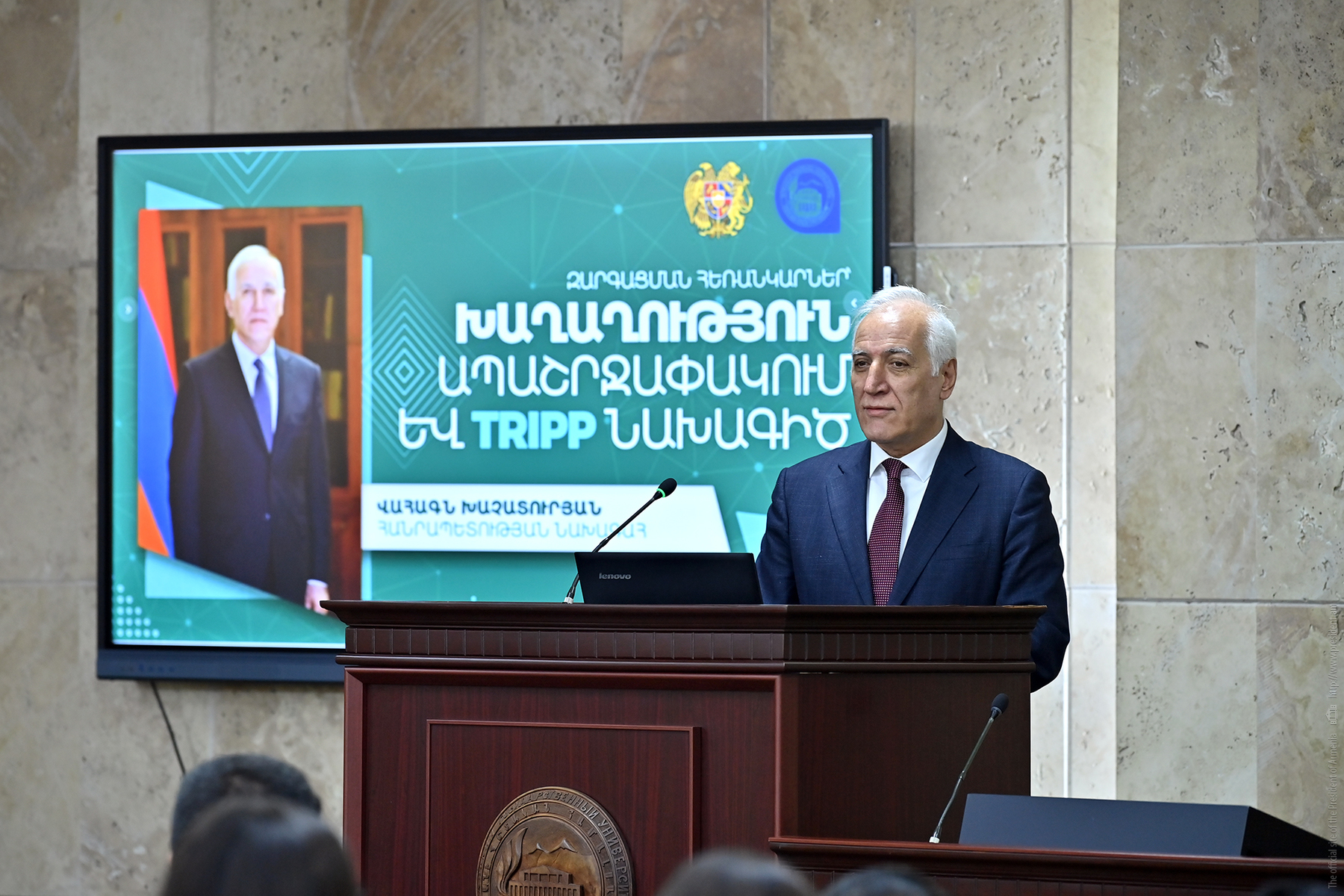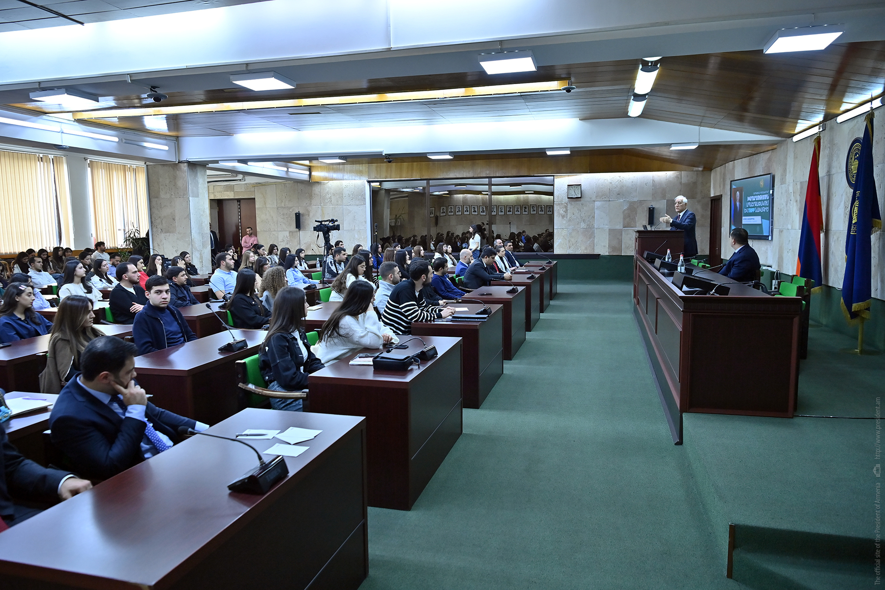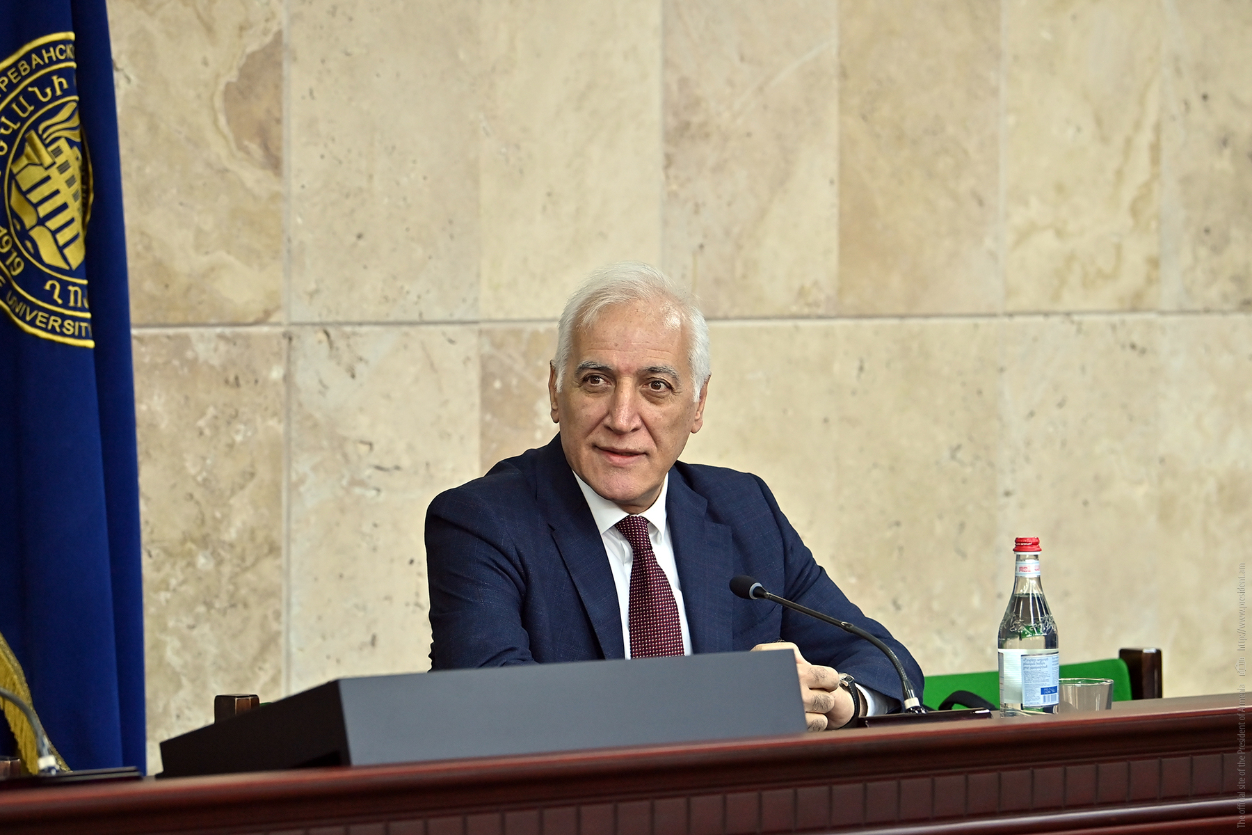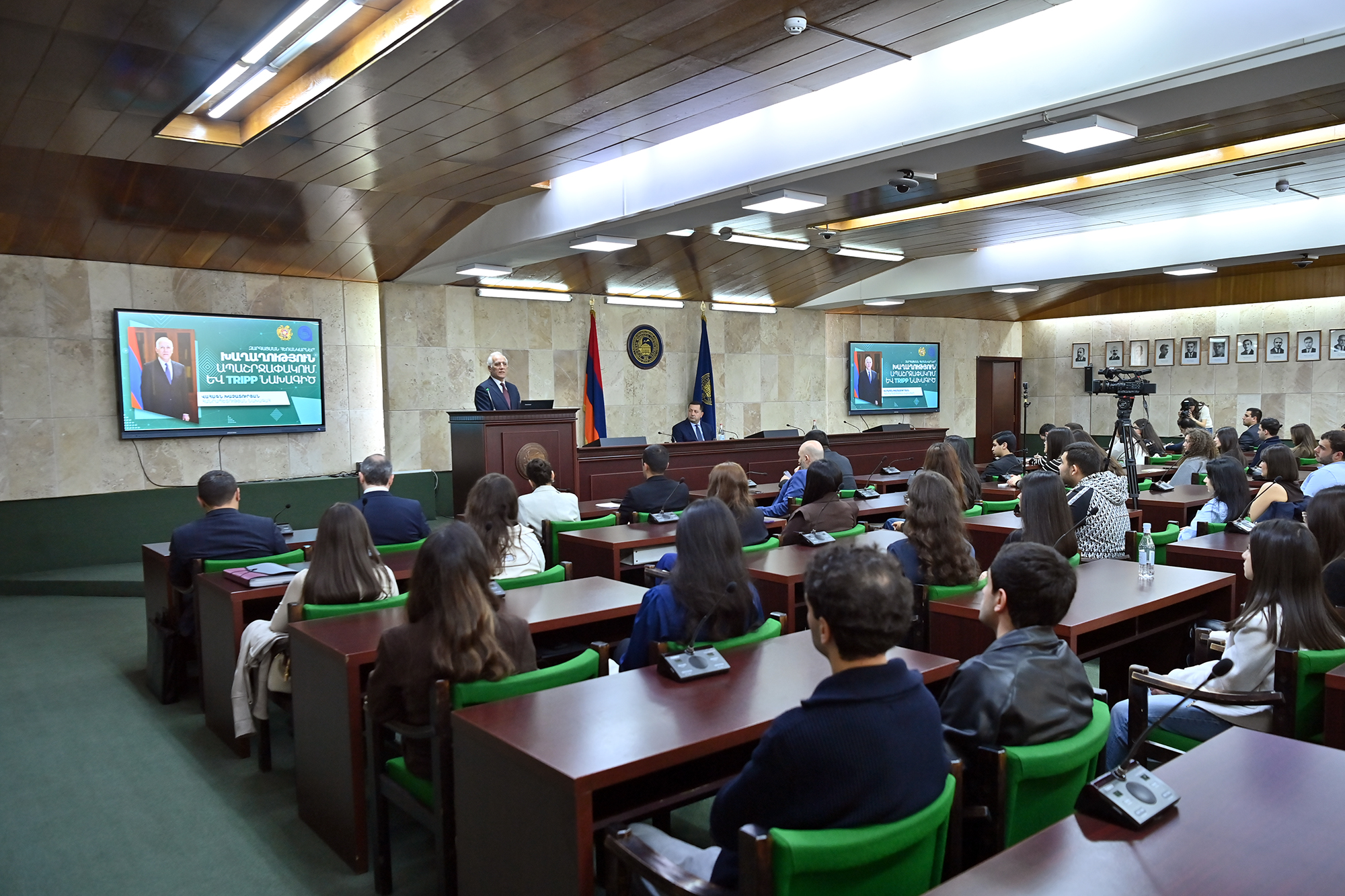 Հանրապետության նախագահ Վահագն Խաչատուրյանն այցելել է Երևանի պետական համալսարան, որտեղ հանդիպել է ուսանողների հետ և հանդես եկել բանախոսությամբ՝ «Զարգացման հեռանկարներ, խաղաղություն, ապաշրջափակում և «TRIPP» նախագիծ» խորագրով։