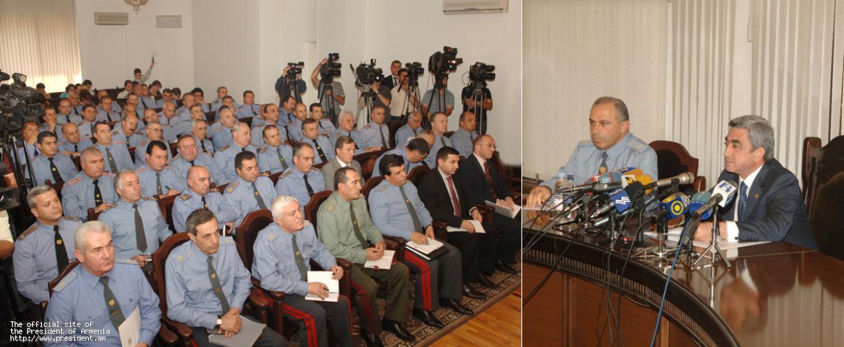 Այսօր հրավիրել եմ այս խորհրդակցությունը մի շարք կարեւոր հիմնախնդիրների անդրադառնալու համար, որոնք անմիջականորեն առնչվում են ձեր գործունեությանը, վերաբերում են մեր երկրում ոստիկանության դերին, նշանակությանն ու անելիքներին: Այս հարցերը հիմա առավել քան արդիական են: Կարծում եմ, սրանում որեւէ մեկը չի կասկածում: