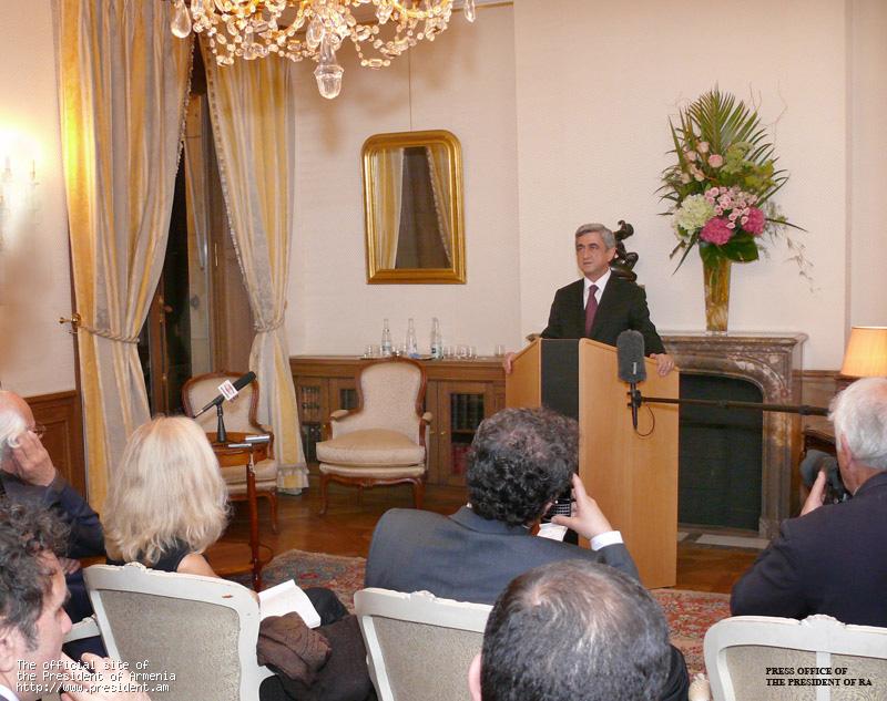 Вечером в тот же день Президент Республики провел встречу с прибывшими в Париж из различных европейских армянонаселенных общин представителями организаций и структур Диаспоры, выступил с речью. В своем выступлении Президент Саргсян коснулся основных точек зрения и проявлений озабоченности, озвученных за этот период в кругах Армении и Диаспоры относительно парафированных протоколов и процесса урегулирования армяно-турецких отношений.