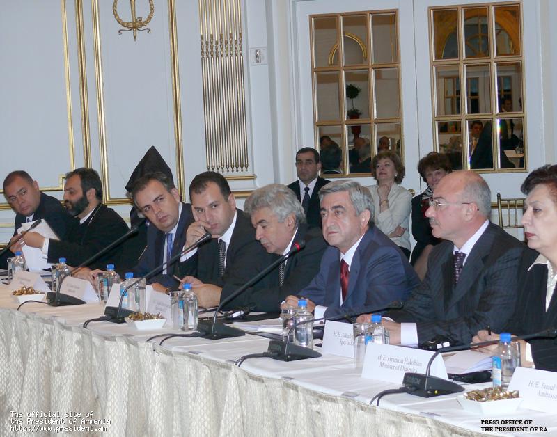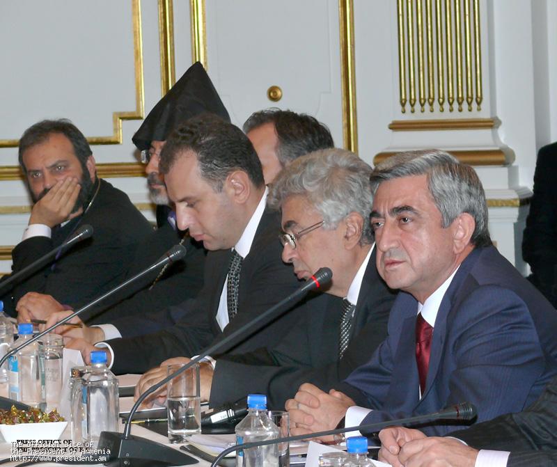 Как и во время остальных встреч, имевших место в ходе панармянского турне, Президент Республики выступил с вступительным словом, в котором обстоятельно коснулся процесса урегулирования армяно-турецких отношений и парафированных протоколов, предоставляемых документами возможностей, основных существующих беспокойств, выслушал точки зрения участников встречи относительно проблемы, ответил на их вопросы.