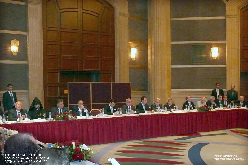 После выступления Президента Саргсяна развернулся заинтересованный обмен мнений относительно процесса урегулирования отношений Армения - Турция. Все участники встречи получили возможность высказать точки зрения - свои и тех организаций и структур, которые они представляли - относительно парафированных документов и процесса урегулирования отношений с Турцией. Участники встречи подчеркивали, что независимо от различных подходов к процессу урегулирования отношений Армения-Турция, армянская Диаспора, как единство, всегда была и готова быть рядом с Родиной-Матерью, быть поддержкой Армении и Арцаху.