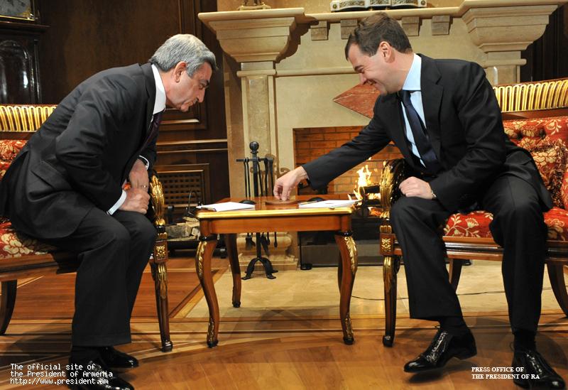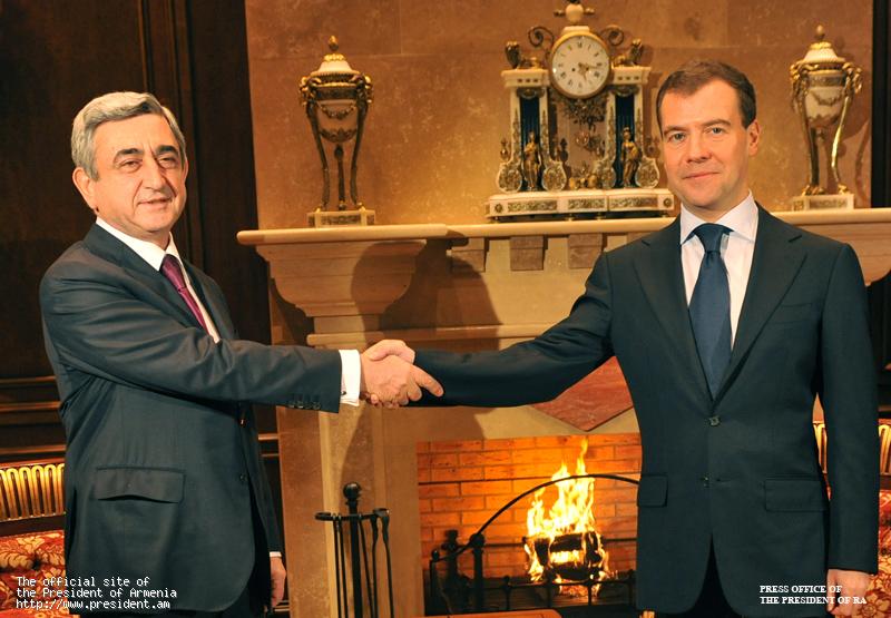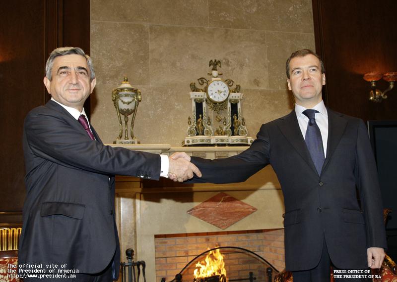 В начале встречи, приветствуя Сержа Саргсяна в своей подмосковной резиденции, Президент РФ Дмитрий Медведев отметил, что встречи глав двух государств носят регулярный характер. Президент России сказал, что в 2008 году они встречались семь раз и в прошлом году тоже состоялось не меньше семи встреч, выразив радость по поводу того, что этот год также открывается такого рода встречей.
