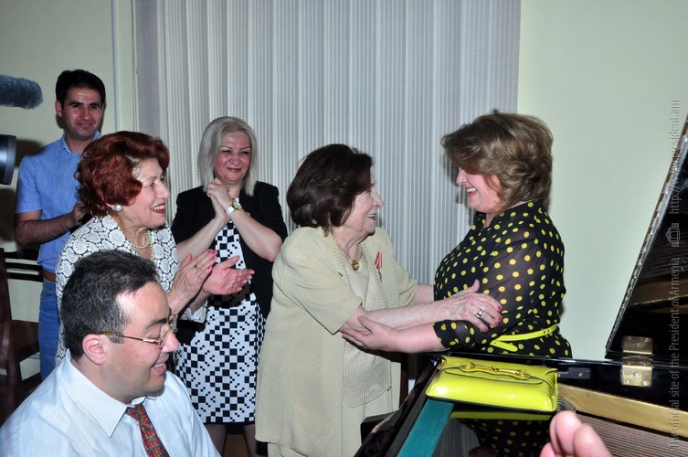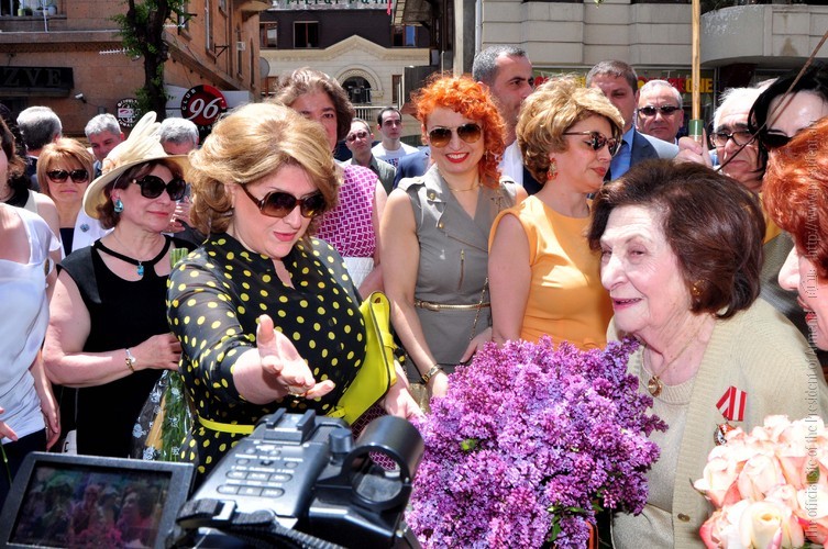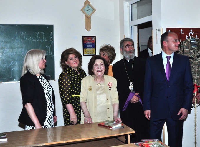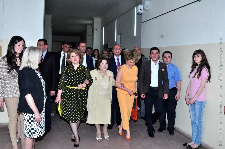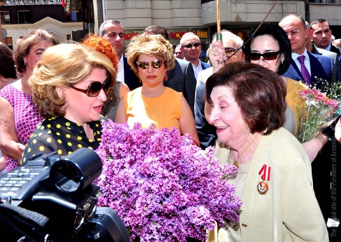 Первая леди Армении Рита Саргсян присутствовала на церемонии открытия мемориальной доски легендарного разведчика Геворка Варданяна у второго корпуса Ереванского лингвистического университета, на которой присутствовала и вдова разведчика Гоар Варданян.