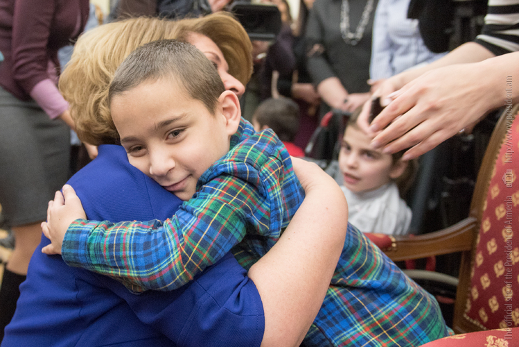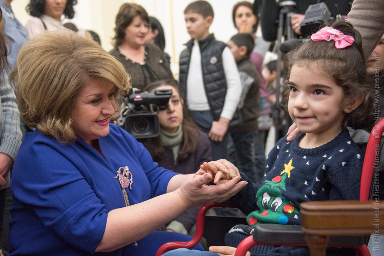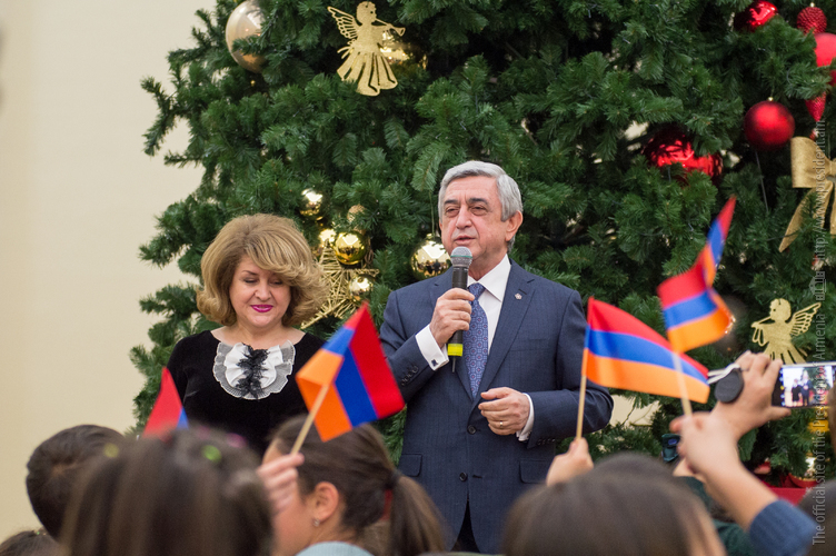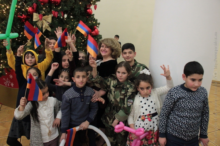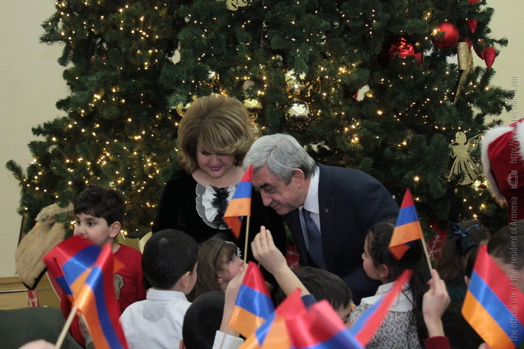 Президент Серж Саргсян и госпожа Рита Саргсян в резиденции Президента в связи с наступающими праздниками Нового года и святого Рождества сегодня приняли детей и внуков из семей военнослужащих ВС РА; солдат, которые погибли или стали инвалидами в Арцахской освободительной войне, а также в Апрельской четырёхдневной войне; членов Союза ополченцев-добровольцев "Еркапа"; сотрудников Полиции РА и Службы национальной безопасности РА; членов ряда сотрудничающих с Министерством обороны РА общественных организаций, в том числе из Нагорно-Карабахской Республики.