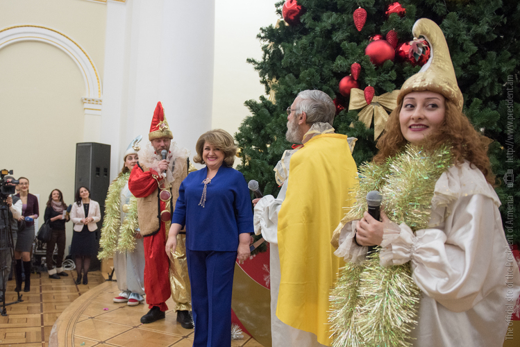 В присутствии маленьких гостей торжественно зажглись огни новогодней ёлки и началось в праздничное мероприятие. Президент Республики от своего имени и от имени госпожи Риты Саргсян сердечно поздравил участников мероприятия и всех детей с праздниками Нового года и Святого Рождества, пожелал им всего наилучшего.