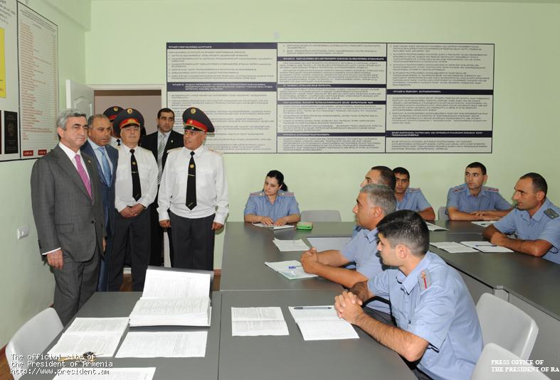 В учебном центре полиции, основной задачей которого является подготовка и переподготовка кадров, проводятся учебные занятия по начальной подготовке и переподготовке служащих как младшего, так и среднего командного состава. Серж Саргсян обошел учебный центр, который в последние годы был отремонтирован и переоснащен также при активном содействии ереванского представительства ОБСЕ.
