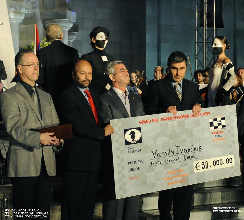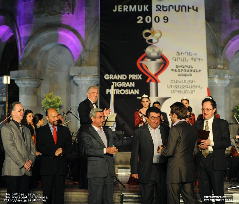 Затем Президент Республики, сын Тиграна Петросяна Вардан Петросян и руководители ФИДЕ вручили призы и памятные подарки трем первым призерам турнира «Гран-при» ФИДЕ «Джермук 2009».